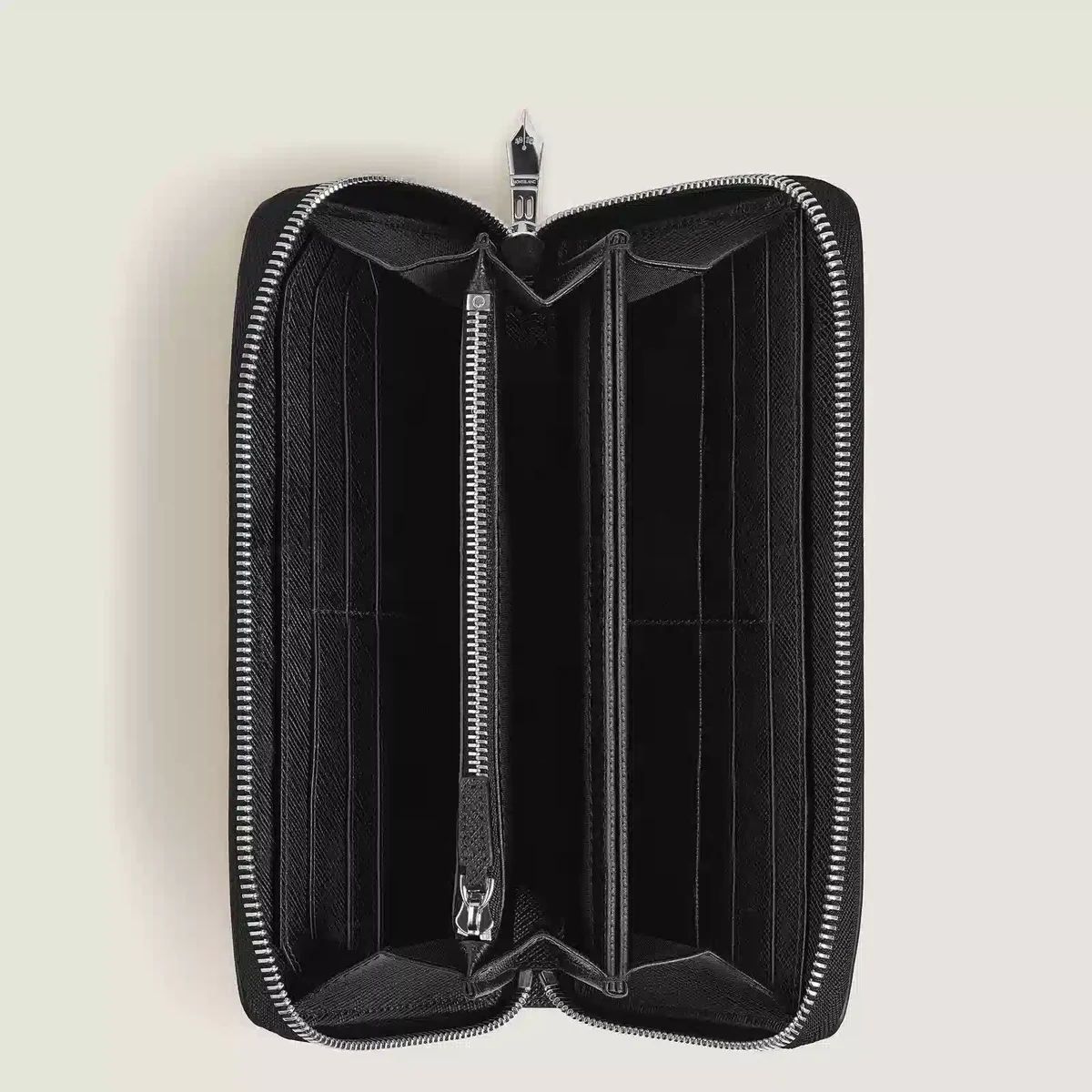 Diese Geldbörse aus geprägtem Sartorial-Leder in klassischem Schwarz verbindet Funktionalität mit raffiniertem Design. Mit ihrem markanten Metallreißverschluss in Form einer Feder ist sie eine Hommage an die Tradition der Schreibkunst von Montblanc. Im Inneren bietet die Brieftasche Platz für bis zu 12 Kreditkarten, drei Fächer für Banknoten, ein sicheres Münzfach mit Reißverschluss und drei zusätzliche Fächer für kleinere Gegenstände.