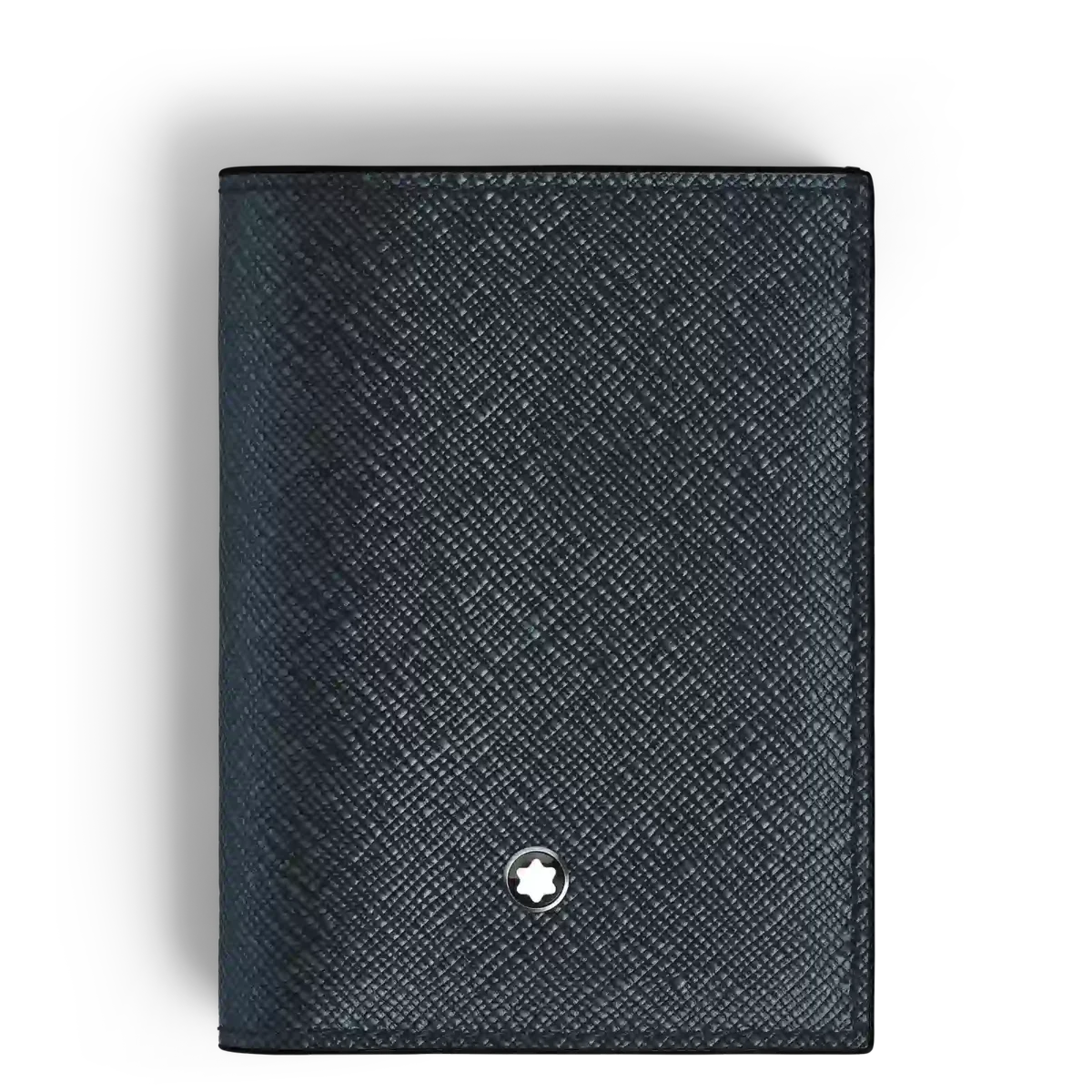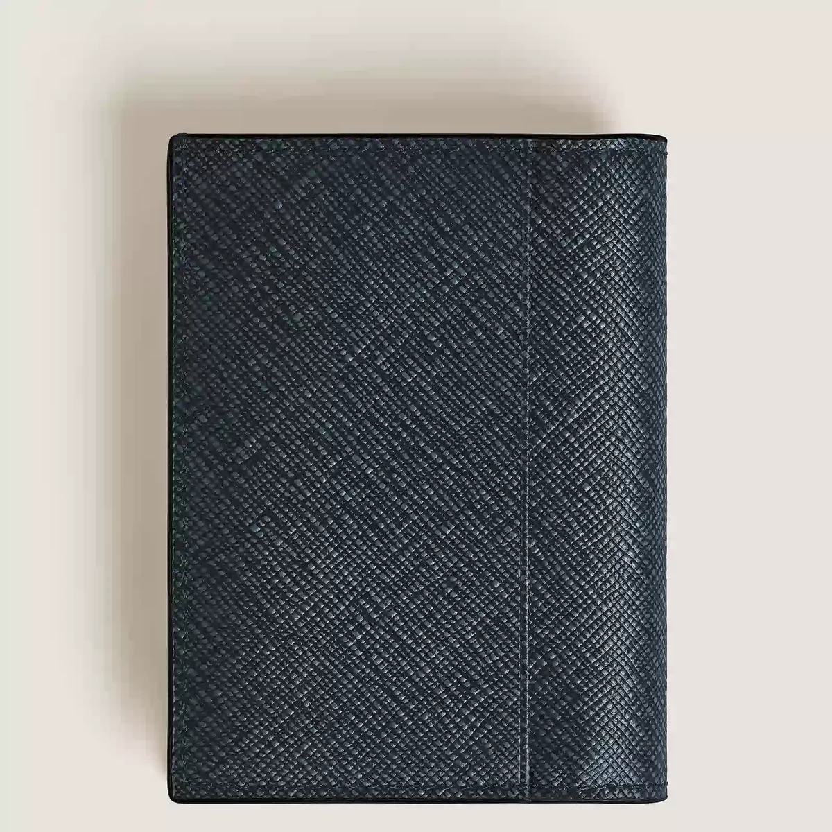 Diese kompakte und stilvolle Mini-Brieftasche ist aus geprägtem Leder in einer eleganten Kombination aus Blau und Schwarz gefertigt. Sie ist ideal für alle, die gerne mit leichtem Gepäck reisen. Ihre schlanke Silhouette offenbart drei Kreditkartenfächer, ein Geldscheinfach und zwei zusätzliche Taschen, sodass Sie alle wichtigen Dinge bequem und stilvoll mitnehmen können.