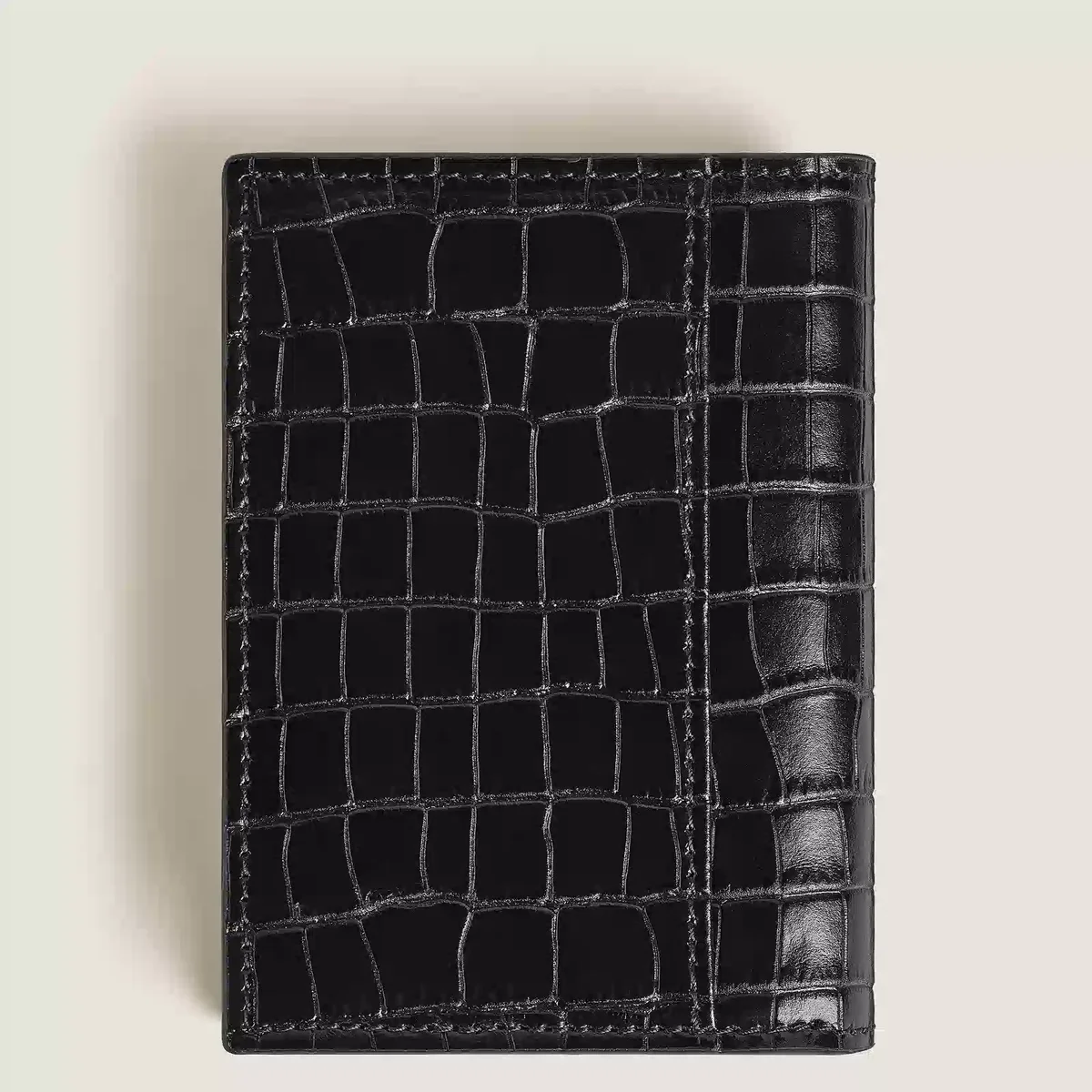 Veredeln Sie Ihre täglichen Transaktionen mit diesem Kartenetui aus stilvollem schwarzem Leder mit Krokodilprägung für einen auffälligen und eleganten Look. Die Außenseite verfügt über ein praktisches Kreditkartenfach für den schnellen Zugriff auf Ihre am häufigsten verwendete Karte, während die Innenseite drei zusätzliche Kreditkartenfächer, ein spezielles Fach für Visitenkarten und ein zusätzliches Fach für Quittungen oder andere kleine Utensilien enthält.
