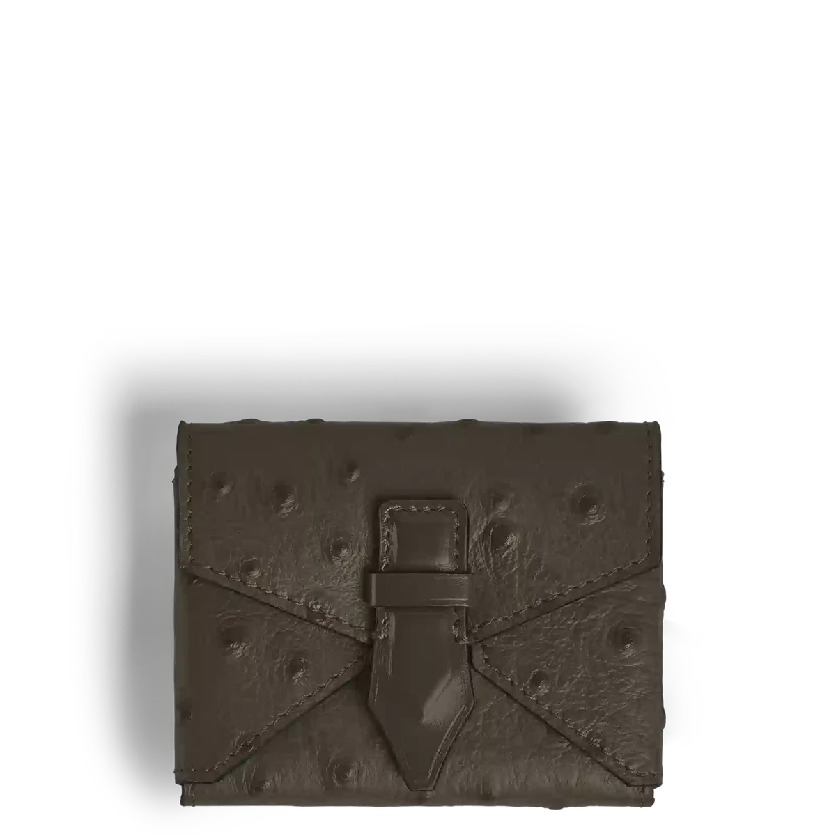 Dieser elegante Kartenhalter aus luxuriösem khakifarbenem Leder mit Straußenprägung kombiniert eine unverwechselbare Textur mit Alltagstauglichkeit. Er verfügt über einen abnehmbaren Handgelenkgriff für vielseitige Trageoptionen und ist für die Aufbewahrung von Karten und Kleingeld konzipiert. Mit seinem charakteristischen Druckknopfverschluss in Form einer Feder ist dieses kompakte Accessoire eine stilvolle Mischung aus Raffinesse und Funktionalität.