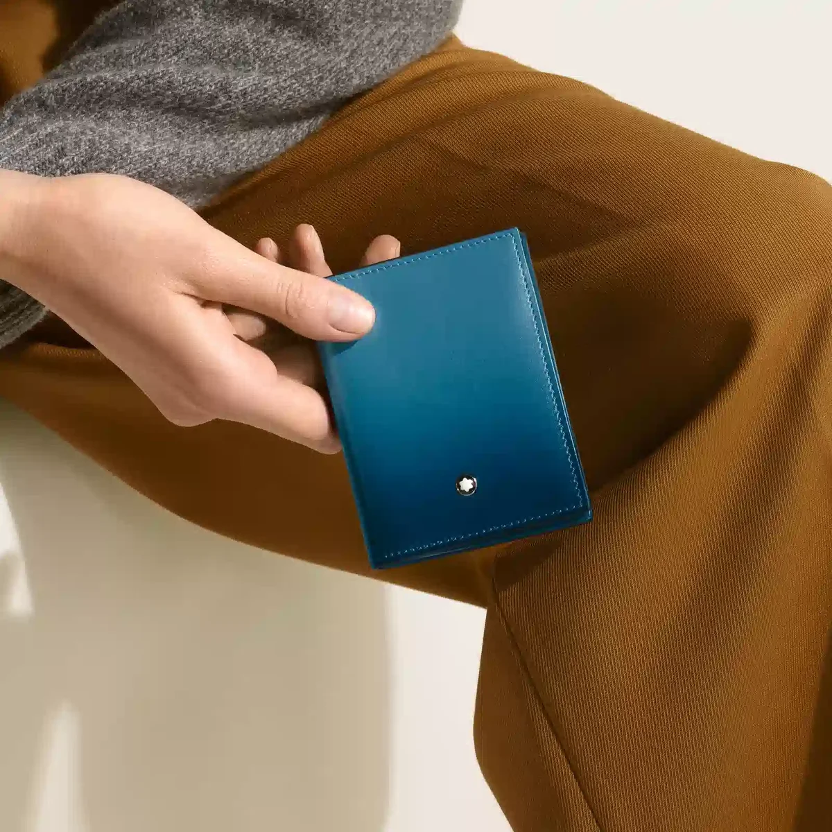 Dieser raffinierte Kartenhalter wurde als Begleiter für den Alltag entworfen und verfügt über ein Fach für Visitenkarten sowie vier Kreditkartenfächer. Das Accessoire ist aus luxuriösem rauchblauem Leder mit einem manuell aufgebrachten Sfumato-Effekt gefertigt und mit dem Montblanc Emblem auf der Vorderseite verziert.