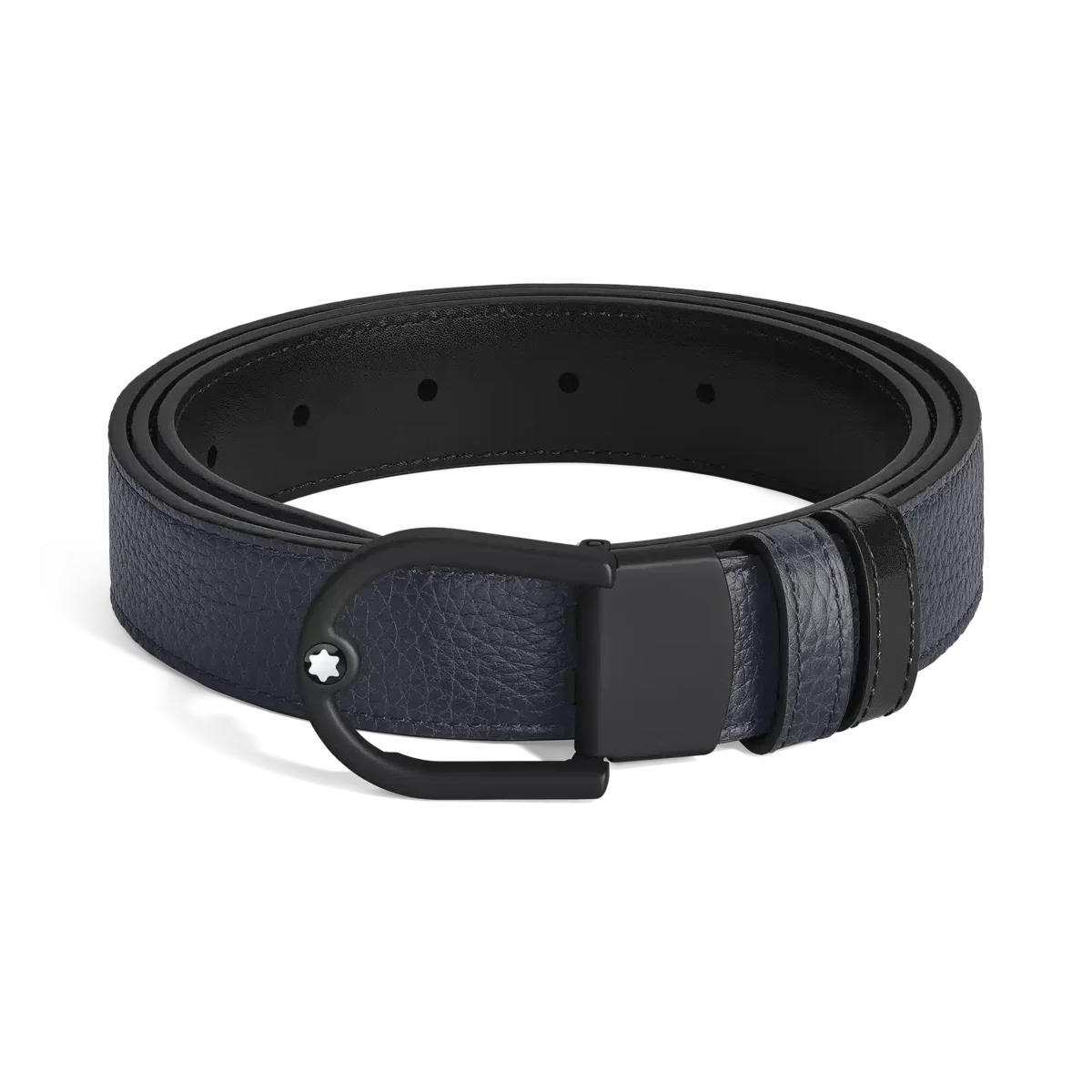 Dieser wendbare 30-mm-Gürtel kombiniert die elegante Silhouette einer gummierten PVD-beschichteten Schnalle mit der Vielseitigkeit zweier unterschiedlicher Lederriemen. Mit ihren klaren, geschwungenen Linien verleiht die Hufeisenschnalle Ihrem Stil einen Hauch von moderner Eleganz. Der Gürtelriemen bietet Vielseitigkeit und raffinierten Stil und vereint zwei unterschiedliche Looks in einem Accessoire: Während eine Seite genarbtes Leder in einem tiefen Mitternachtsblau präsentiert, verfügt die Rückseite über elegantes schwarzes Meisterstück-Leder für ein zeitloses, poliertes Finish.