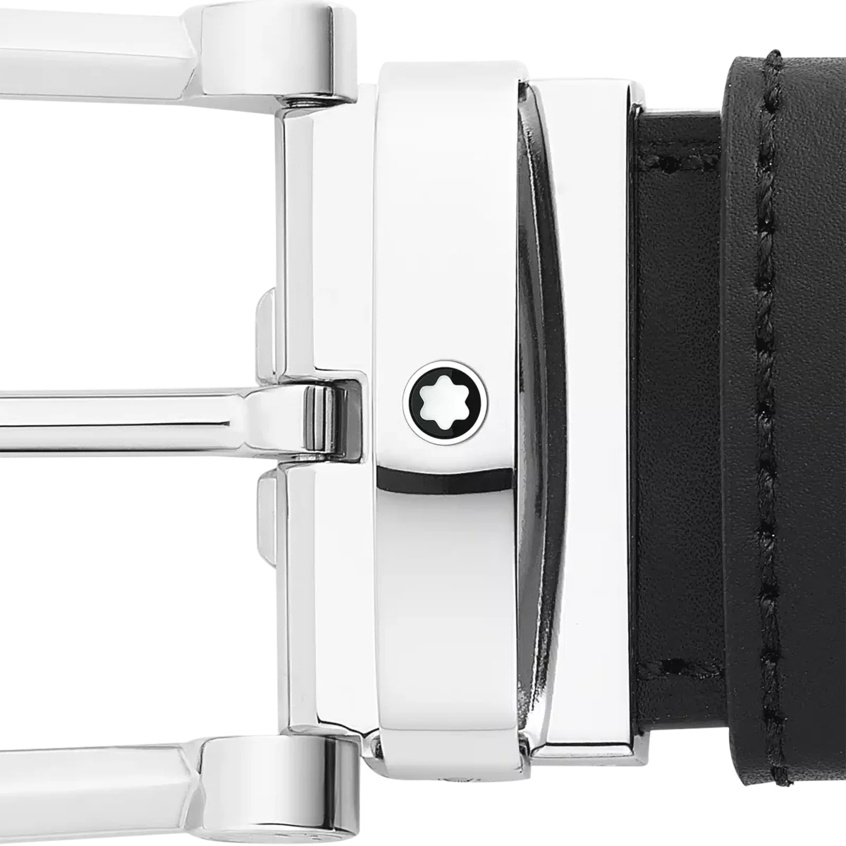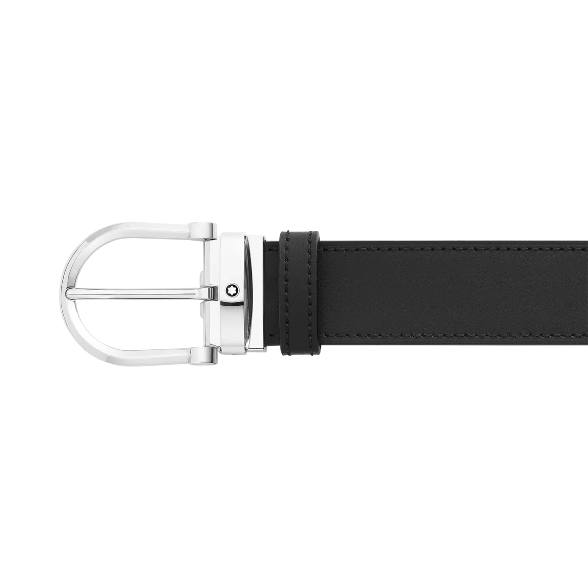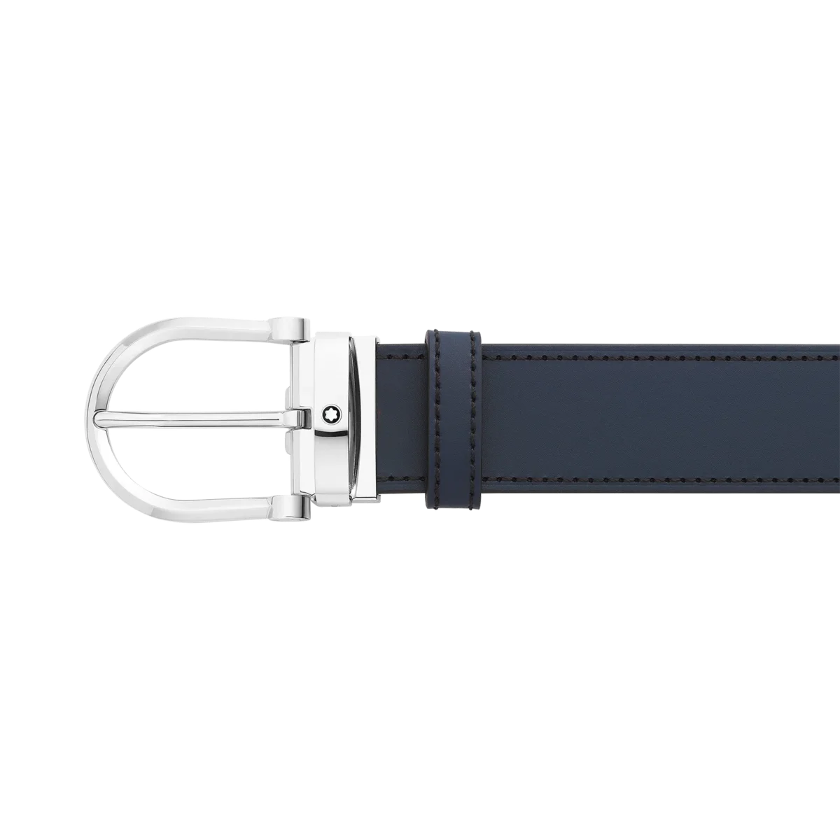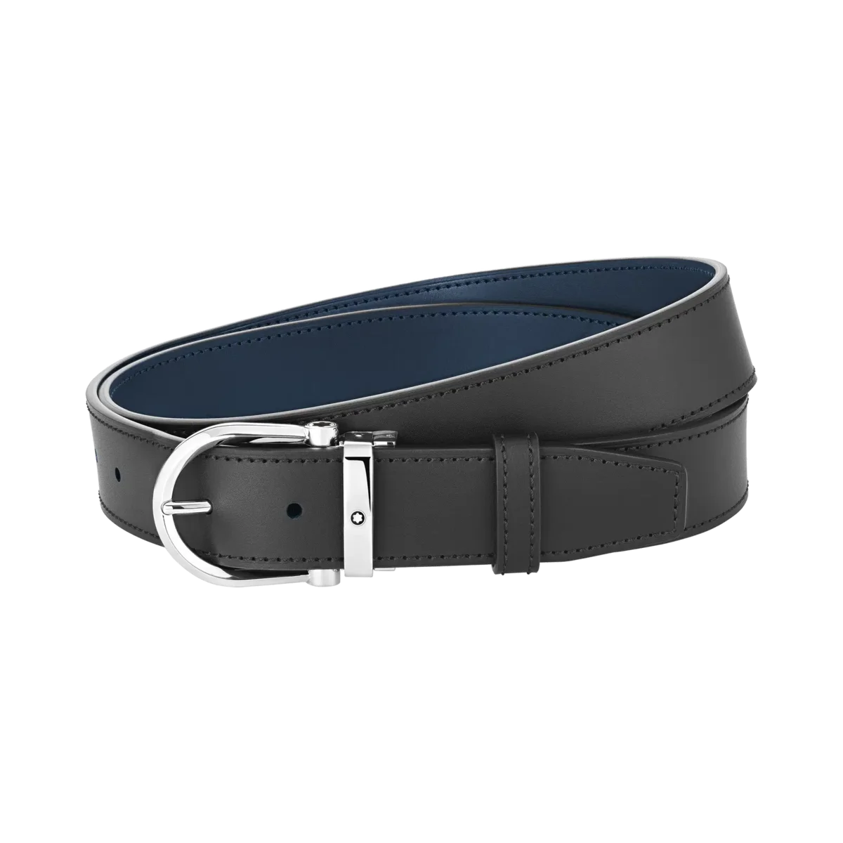 Entdecken Sie alle Details des Ledergürtels mit Hufeisen-Schnalle in Schwarz/Blau, 35 mm, wendbar. Kaufen Sie online im offiziellen Montblanc Store.