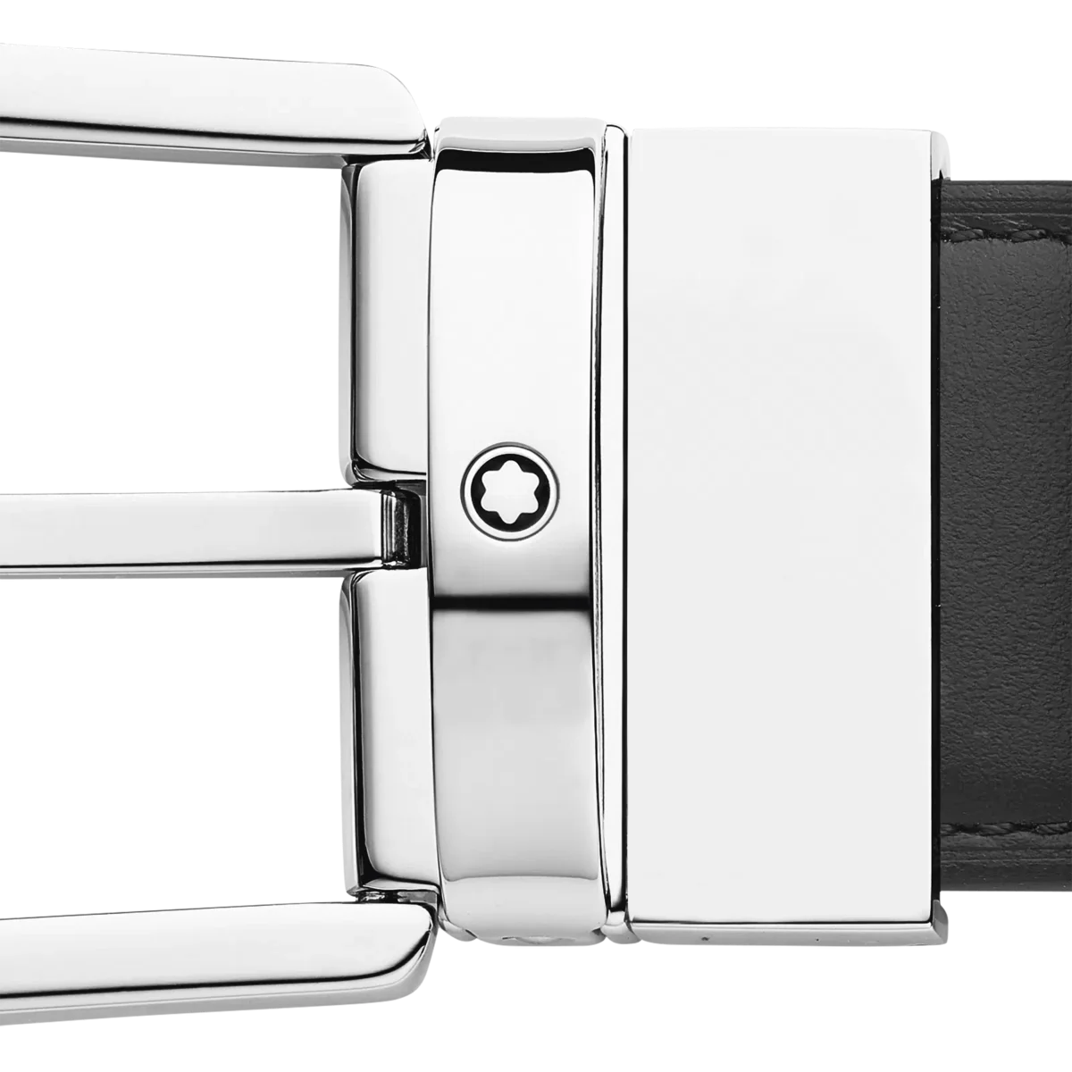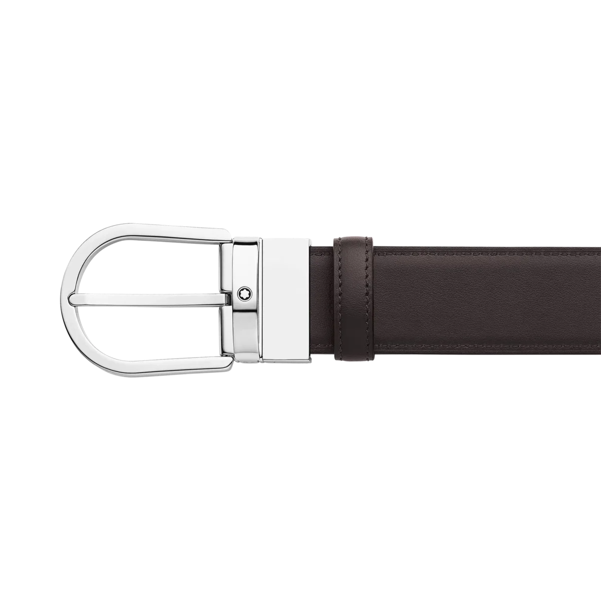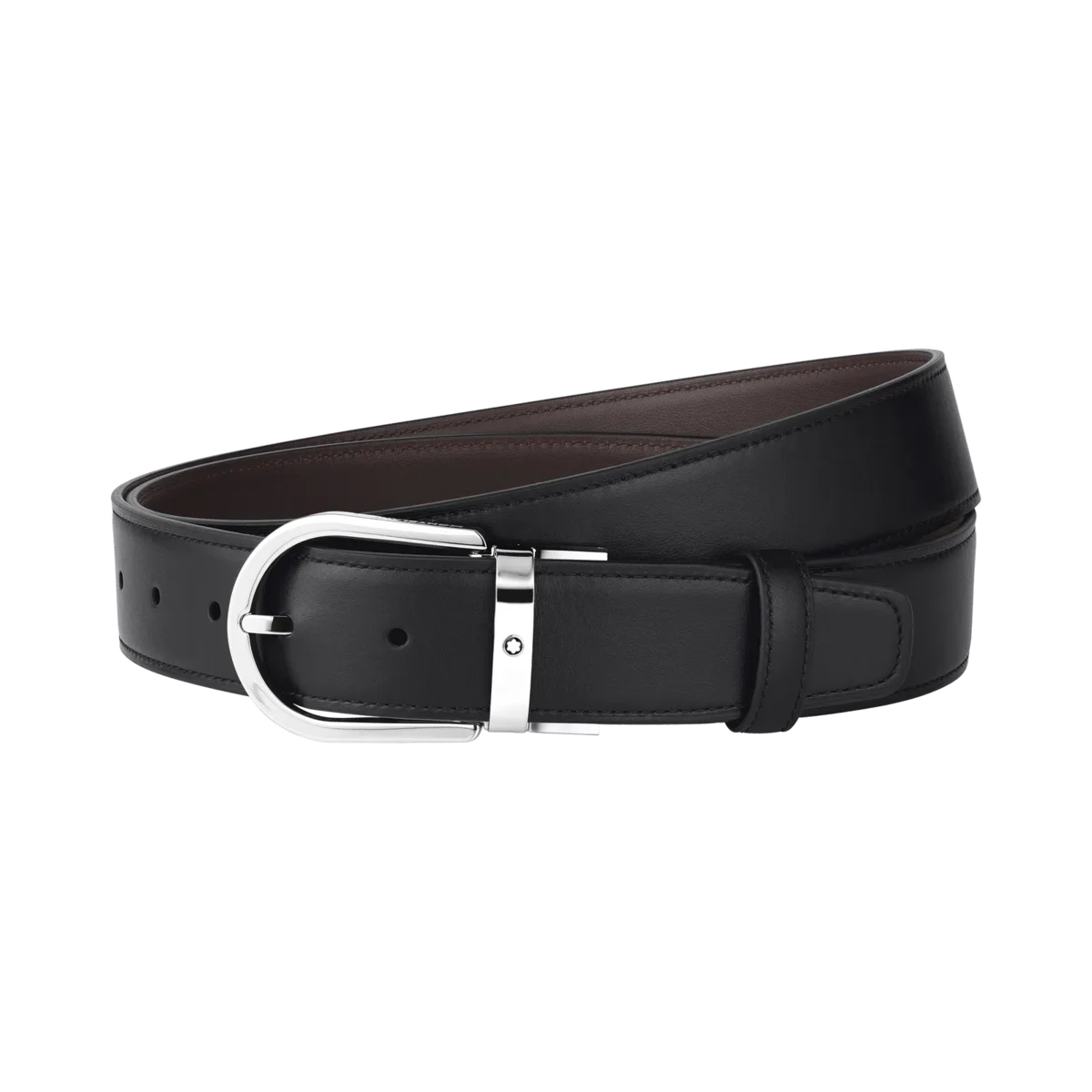 Glänzende Dornschließe mit Palladium-Finish in Hufeisenform. Selbstverstellbarer, 3,5 cm x 120 cm großer, wendbarer Lederriemen, auf der einen Seite schwarz und auf der anderen Seite dunkelbraun. Raffiniert und dezent, für jeden Look geeignet.
