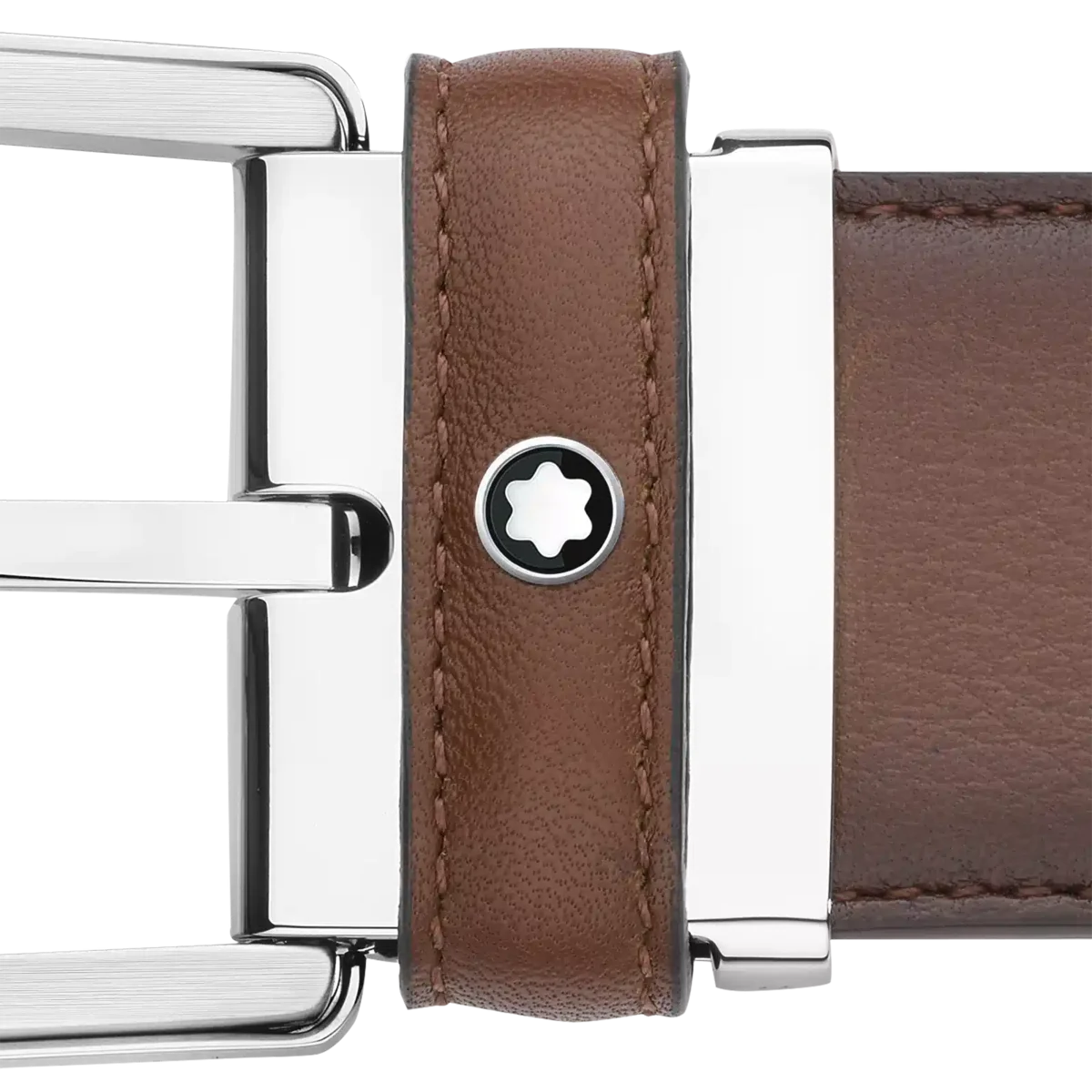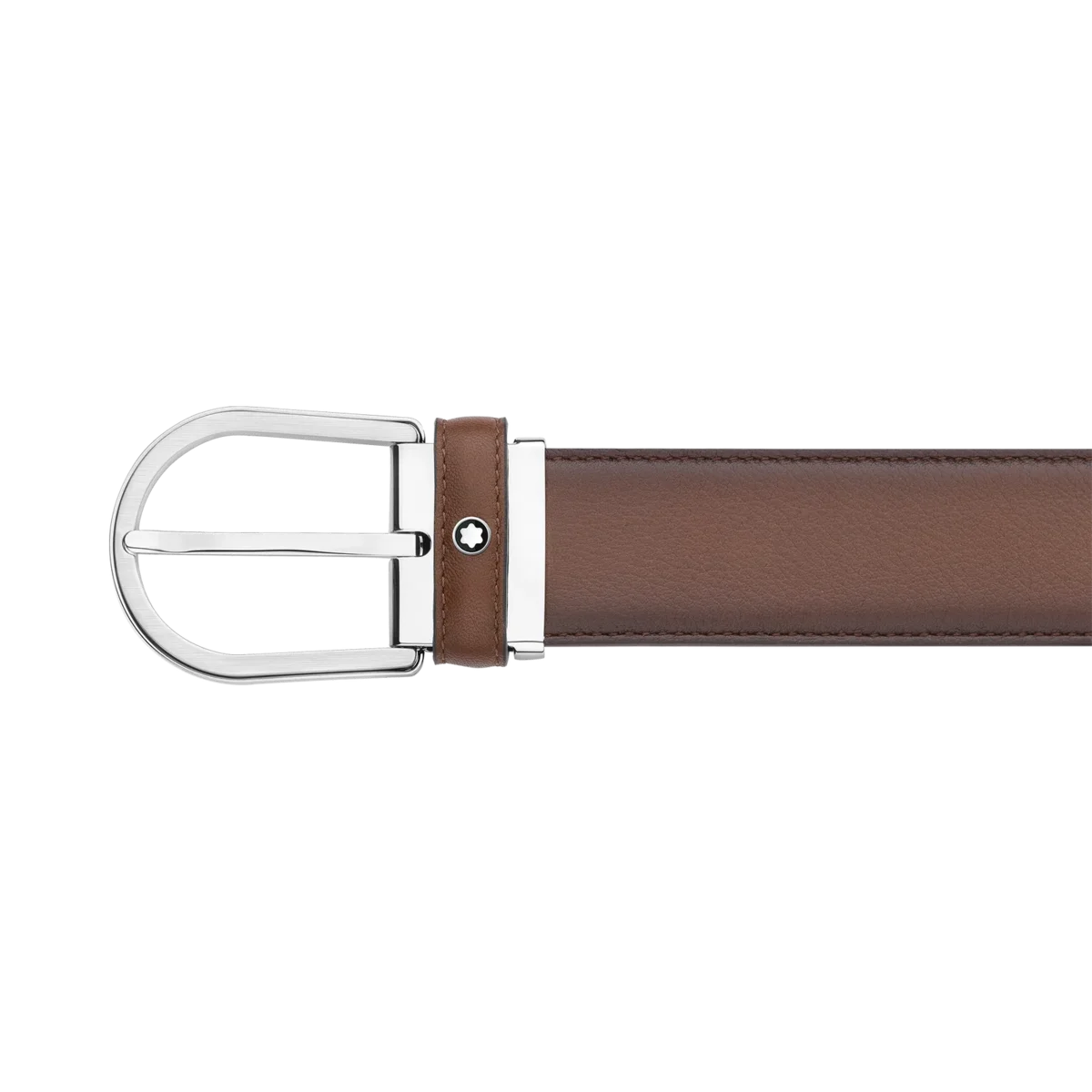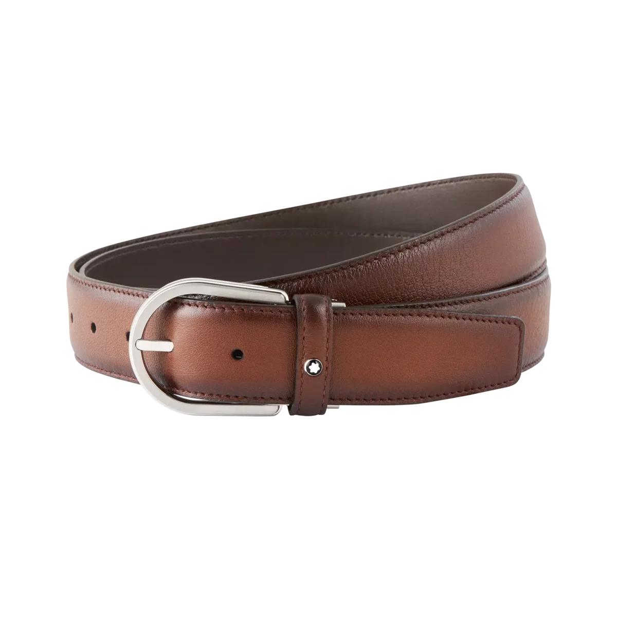 Glänzende & matte Edelstahl-Schnalle mit Hufeisenform. Selbstverstellbarer, 3,5 cm x 120 cm großer, brauner Lederriemen mit der einzigartigen Patina von handbemaltem Leder und zarten Farbverläufen.