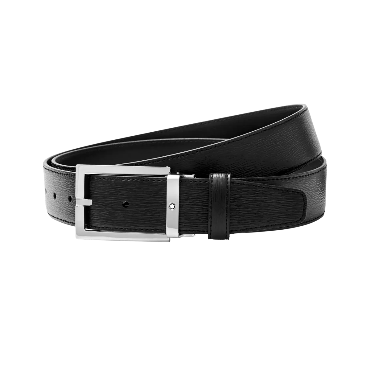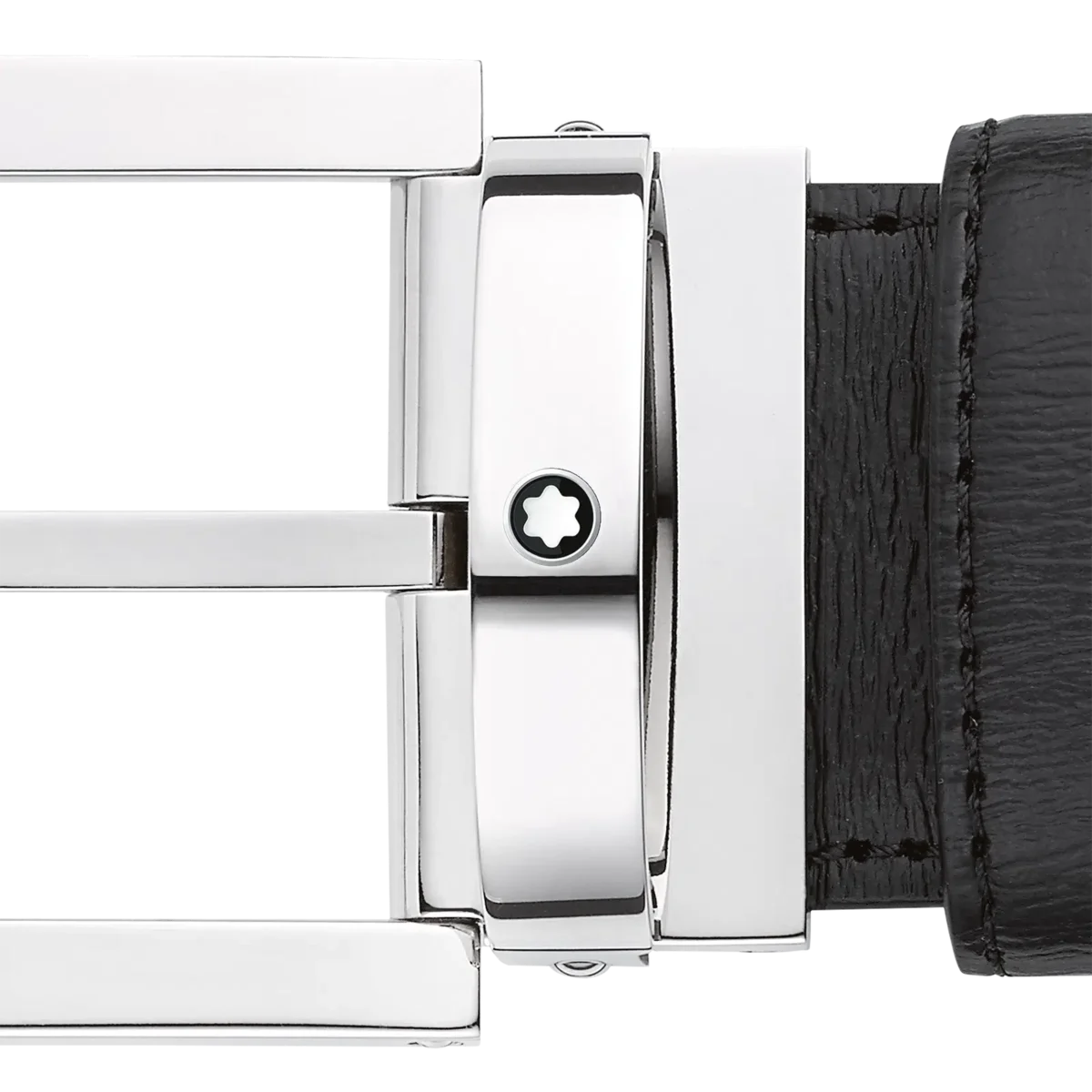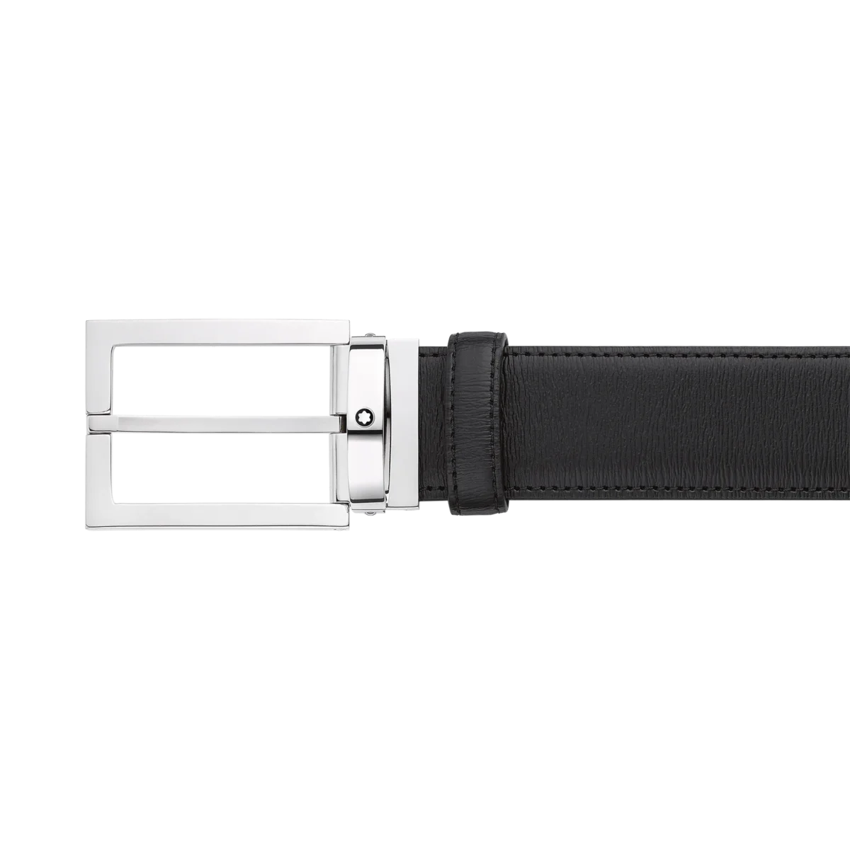 Rechteckige, glänzende Edelstahl-Dornschließe. Selbstverstellbares, 3,5 cm x 120 cm großes, schwarzes Westside-Lederarmband.