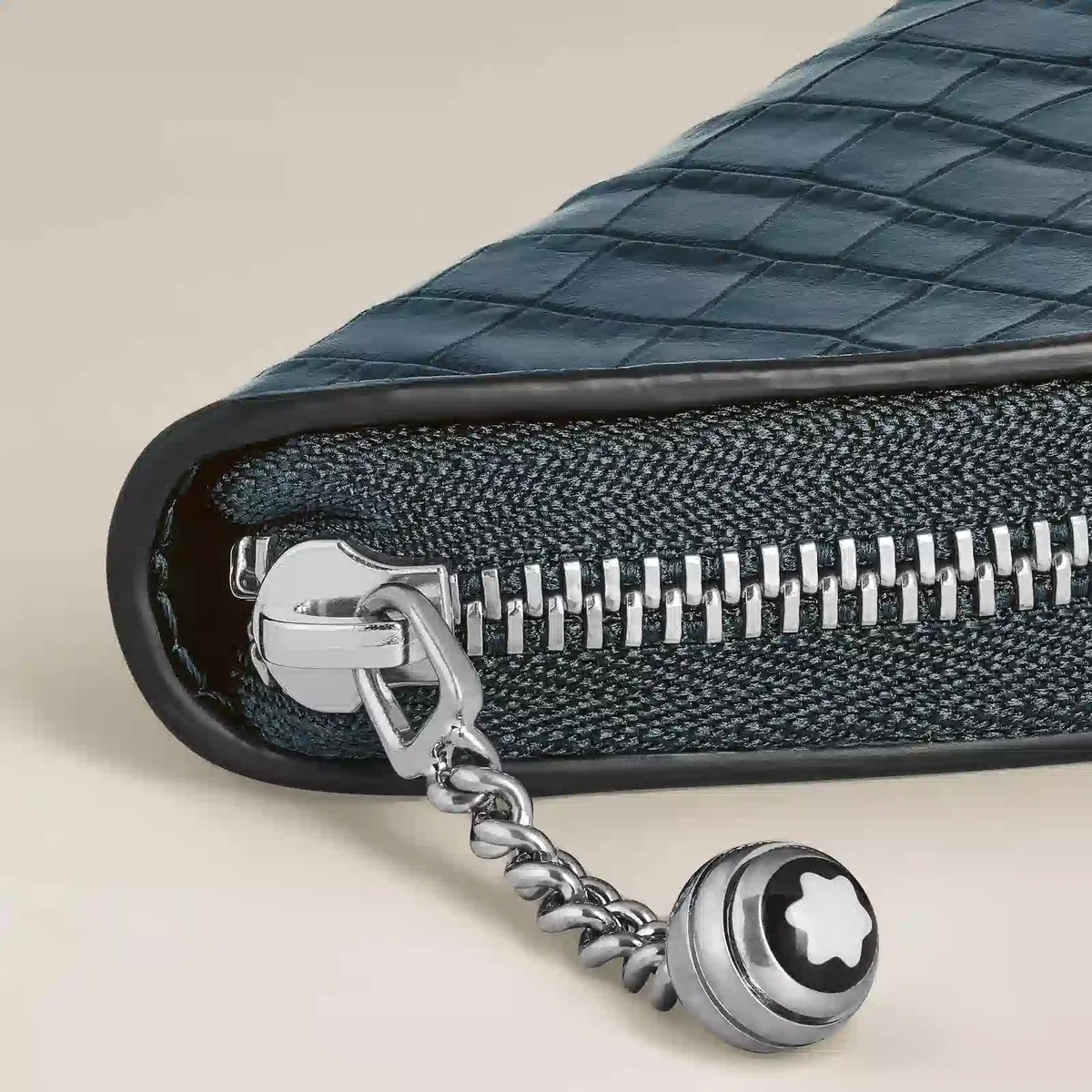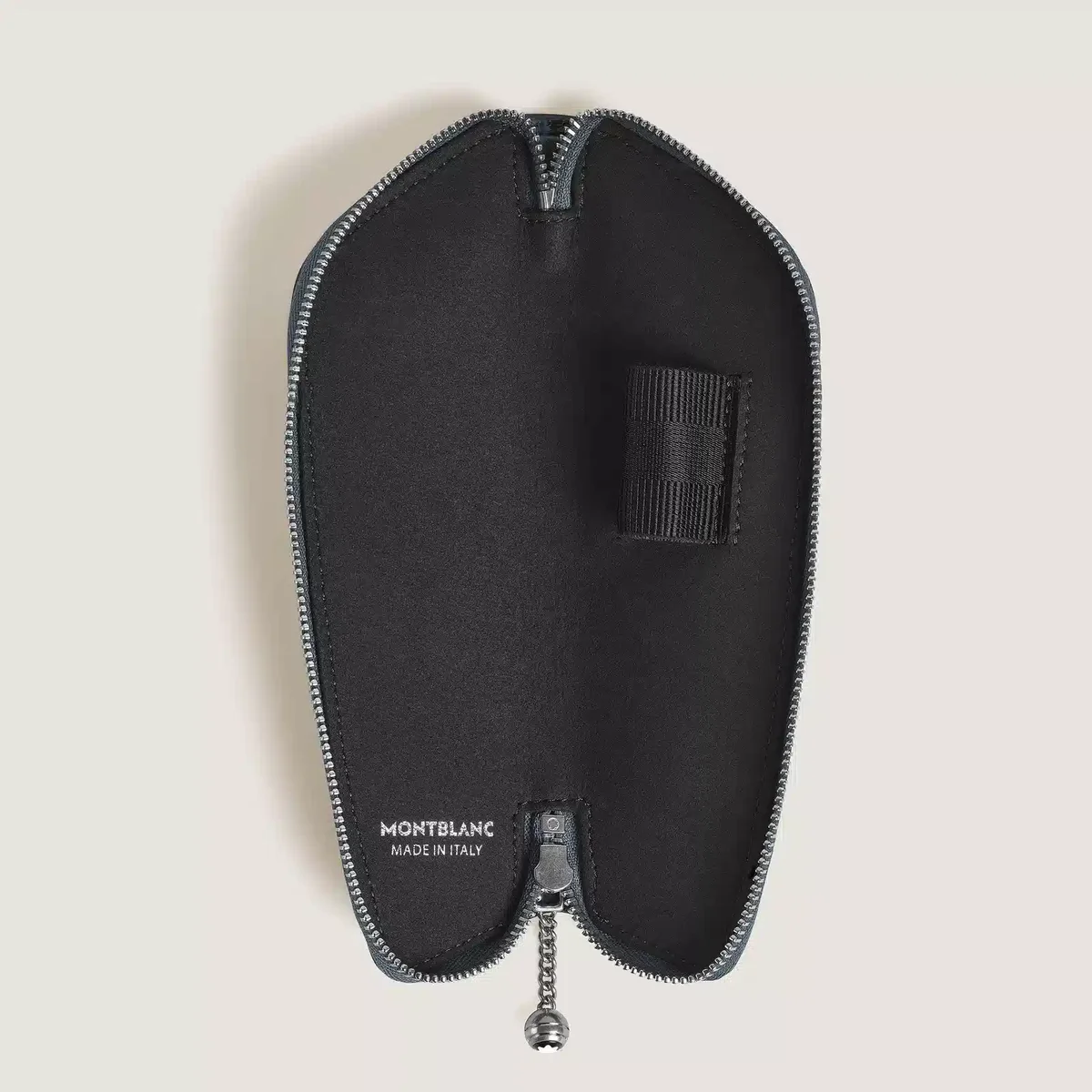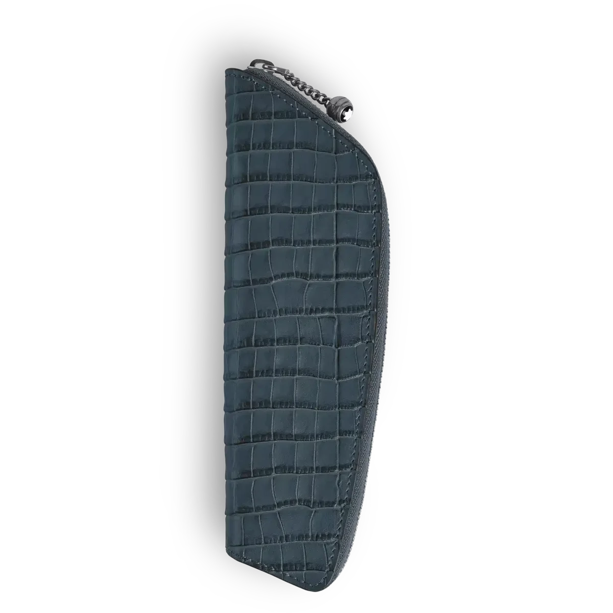 Die Stifttasche zelebriert das Erbe von Montblanc mit einem modernen Touch. Es ist aus blauem Samtleder mit Krokodilprägung gefertigt und verfügt über den charakteristischen Kettenreißverschluss mit kugelförmigem Emblem, der von einem historischen Montblanc-Stifttasche inspiriert ist, einer der ersten Lederkreationen der Marke. Diese elegante Tasche bietet Platz für ein Schreibgerät wie den Meisterstück Classique oder LeGrand und verbindet unverwechselbaren Stil mit Alltagstauglichkeit.