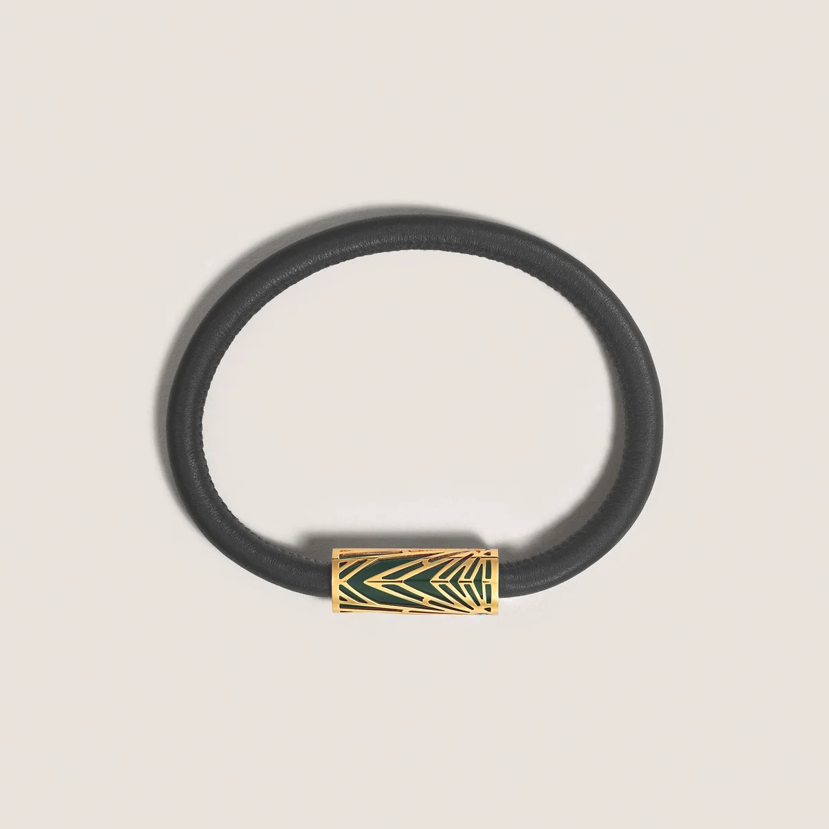 Das Schmuckstück verfügt über ein schwarzes Lederarmband und ein Rohr aus Edelstahl mit PVD-Beschichtung und grüner Lackierung (Größe 63). Es ist vom Archivmuster Solitaire inspiriert.