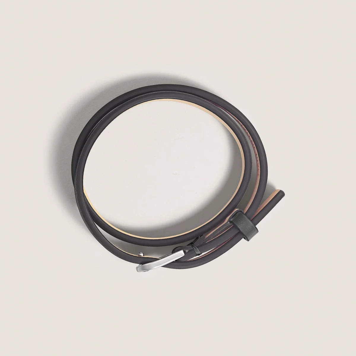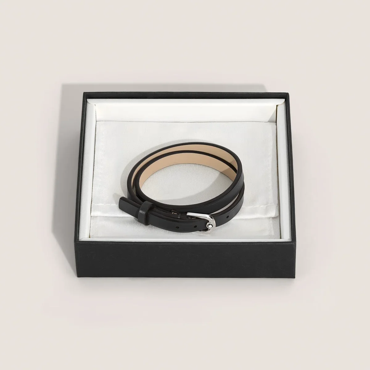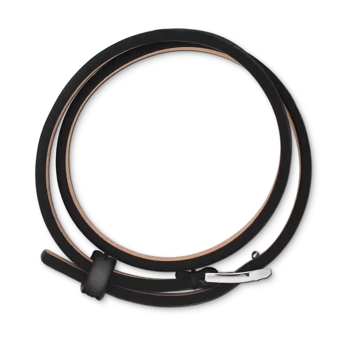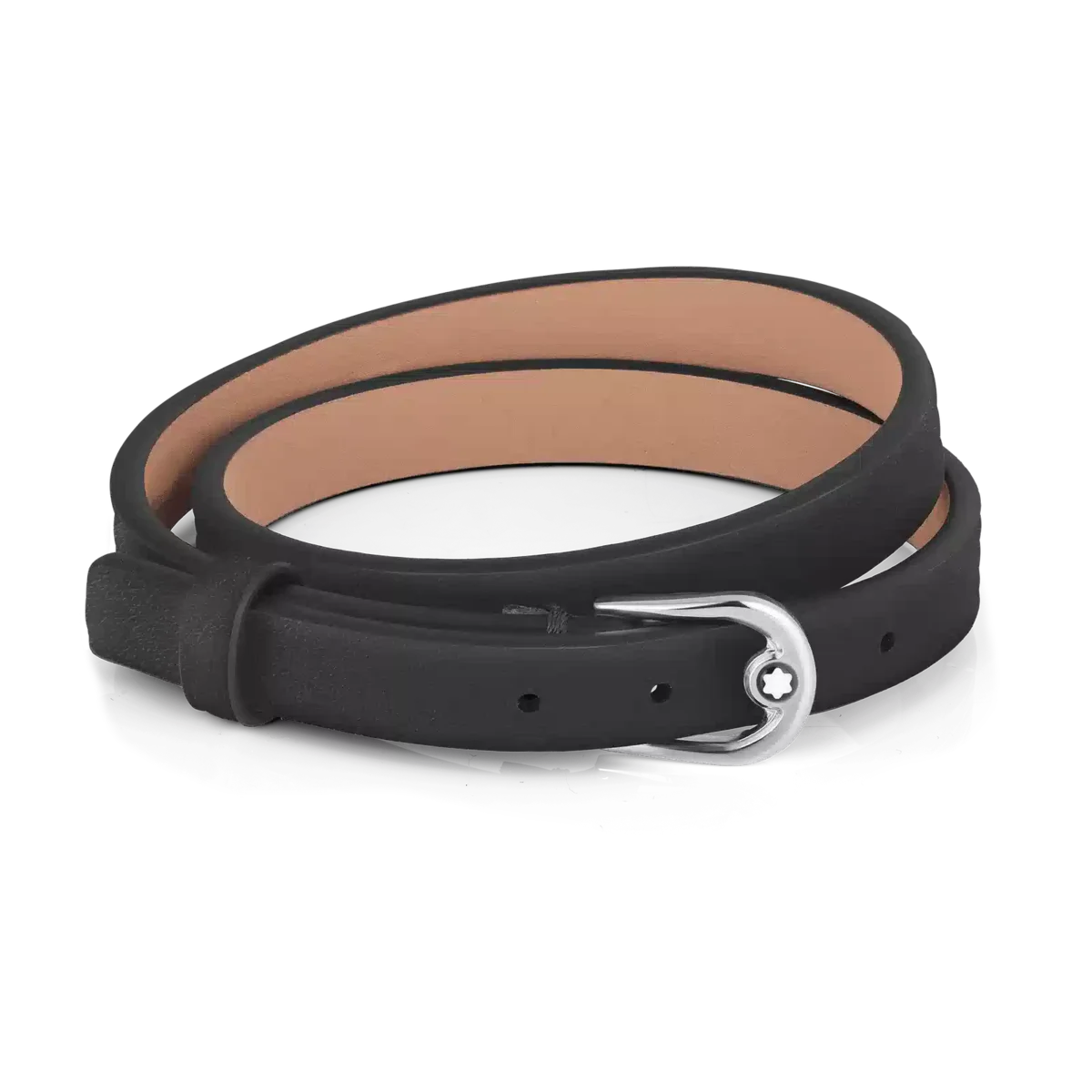 Dieses exquisite Schmuckstück ist von der Eleganz eines fein gearbeiteten Gürtels inspiriert und verbindet nahtlos Funktionalität und Schönheit, um Sie mit einem Hauch von zeitloser Raffinesse zu schmücken. Das Armband hat einen schwarzen Lederriemen und einen Verschluss aus Edelstahl. Die Größe ist verstellbar.