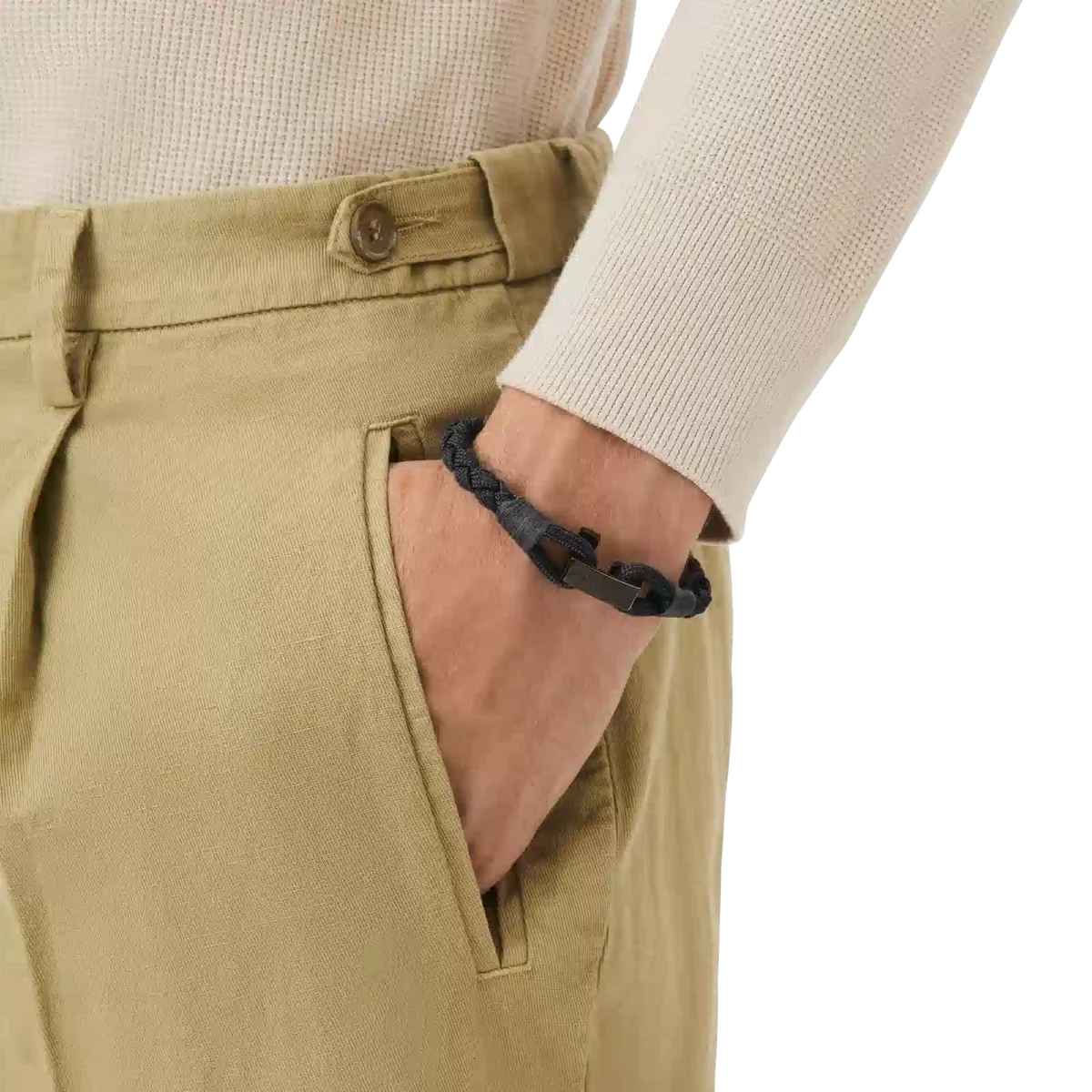 Das Schmuckstück hat ein Armband aus schwarzem Nylon und einen T-Hakenverschluss aus Edelstahl mit schwarzer PVD-Beschichtung.