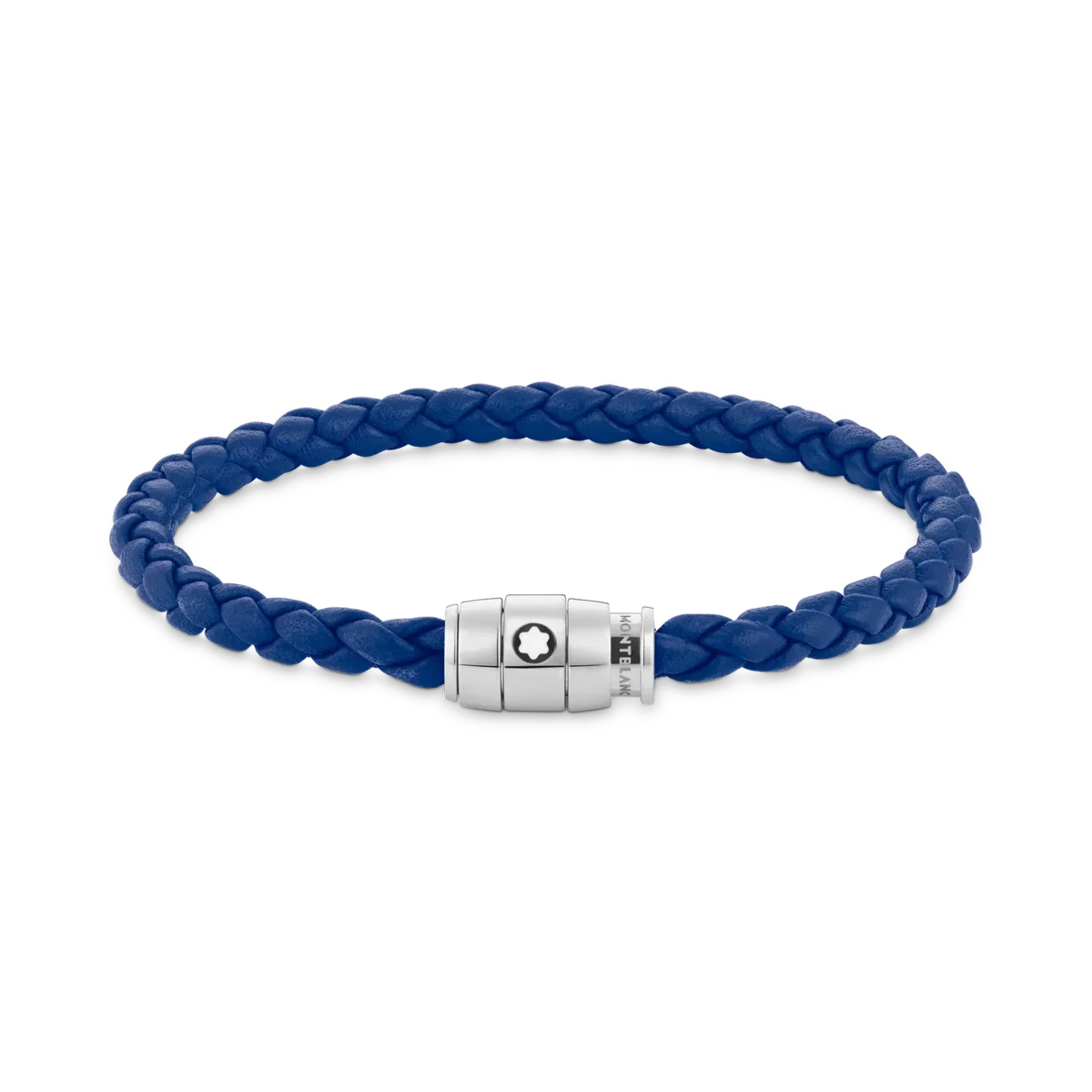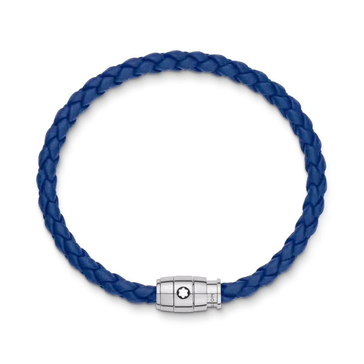 Das aus blauem Leder gewebte Schmuckstück hat einen Verschluss aus poliertem Edelstahl mit einem Ring aus Stahl mit dem Montblanc-Emblem.
