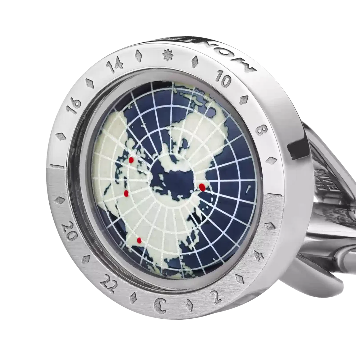 Die Manschettenknöpfe 1858 Geosphere sind ein Spiegelbild ihrer Zeit. Das halbkugelförmige Element mit all seinen Details bildet ein Schmuckstück, das eine Konstellation offenbart und an die Idee anknüpft, den Blick zu den Sternen zu richten, um vor einem blauen Hintergrund seinen Weg zu finden. Die 1858 Geosphere Kollektion ist eine Hommage an das Design der Montblanc 1858 Geosphere Uhrenkollektion.