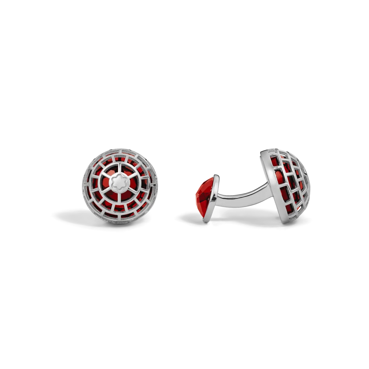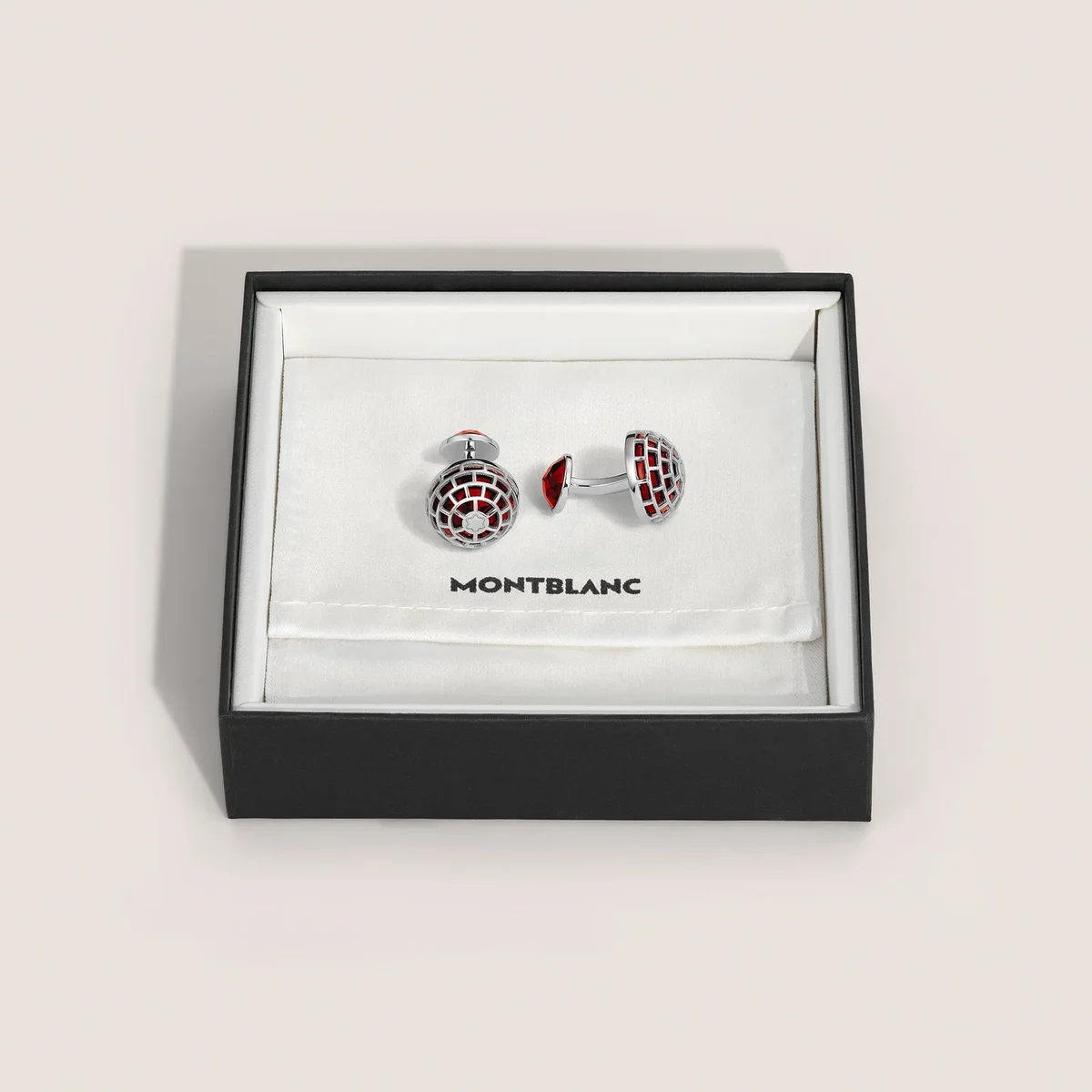 Diese Montblanc Meisterstück Manschettenknöpfe sind aus Silber gefertigt und mit einem roten Jaspisstein in einer modernen Kuppelform versehen, ergänzt durch das eingravierte ikonische Montblanc Emblem. Die Rückseite des Stücks ist ebenfalls mit einem roten Jaspisstein verziert.