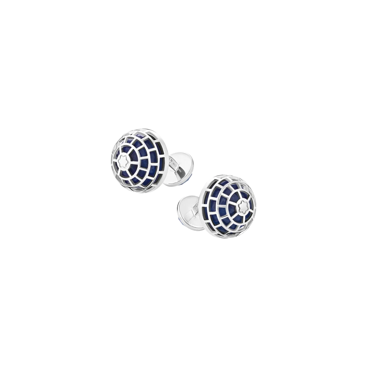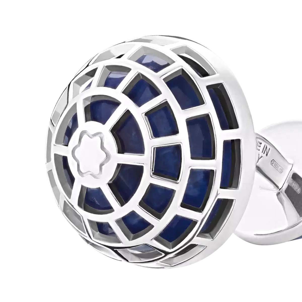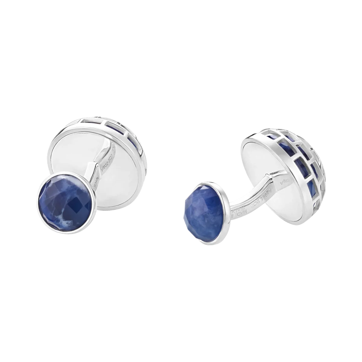 Diese Montblanc Meisterstück Manschettenknöpfe sind aus Silber gefertigt und mit einem blauen Sodalith-Stein in einer modernen Kuppelform versehen, ergänzt durch das eingravierte ikonische Montblanc Emblem. Die Rückseite des Stücks ist ebenfalls mit einem runden Sodalithstein verziert.