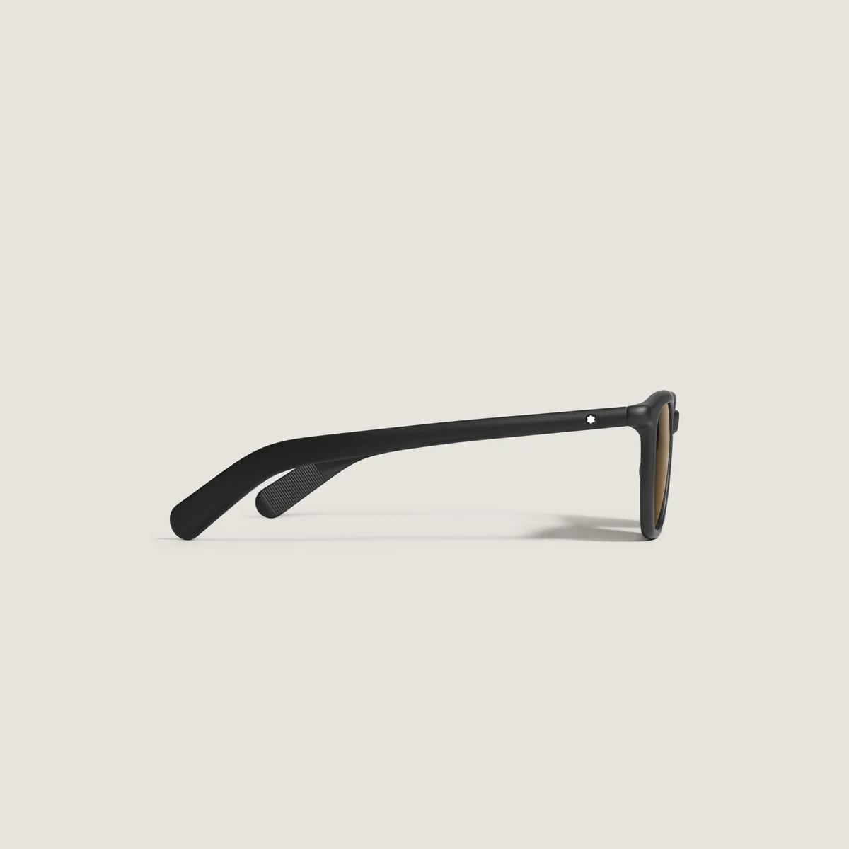 Diese Sonnenbrille im eckigen Stil hat einen schwarzen Acetatrahmen und braune Gläser. Das Montblanc Emblem ist in das Bügeldesign integriert. Das Montblanc Logo ist auf das linke Glas der Sonnenbrille gelasert und das Anti-Rutsch-Muster ist auf die Innenseite der Bügelenden gelasert, um den Tragekomfort zu erhöhen.