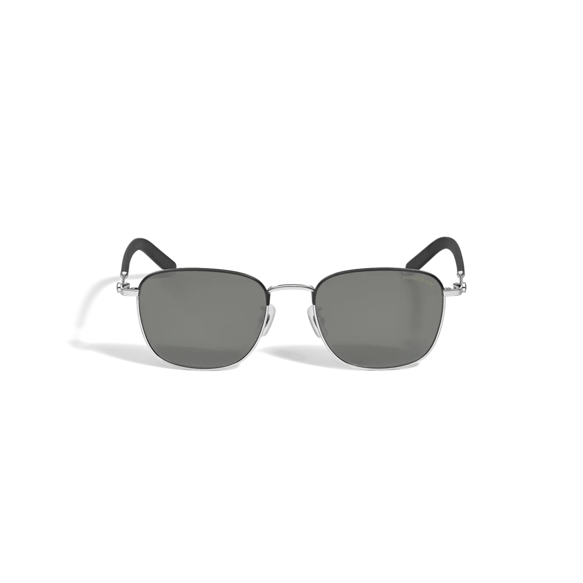 Diese Sonnenbrille im eckigen Stil hat einen silberfarbenen Metallrahmen und graue Gläser. Das Montblanc Emblem ist in das Bügeldesign eingearbeitet. Das Montblanc Logo ist auf das linke Brillenglas gelasert und das rutschfeste Muster ist auf die Innenseite der Bügelenden gelasert, um den Tragekomfort zu erhöhen.
