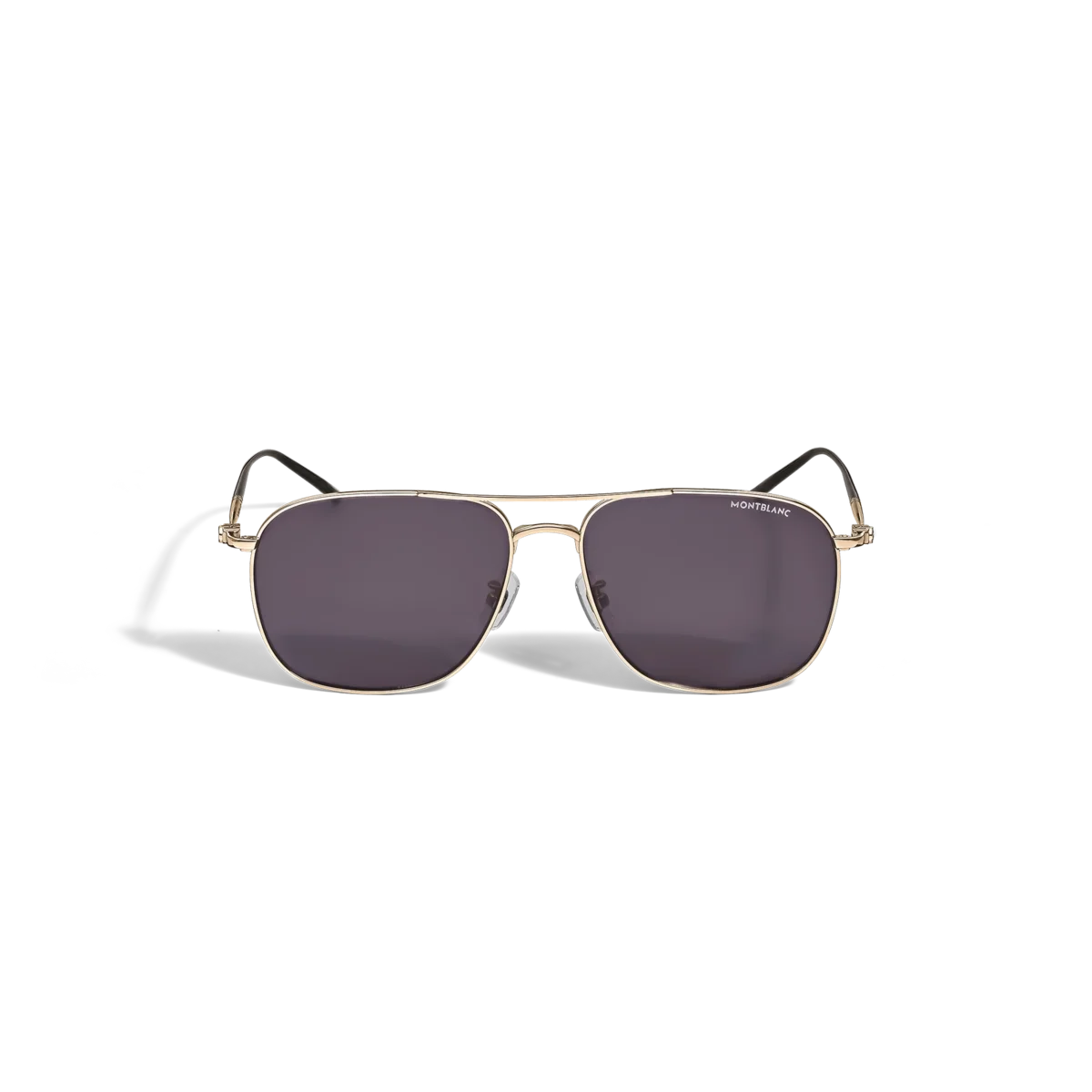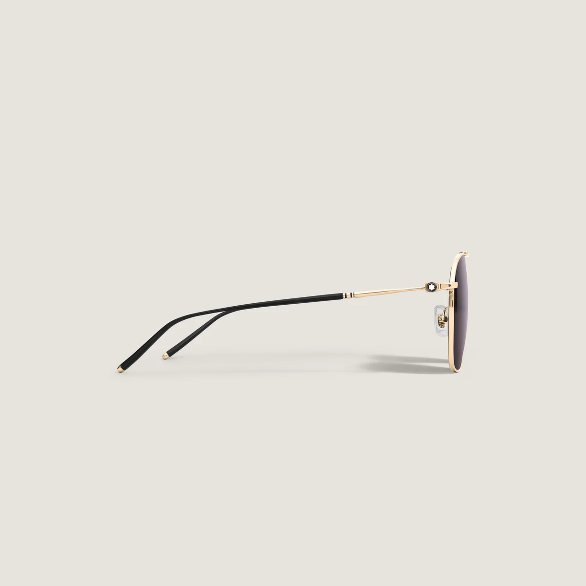 Diese Sonnenbrille im quadratischen Stil hat einen goldfarbenen Metallrahmen und graue Gläser. Sie verfügt über einen doppelten Metallsteg auf der Vorderseite. Die von den Meisterstück-Schreibgeräten inspirierten runden Bügel sind mit einem 3-Ringe-Detail verziert. Das Montblanc Logo ist auf das linke Glas gelasert und die Bügelenden sind mit einem schwarzen Emaille-Detail verziert.