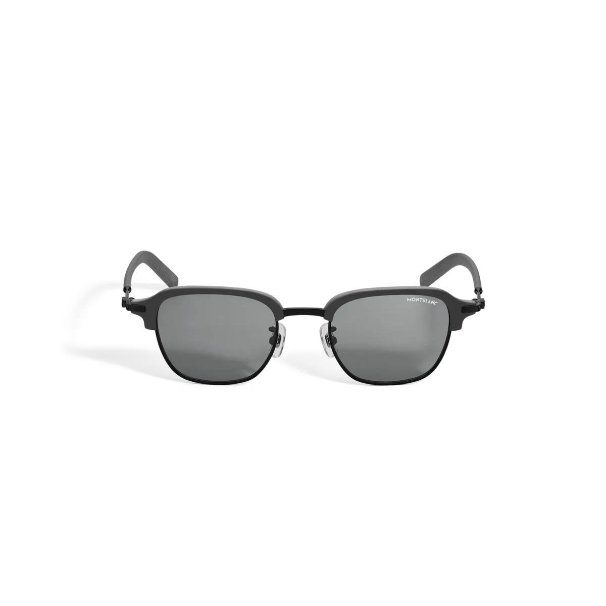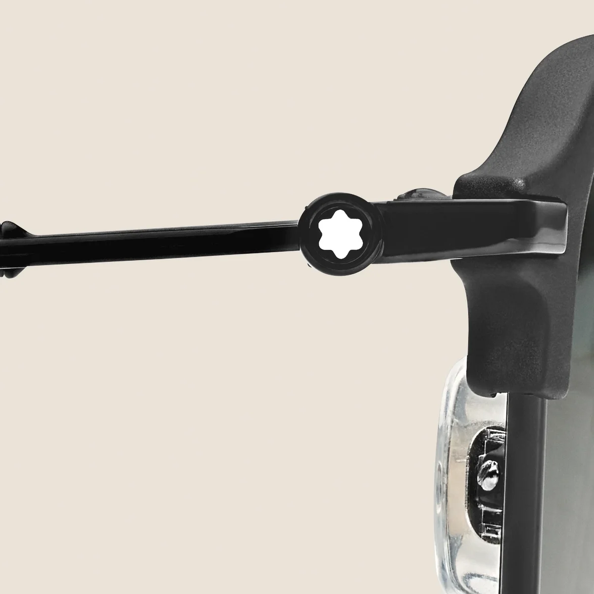 Diese Sonnenbrille im quadratischen Stil hat einen schwarzen Metallrahmen und graue Gläser. Das Montblanc Emblem ist in das Bügeldesign integriert. Das Montblanc Logo ist auf das linke Brillenglas gelasert und das rutschfeste Muster ist auf die Innenseite der Bügelenden gelasert, um den Tragekomfort zu erhöhen.