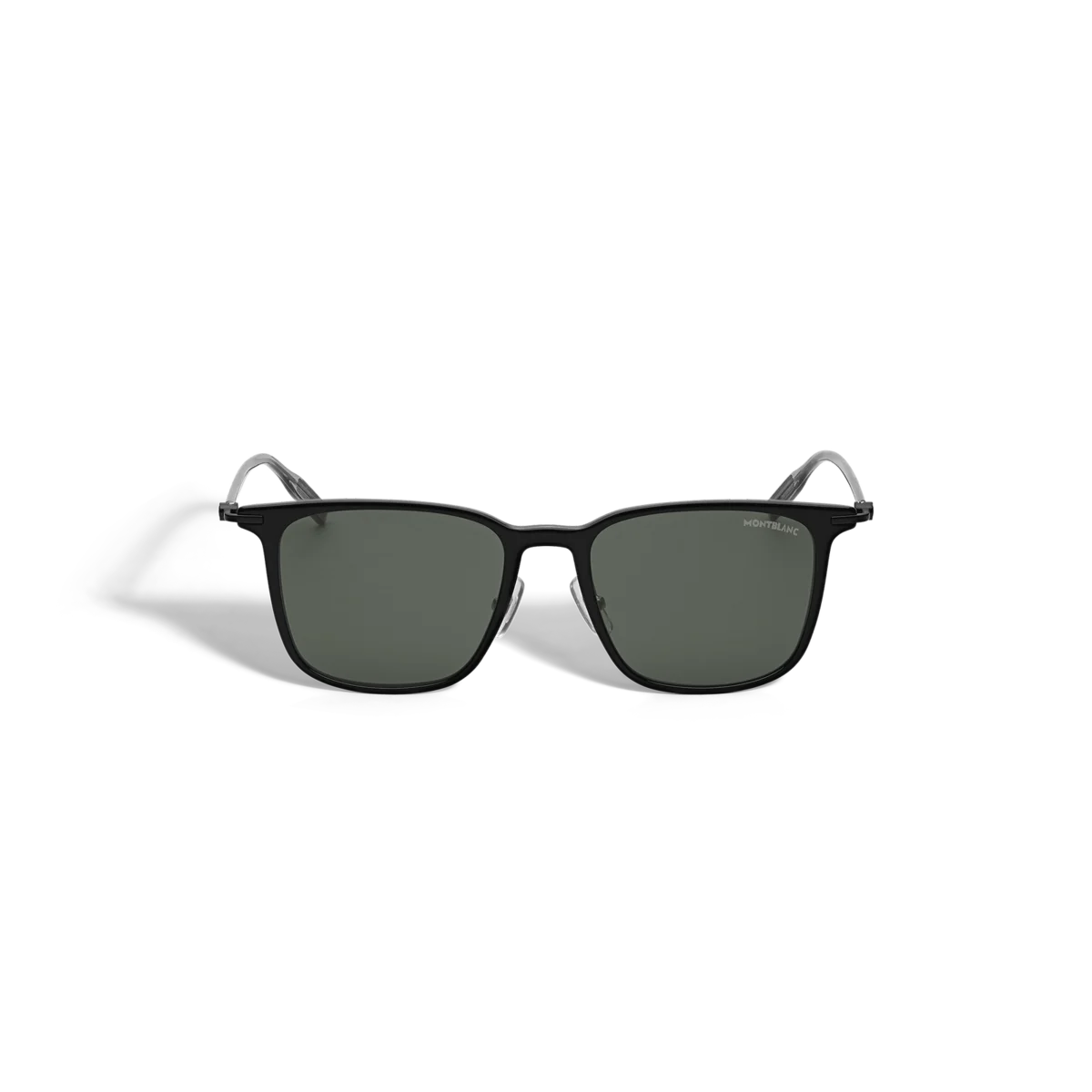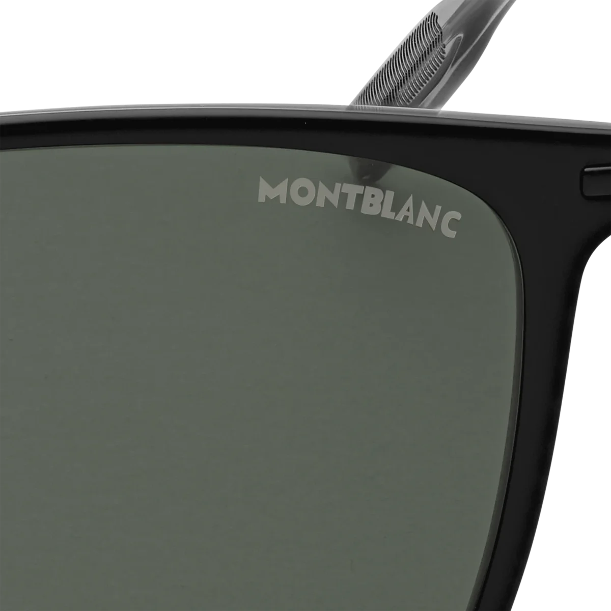 Diese Sonnenbrille im rechteckigen Stil hat einen schwarzen Spritzgussrahmen und graue Gläser. Das Montblanc Emblem mit Schneekappe ist in das Metallbügel-Design eingearbeitet. Das Montblanc Logo ist auf die linke Linse gelasert und die Innenseite der transparenten Bügelenden ist mit einem rutschfesten Muster versehen, um den Tragekomfort zu erhöhen.