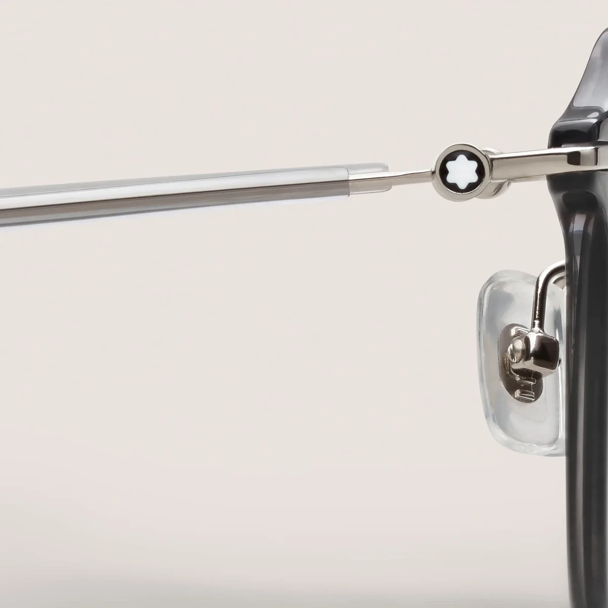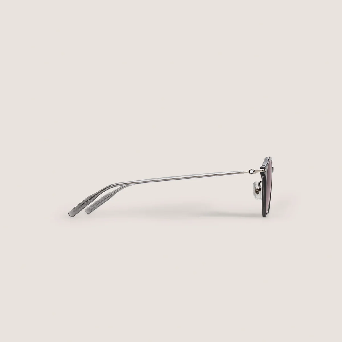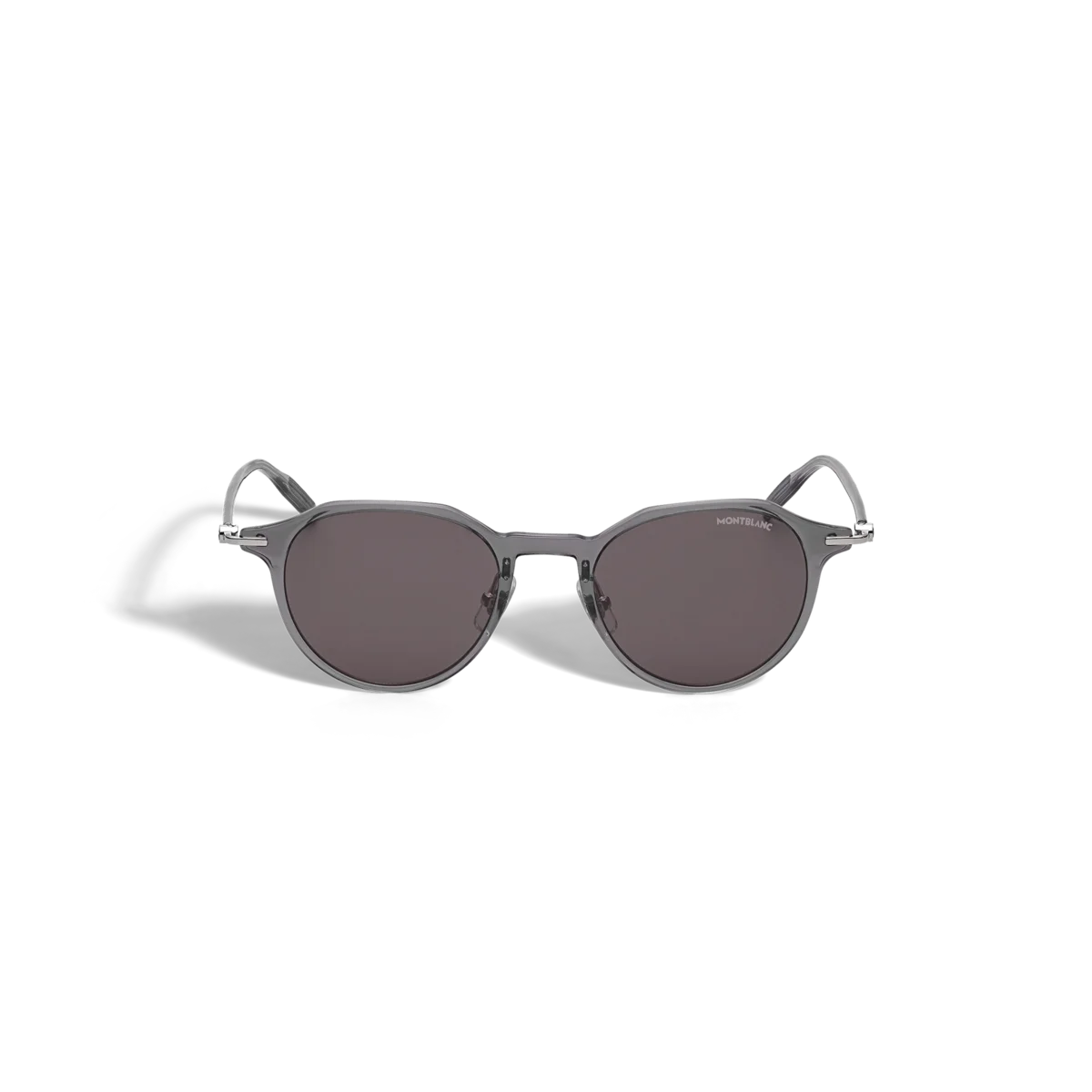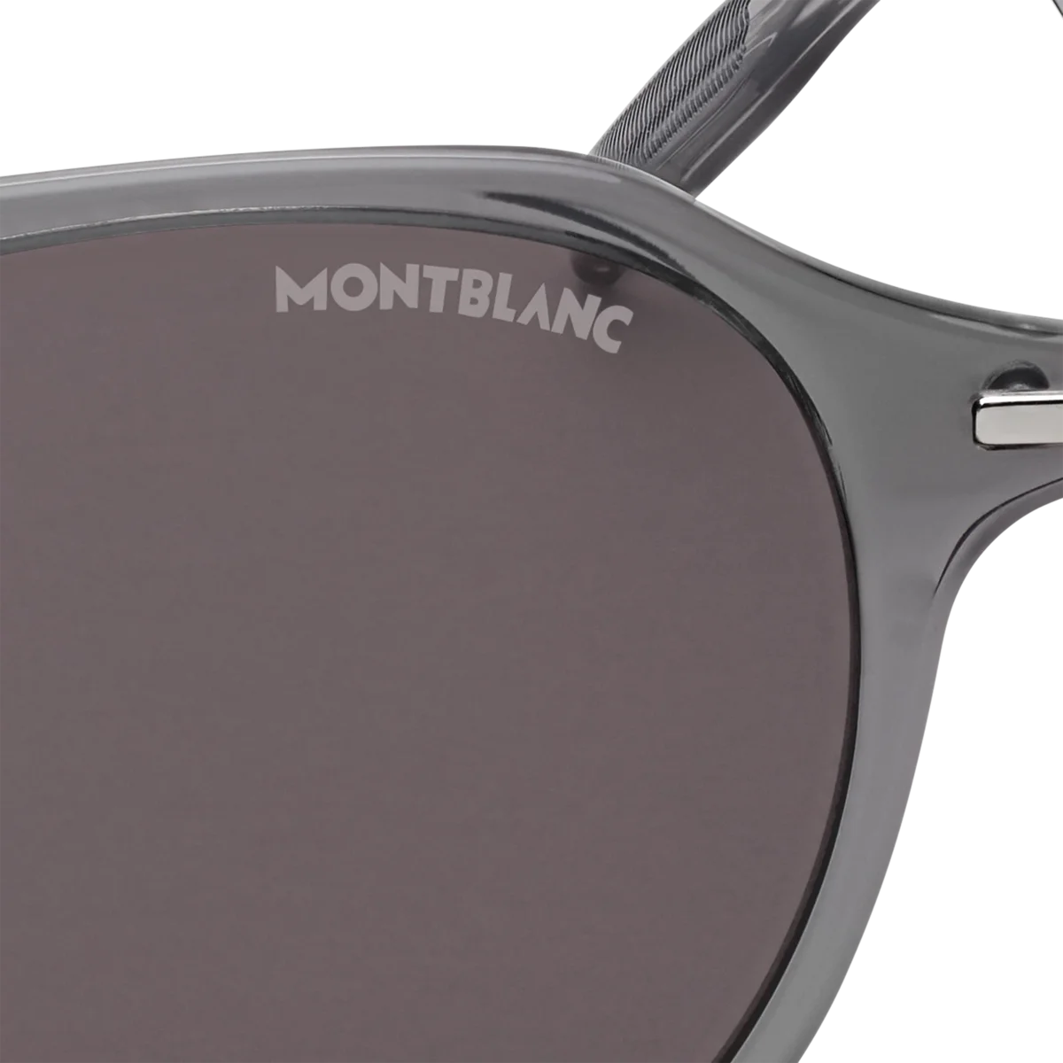 Diese Sonnenbrille im runden Stil hat einen grau gefärbten, eingespritzten Rahmen und graue Gläser. Das schneebedeckte Montblanc Emblem ist in das Metallbügel-Design eingearbeitet. Das Montblanc Logo ist auf das linke Glas gelasert, und die Innenseite der transparenten Bügelenden ist mit einem Anti-Rutsch-Muster versehen, um den Tragekomfort zu erhöhen.