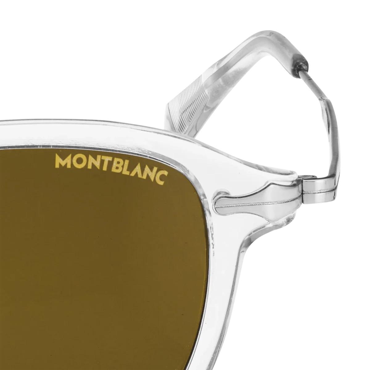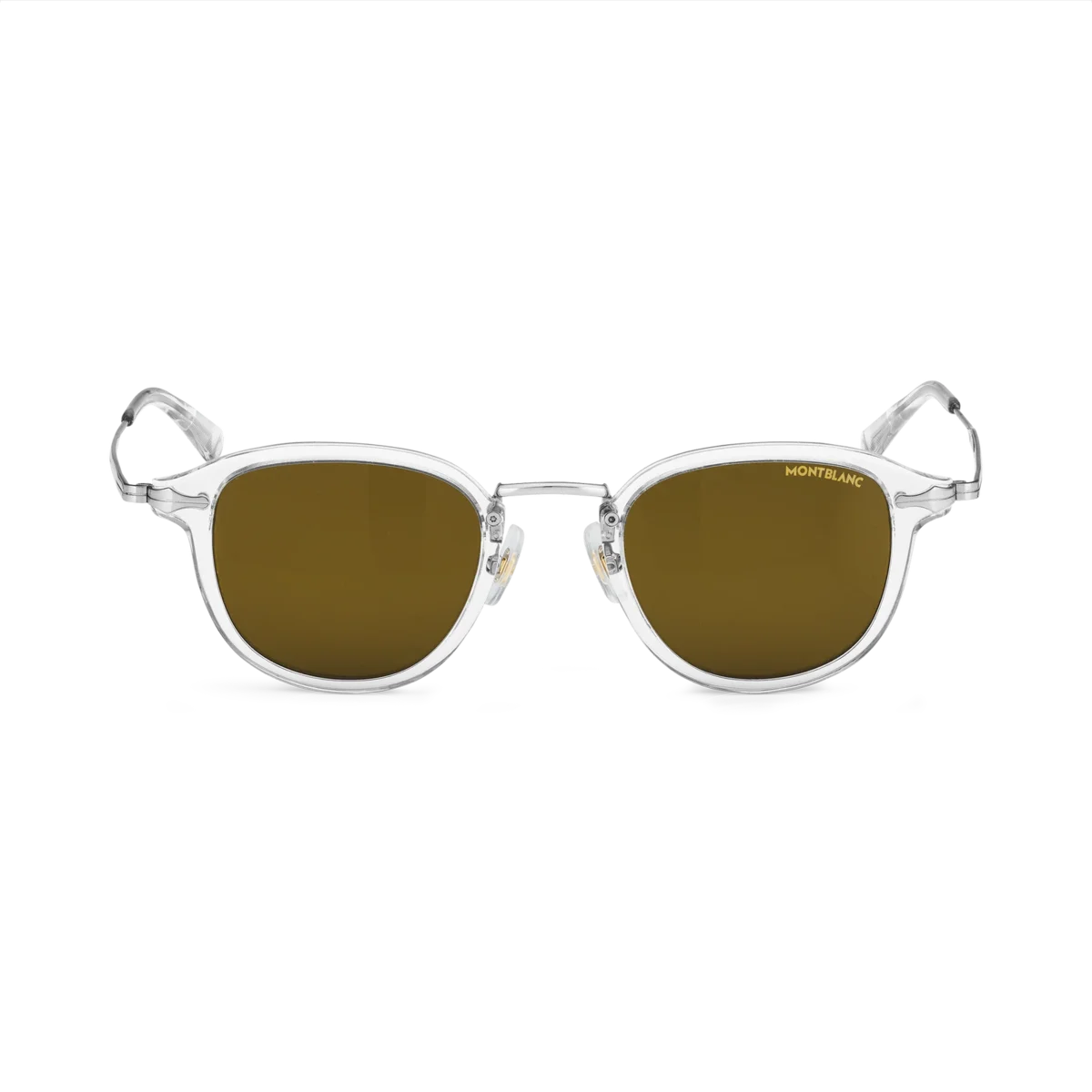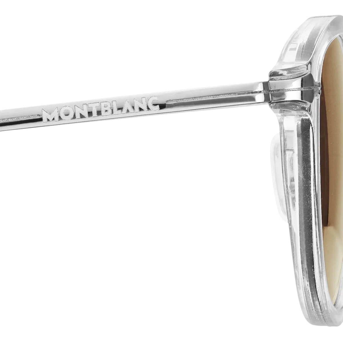 Diese runde Sonnenbrille verfügt über einen grauen Spritzgussrahmen und braune Gläser. Inspiriert vom Federkiel-Design der Schreibgeräte ziert ein dekoratives Federkiel-Detail das Metallbügel-Design. Das Montblanc Logo ist auf die linke Linse gelasert und das Anti-Rutsch-Muster ist auf die Innenseite der Bügelenden gelasert, um den Tragekomfort zu erhöhen.