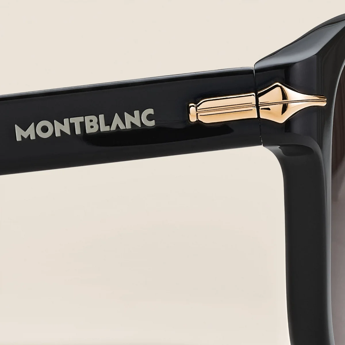 Diese Sonnenbrille im runden Stil hat einen schwarzen Acetatrahmen und graue Gläser. Inspiriert vom Federkiel-Design der Schreibgeräte ziert ein dekoratives Federkiel-Detail die Bügel. Das Montblanc One Line-Logo ist auf der rechten Seite des Bügels eingraviert, zusätzlich ist das Logo auf das linke Glas gelasert.