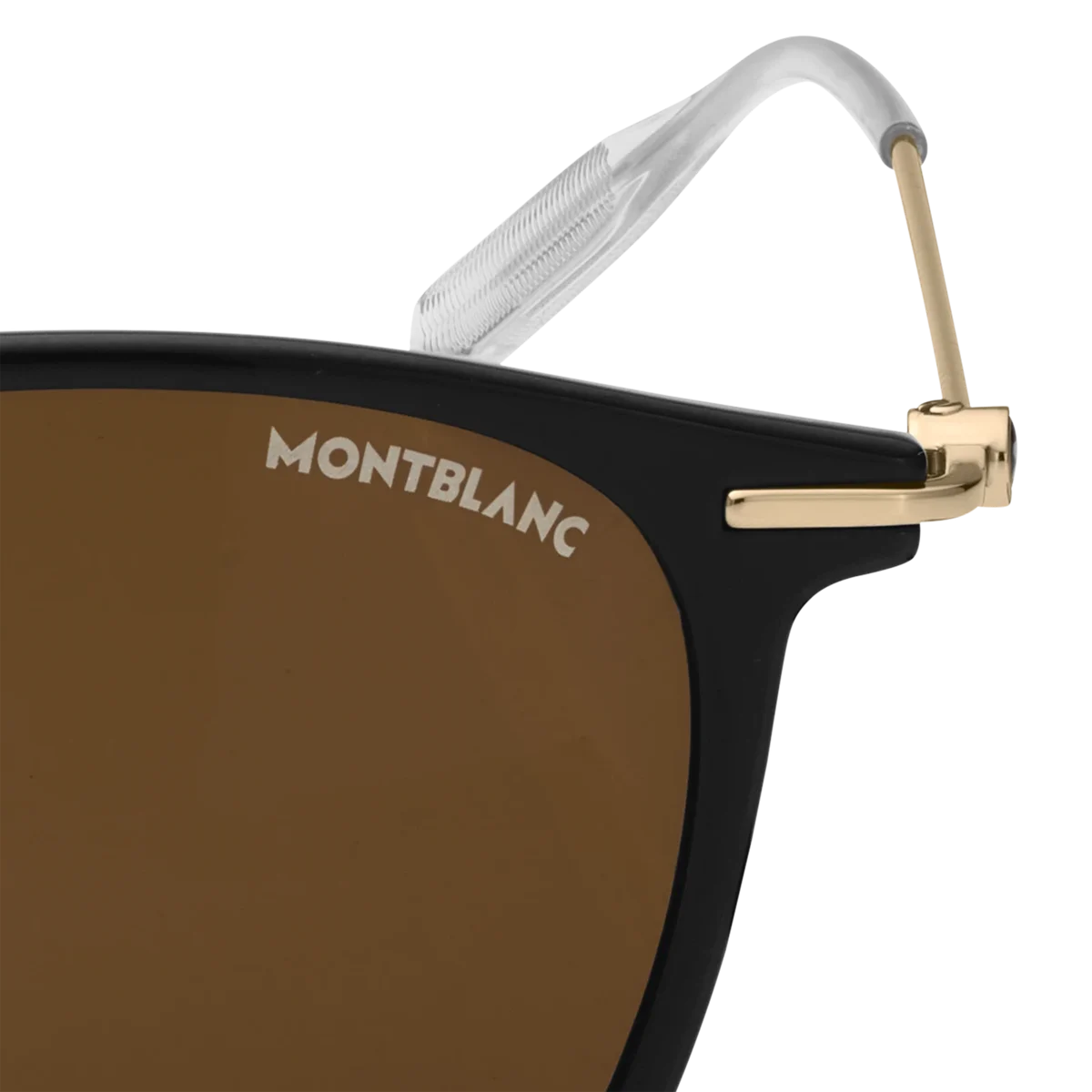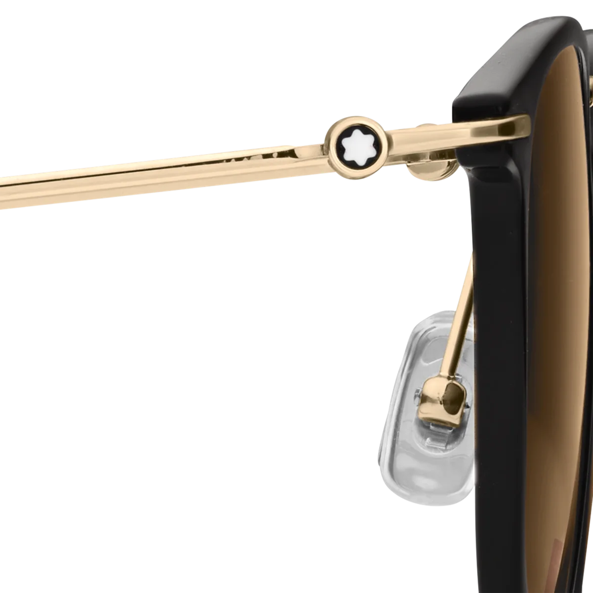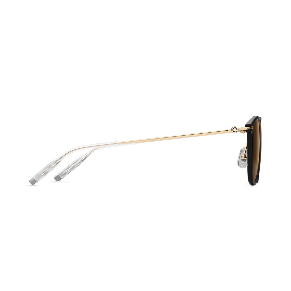 Diese leichte schwarze Sonnenbrille mit spritzgegossenem goldfarbenem Rahmen zeichnet sich durch ihre runde Form aus. Die braunen Gläser sorgen für einen zeitgemäßen Look. Das Montblanc Logo ist auf das linke Glas gelasert und das rutschfeste Muster ist auf die Innenseite der Bügelenden gelasert, um den Tragekomfort zu erhöhen.