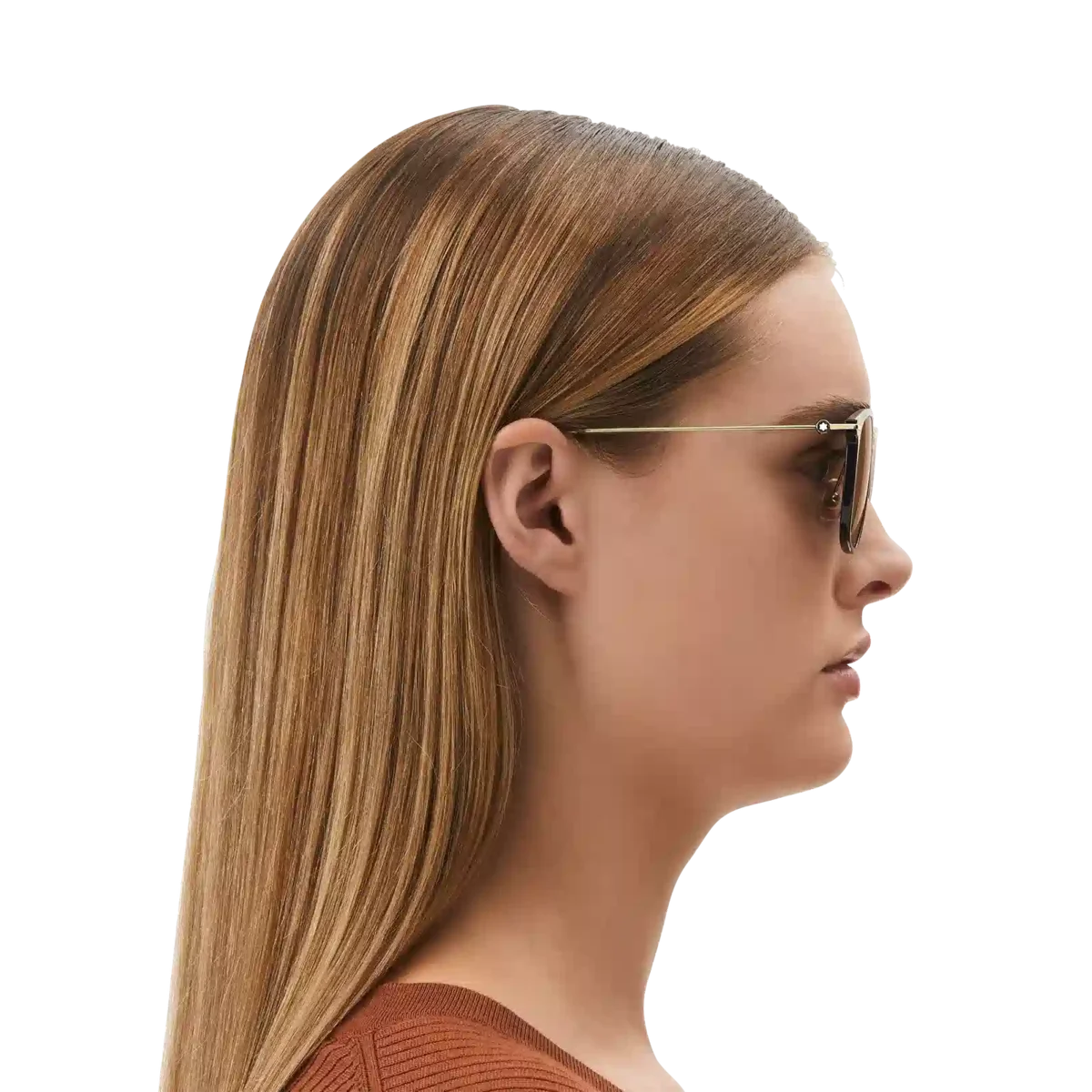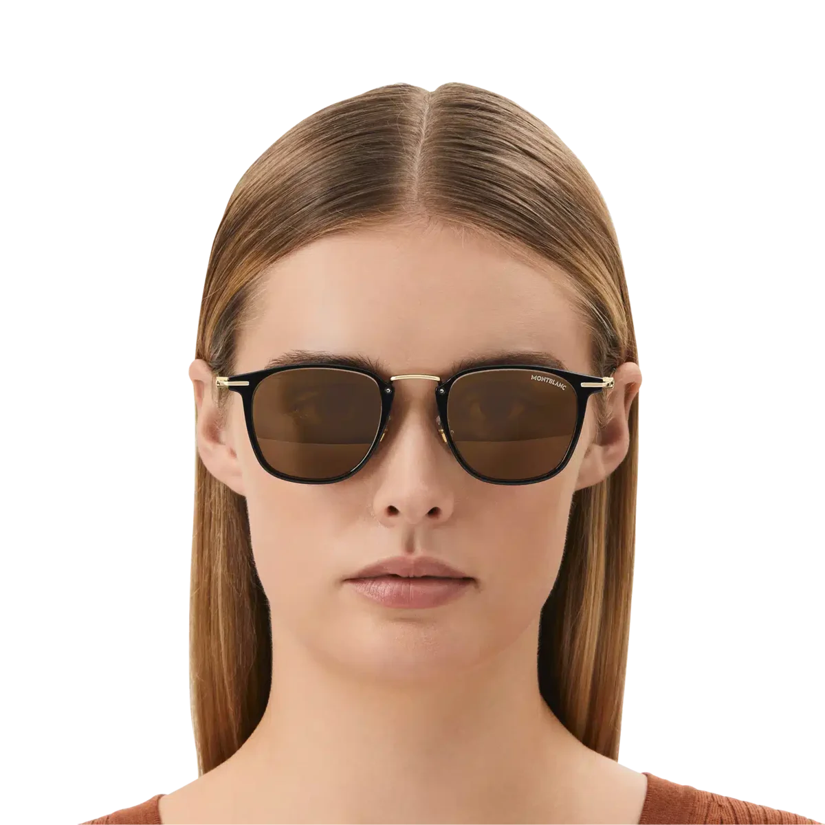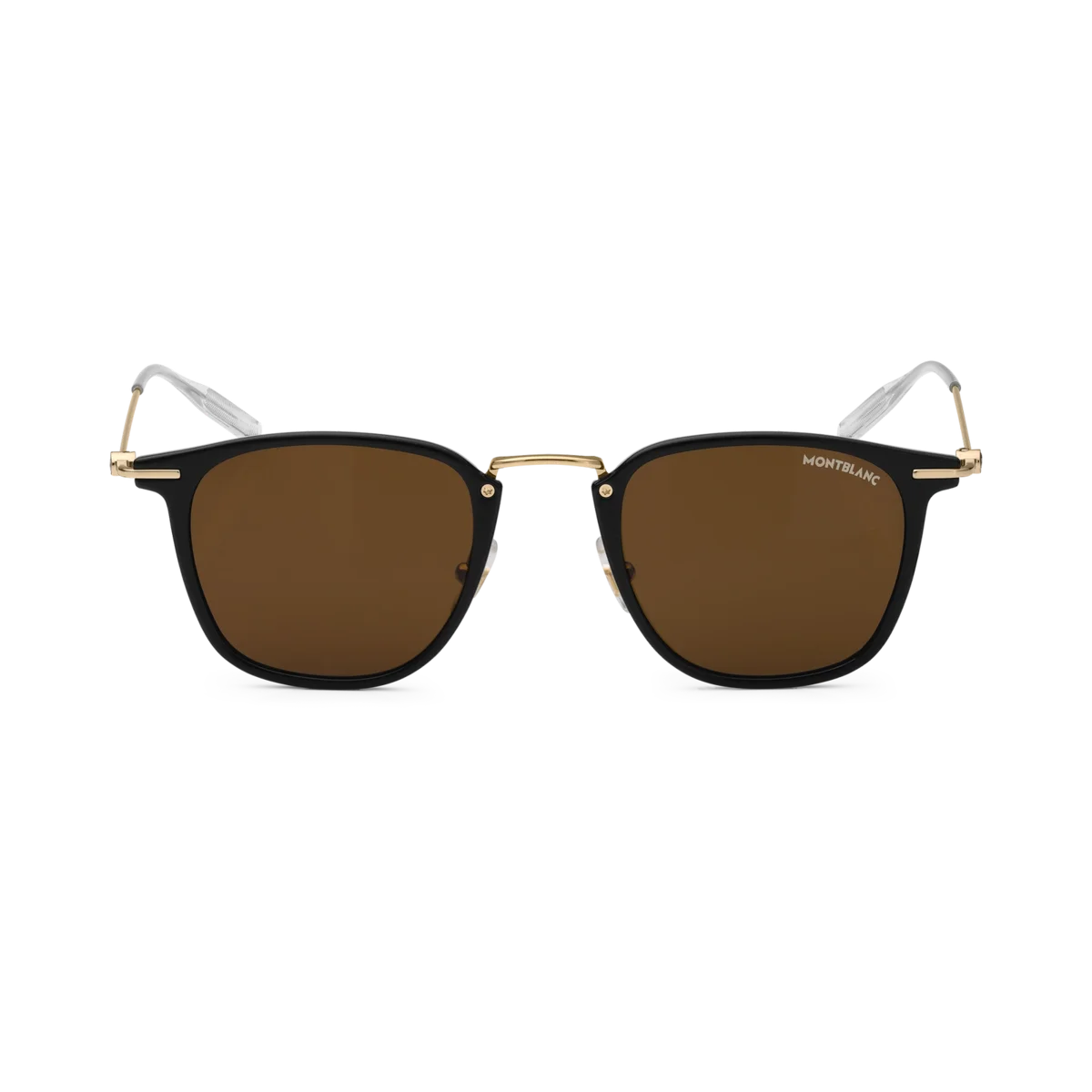 Diese leichte schwarze Sonnenbrille mit spritzgegossenem goldfarbenem Rahmen zeichnet sich durch ihre runde Form aus. Die braunen Gläser sorgen für einen zeitgemäßen Look. Das Montblanc Logo ist auf das linke Glas gelasert und das rutschfeste Muster ist auf die Innenseite der Bügelenden gelasert, um den Tragekomfort zu erhöhen.