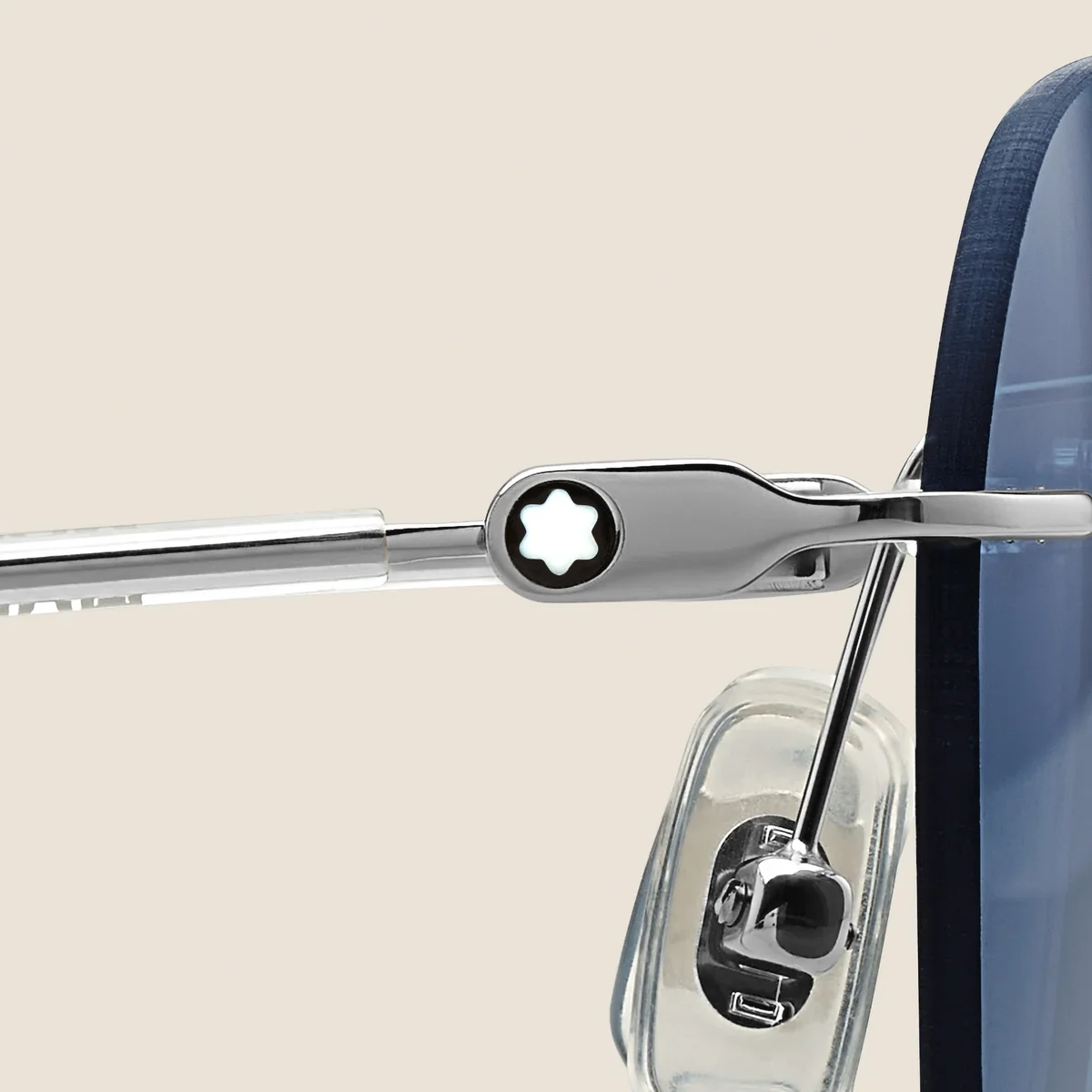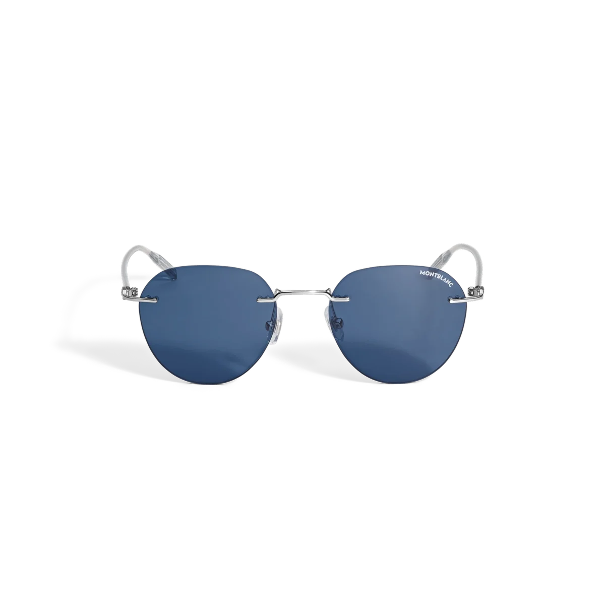 Diese randlose Sonnenbrille im runden Stil hat einen silberfarbenen Metallrahmen und blaue Gläser. Das Montblanc Emblem ist in das Bügeldesign eingearbeitet. Das Montblanc Logo ist auf das linke Brillenglas gelasert.