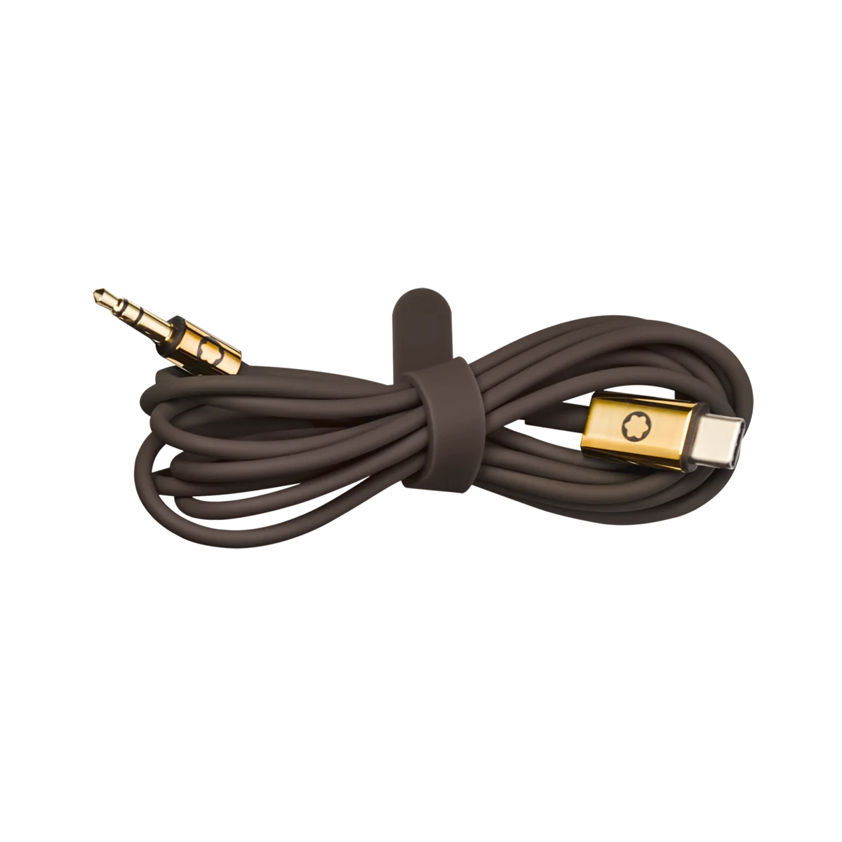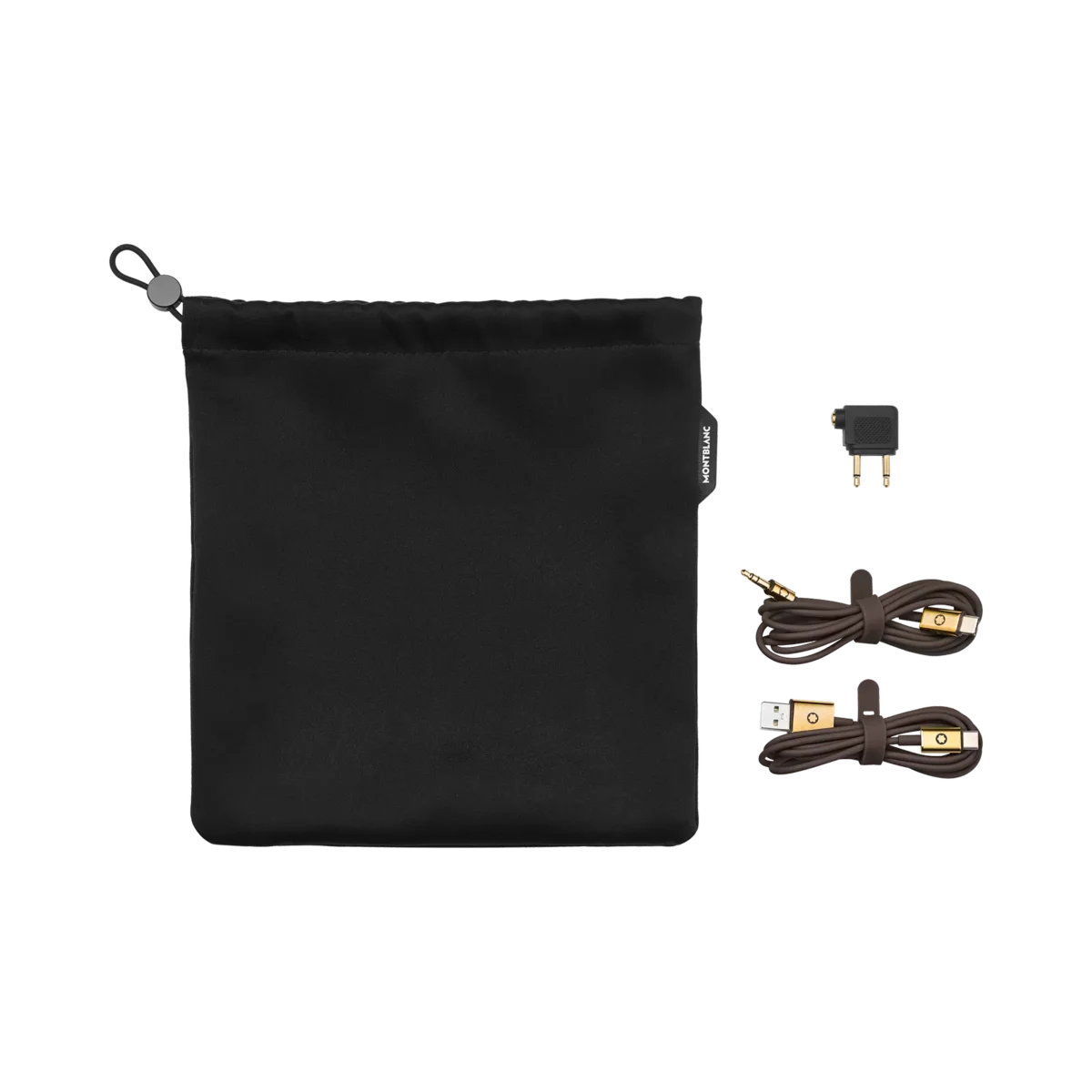 Zusätzliches Reiseset für Ihre Montblanc MB 01 Kopfhörer mit einer schwarzen Tasche, einem braunen USB-C-Ladekabel, einem braunen Audiokabel und einem schwarzen Reiseadapter.