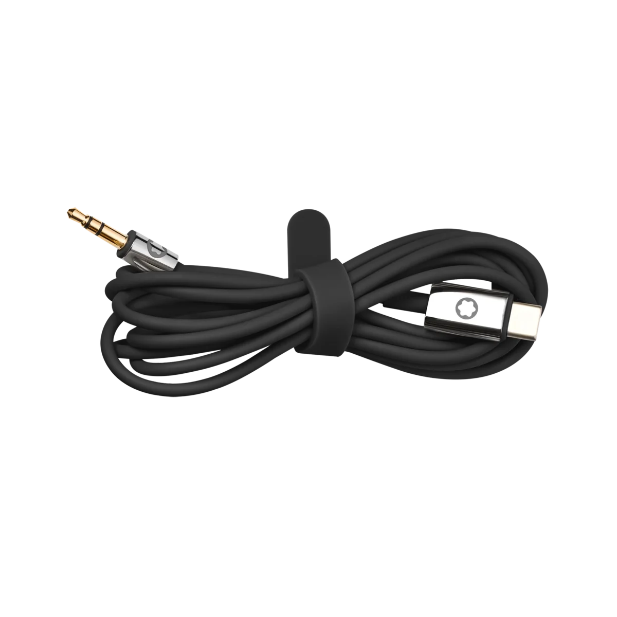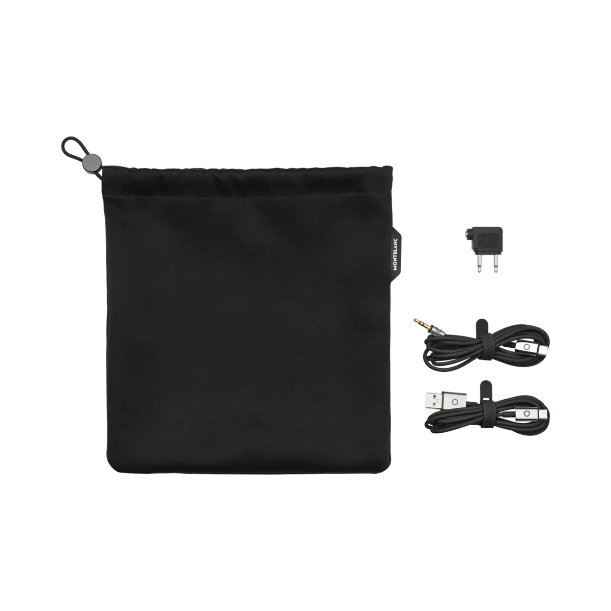 Zusätzliches Reiseset für Ihre Montblanc MB 01 Kopfhörer mit einer schwarzen Tasche, einem schwarzen USB-C-Ladekabel, einem schwarzen Audiokabel und einem schwarzen Reiseadapter.