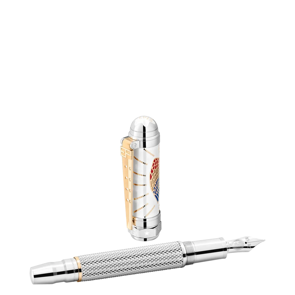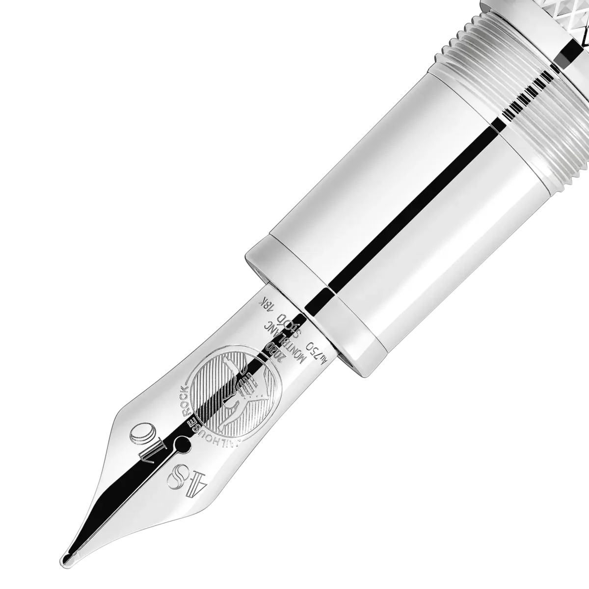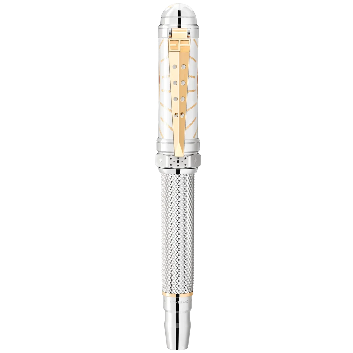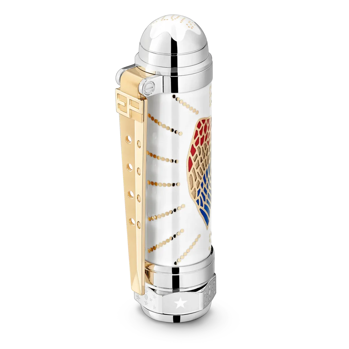 Elvis Presley gilt nach wie vor als eine der bedeutendsten Kulturikonen des 20. Jahrhunderts – der „King of Rock’n Roll”, der eine ganze Generation geprägt hat. 1935 in Tupelo, Mississippi, geboren und nach Memphis, Tennessee, gezogen, wurde Elvis Presley zu einem der berühmtesten Musiker und Schauspieler. Die Gesamtform des Schreibgeräts ist von einer Zündkerze eines Automotors inspiriert, ebenso wie die Form des goldbeschichteten Clips, die Elvis‘ Liebe zu V8-Motoren widerspiegelt. Das „EP”-Logo stammt von seiner charakteristischen Sonnenbrille. Auf der Kappe befindet sich das „ELVIS”-Logo innerhalb des weiß lackierten Montblanc-Emblems, und das Muster auf der platinbeschichteten Kappe und dem Schaft stammt von einem seiner goldenen Ringe. Seine berühmte Kappe aus „Aloha Hawaii” diente als Vorlage für die lackierte Adlerverzierung auf der Kappe, während ein Zitat von Elvis „Ambition is a dream with a V8 engine” (Ehrgeiz ist ein Traum mit einem V8-Motor) auf den Kegel graviert ist.