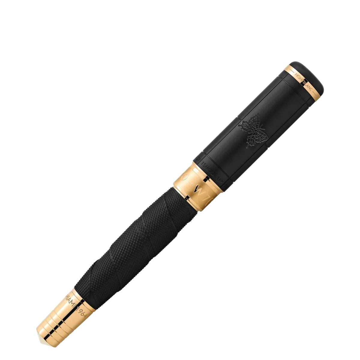 Nur wenige Sportler werden so gefeiert und geehrt wie der dreimalige Weltmeister im Schwergewicht Muhammad Ali, dessen legendäre Momente im Sport und im Kampf für Bürgerrechte ihn zu einem der einflussreichsten Sportler und Menschenfreunde des 20. Jahrhunderts machten. Als Sportler erschütterte Ali die Welt mit seiner Kraft, seinem Können und seiner Persönlichkeit und wurde mit nur 22 Jahren Weltmeister im Schwergewicht. Sein größter Triumph war jedoch das Ergebnis seines humanitären Engagements. Die aus edlem schwarzem Harz gefertigte Kappe ähnelt einem Boxsack, während der Schaft wie das Boxband aussieht, mit dem Sportler ihre Hände umwickeln. Die Kappe weist verschiedene Designelemente auf, darunter ein berühmtes Zitat von Ali und einen Schmetterling, der von seinem typischen Kampfstil inspiriert ist: „Float like a Butterfly, sting like a bee” (Schwebe wie ein Schmetterling, steche wie eine Biene). Der spitze Kegel greift diese Idee auf und ist mit vier Linien graviert, die die Seile eines Boxrings darstellen. Die Inschriften auf dem Kegel beziehen sich auf Alis Sieg bei den Olympischen Spielen 1960 in Rom und seinen ersten Weltmeistertitel im Schwergewicht, den er 1964 in Miami gewann. Die Details seines Sieges, nämlich der Sieg durch technischen K.o. in der siebten Runde, sind auf dem Kappenring zu finden. Zur Feier seines ersten Titels ist das Montblanc-Emblem aus weißem Harz mit einer „1“ verziert. Um diesen Erfolg zu unterstreichen, ist der Clip wie ein Box-Meisterschaftsgürtel geformt und trägt seinen Namen. Die handgefertigte Feder aus massivem 585er Gelbgold zeigt einen Boxhandschuh. Ident-Nr. MB129332 Physikalisches Gewicht 62,59 g Abmessungen 147 mm * 17,3 mm