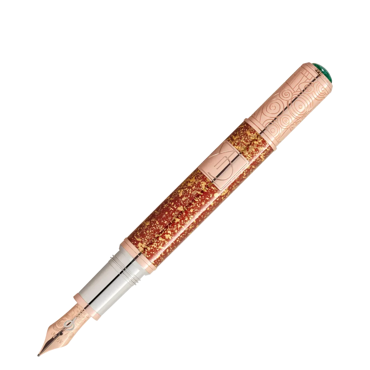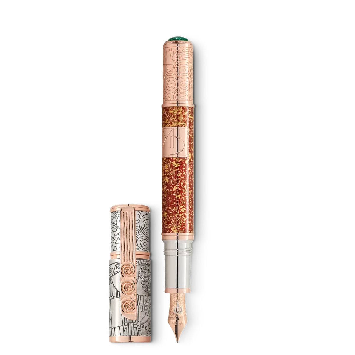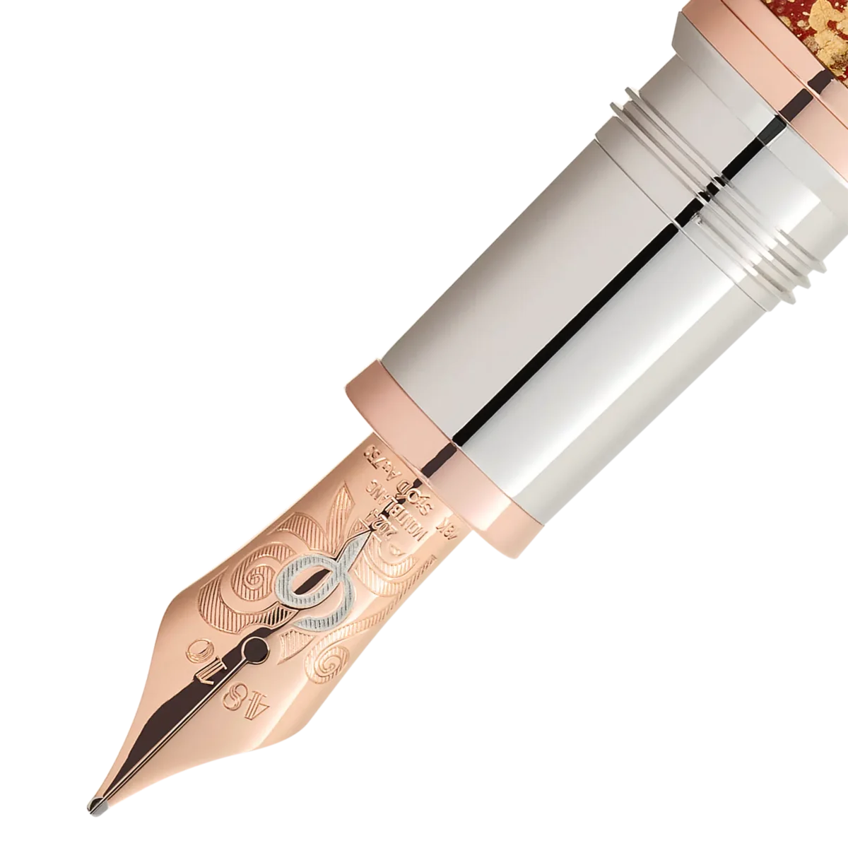 Große Künstler haben im Laufe der Geschichte die menschliche Erfahrung in einer universellen Sprache der Form und Schönheit zum Ausdruck gebracht. Die Montblanc Masters of Art Collection würdigt ihren unvergänglichen Beitrag zum Streben nach Perfektion in der Kunst – ein Streben, das Montblanc sowohl feiert als auch selbst verfolgt. Ein Künstler, dessen Vision den Wiener Jugendstil und das Goldene Zeitalter mitgeprägt hat, ist Gustav Klimt. Die Montblanc Masters of Art Hommage an Gustav Klimt Limited Edition 161 würdigt sein berühmtes Werk „Der Kuss“ und ist seiner Liebe zur japanischen Kunst und Kultur gewidmet. Gustav Klimt war bestrebt, mit neuen, ungewöhnlichen Ausdrucksmitteln zu experimentieren. Dabei entwickelte er eine Fusion aus realistischer Darstellung, Ornamentik und Abstraktion, die 1909 in seinem berühmten, fast mythischen Gemälde „Der Kuss“ gipfelte. Dieses Gemälde offenbart Gustav Klimts Leidenschaft für ostasiatische Kunst, die ebenfalls die Perspektive zugunsten von Ornamenten, Farben und harmonischen Kurven außer Kraft setzt. Die Ornamente aus „Der Kuss“ inspirierten die Gravuren auf dem massiven Au 750 Roségoldkegel der Homage to Gustav Klimt Limited Edition 161 und einem Teil der Ag 925 Sterlingsilberkappe. Die beiden Liebenden, die sich in einem Kuss verlieren, das zentrale Motiv von Klimts Gemälde, sind kunstvoll auf die Kappe graviert. Klimts Interesse an japanischen Lackiertechniken hat sein Werk beeinflusst. Er bewunderte die mit Gold verzierten Dekorationsarbeiten der Rinpa-Schule, sammelte Ukiyo-e-Holzschnitte, japanische Keramiken und Noh-Masken und verband deren Techniken mit seinem eigenen Stil. Eine golddurchflutete Aura, wie sie die Liebenden in „Der Kuss“ umgibt, umhüllt auch den Schaft des Schreibgeräts. In vielen Werken mischte Klimt seine Farbe mit Blattgold, polierten Steinen und Perlmutt. In „Der Kuss“ kombinierte er Blattgold und Ölvergoldung und verwendete für bestimmte Bereiche sogar Platin. Bei der Limited Edition 161 wird das Zusammenspiel von 925er Sterlingsilber und massivem 750er Gold durch einen grünen Aventurin-Cabochon im Konus bereichert, dessen Farbe an den Frühling erinnert, die Jahreszeit des Neuanfangs. Die leicht geschwungenen Linien auf dem Clip, die in drei Spiralen enden, entsprechen der Verzierung auf dem geschmiedeten Metallrahmen von Klimts Gemälde „Athena“. Die spiralförmige Verzierung, ein typisches Motiv mykenischer Goldschmuckstücke, ist eine Anspielung auf Athenas griechische Heimat. An der Spitze der Kappe, in einer Fassung aus massivem 750er Roségold, erinnert das Montblanc Emblem aus Perlmutt an die Vision der drei Montblanc Gründer, deren ehrgeizige Ziele ebenso hoch waren wie die Gletscher, die den Gipfel des Mont Blanc krönen. Die handgefertigte Feder aus massivem 750er Gold der Homage to Gustav Klimt Limited Edition 161 ist mit einer kunstvollen Verzierung aus geschwungenen Linien und Spiralen versehen, die zur typischen geometrischen Formensprache vieler Werke von Gustav Klimt gehören. Ein besonders prächtiges Beispiel dafür findet sich im Baum des Lebens, der Teil des 1909 fertiggestellten Stoclet-Frieses ist. In das Muster auf der Feder ist das Zeichen für Phi eingearbeitet, das die irrationale Zahl 1,61 mit ihren unendlichen Dezimalstellen symbolisiert. Es bestimmt die Proportionen des Goldenen Schnitts, der das Design vieler künstlerischer Meisterwerke der Welt beeinflusst hat und in der Natur zahlreiche Beispiele findet. Die Gravur auf dem Füllfederhalter und die Herstellung von genau 161 limitierten Exemplaren sind eine Hommage an dieses ideale Maß, das Harmonie und Ästhetik verkörpert. Auch die Proportionen zwischen Kappe und Schaft sind vom Goldenen Schnitt inspiriert. Ident-Nr. MB130228 Physikalisches Gewicht 113,9 g Abmessungen 145 mm * 17,6 mm * 17,6 mm