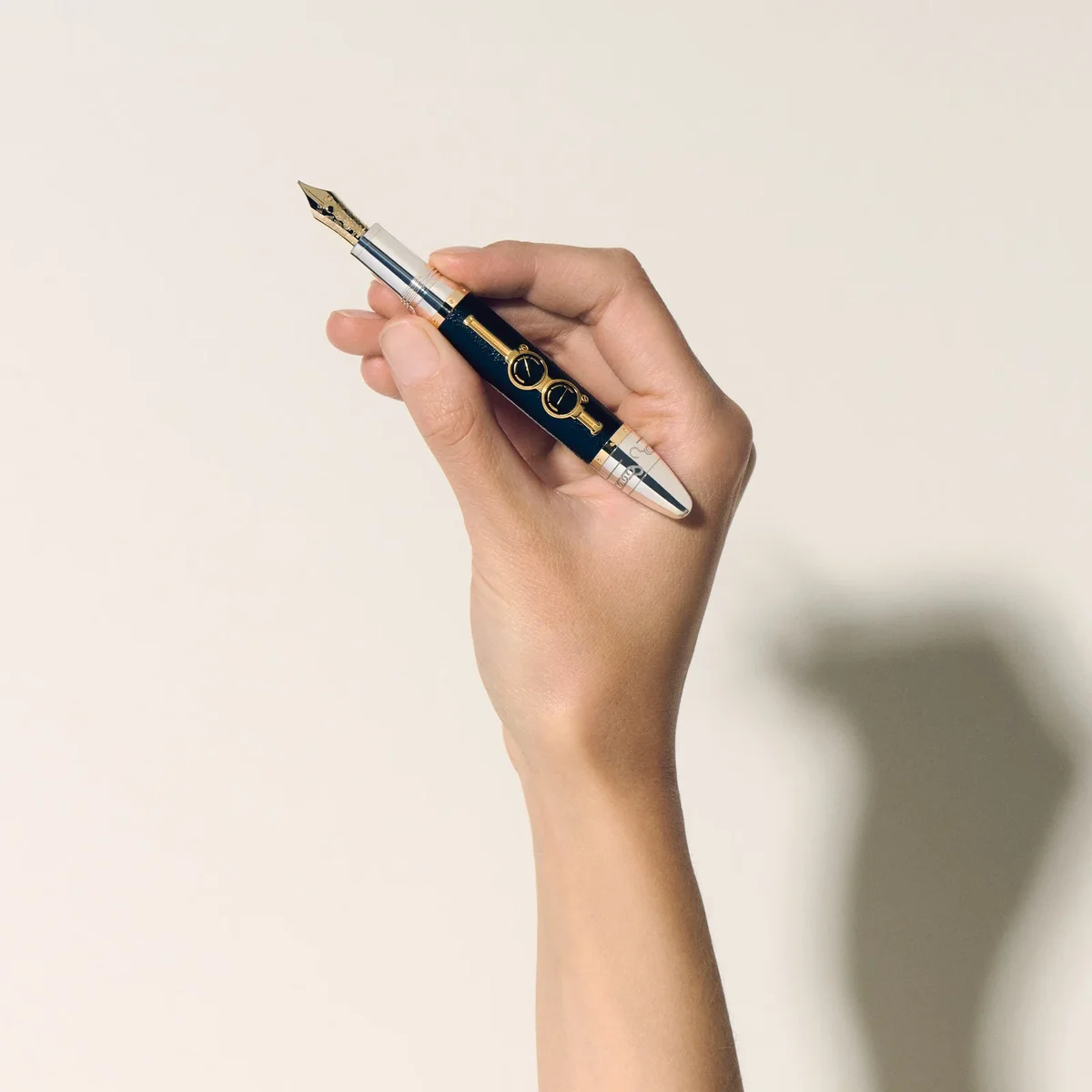 Die Meisterstück Around the World in 80 Days Kollektion ist von Jules Vernes berühmtem Abenteuerroman inspiriert. Der Limited Edition 811 Füllfederhalter aus 925er Sterlingsilber und strukturiertem Lack erzählt die epische Reise von Mr. Fogg und Passepartout. Auf der letzten Etappe ihrer Reise von Yokohama zurück nach London über die Vereinigten Staaten durchqueren die beiden den riesigen amerikanischen Kontinent mit dem Zug, was auf der Au750/18 Karat massivgoldenen Kartusche dargestellt ist, die in die Kappe aus 925er Sterlingsilber eingelegt ist. Das Design der Kappe fängt den aufsteigenden Rauch der Lokomotive ein, während eine 3D-Einlage, die Druckventile darstellt, den strukturierten Schaft ziert. Der Clip ziert eine rot lackierte Herzkarte, die die Verbindung zwischen Phileas Fogg und Prinzessin Aouda symbolisiert. Darüber hinaus stehen die Kartenfarben für Foggs gewagte Wette, die Reise in nur 80 Tagen zu absolvieren. Auf der Kappe ist die Zeitachse der Reise eingeprägt – 36 Tage von Yokohama nach London, was insgesamt 80 Tage um die Welt ergibt. Auf dem Konus ist ein Sicherheitskettenmuster zu sehen, das einen entscheidenden Moment widerspiegelt, als Passepartout den Zug von der Lokomotive abkoppelt, um die Besatzung zu retten, die von den Sioux angegriffen wurde. Das Schreibgerät ist mit einer handgefertigten 18-Karat-Goldfeder verziert, die mit einem 1,5 mm großen schwarzen Spinell und einem Kartensymbolmuster versehen ist.