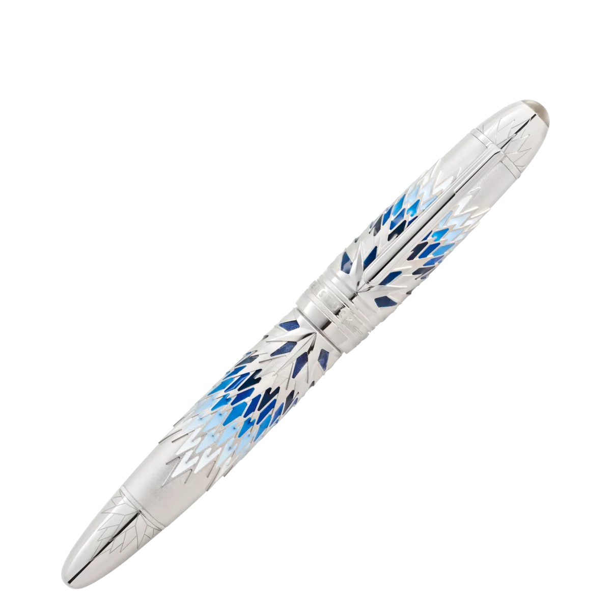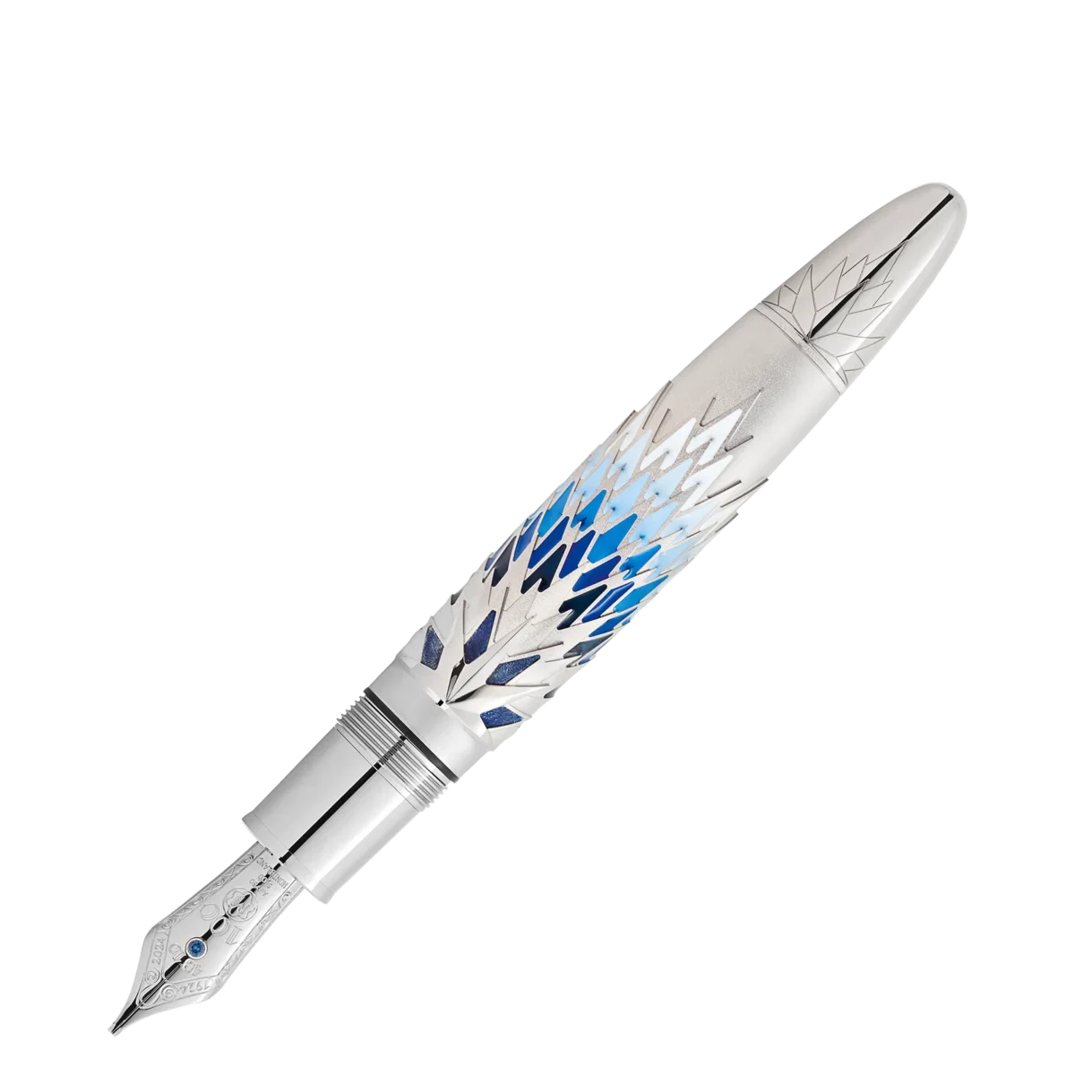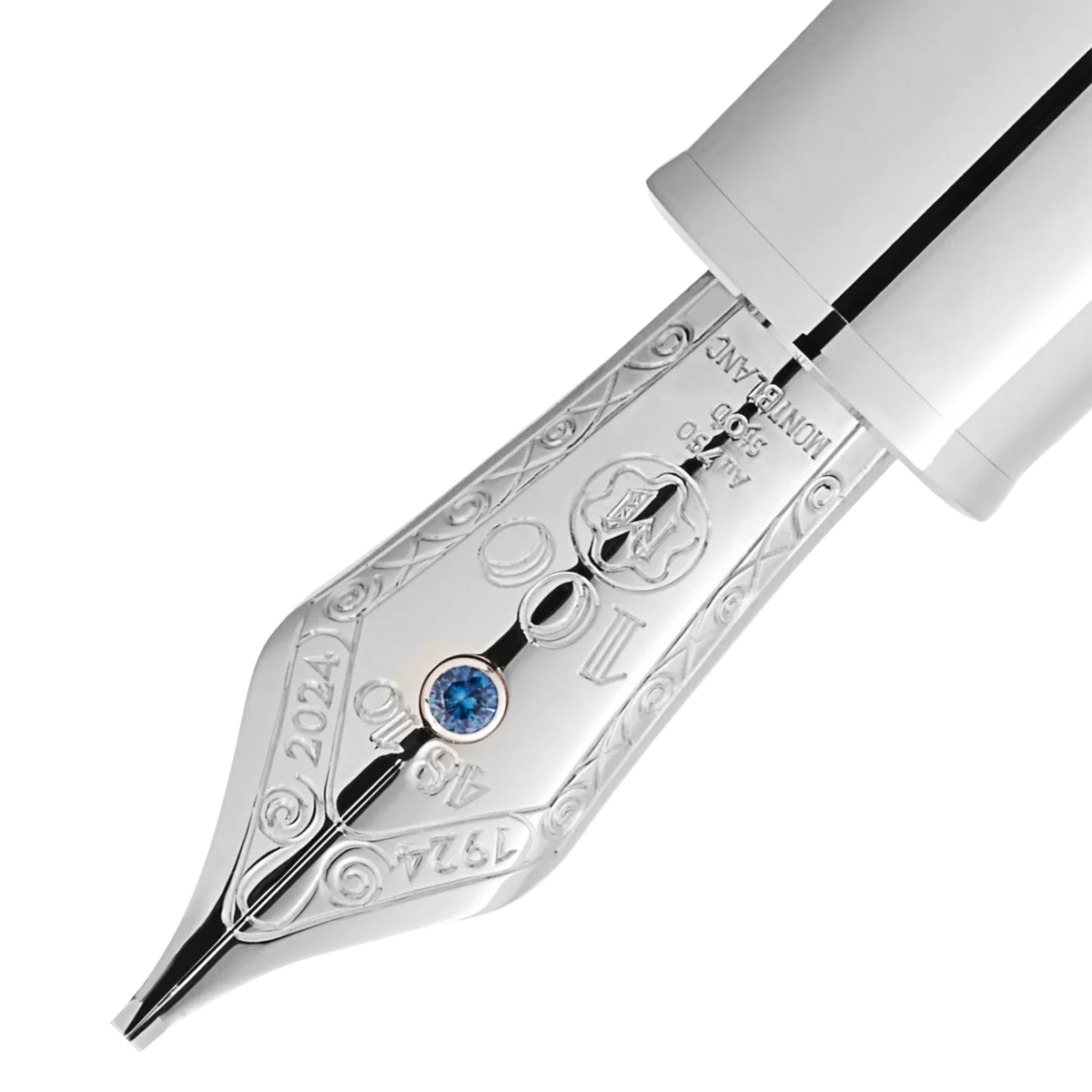 Seit seiner Einführung im Jahr 1924 gilt der Meisterstück von Montblanc weithin als das Nonplusultra unter den edlen Schreibgeräten, das für raffinierten Geschmack und eine kühne Selbstdarstellung steht. Anlässlich des 100-jährigen Jubiläums von Meisterstück erweitert Montblanc sein bestehendes Meisterstück Calligraphy-Programm um eine Limited Edition, die der „Inspire Calligraphy”, der künstlerischsten Form des Schreibens, gewidmet ist. Diese Limited Edition ist aus massivem 750er Weißgold gefertigt und verfügt über eine neue Kalligraphie-Feder und spezielle Handwerkstechniken. Die Italic-Feder ziert stolz die Zahl „100“ sowie die Jahreszahlen „1924“ und „2024“ und ist mit einem Saphir besetzt. Das Design der Kappe und des Schafts ist eine Hommage an die historische Verbindung zwischen Federkielen, Schrift und Ästhetik. Sie sind mit handgefertigten Lackintarsien in einer reichen Palette von Blautönen verziert, die durch Intarsien aus echten Federn, die kunstvoll von Hand eingesetzt wurden, noch verstärkt werden. Die hundertjährigen Kappenringe tragen ebenfalls die Jahreszahlen „1924“ und „2024“. Als Krönung des Schreibgeräts sind winzige Federbarben miteinander verflochten und zu einem Montblanc-Emblem geformt, das unter einer Kuppel aus Bergkristall platziert ist.