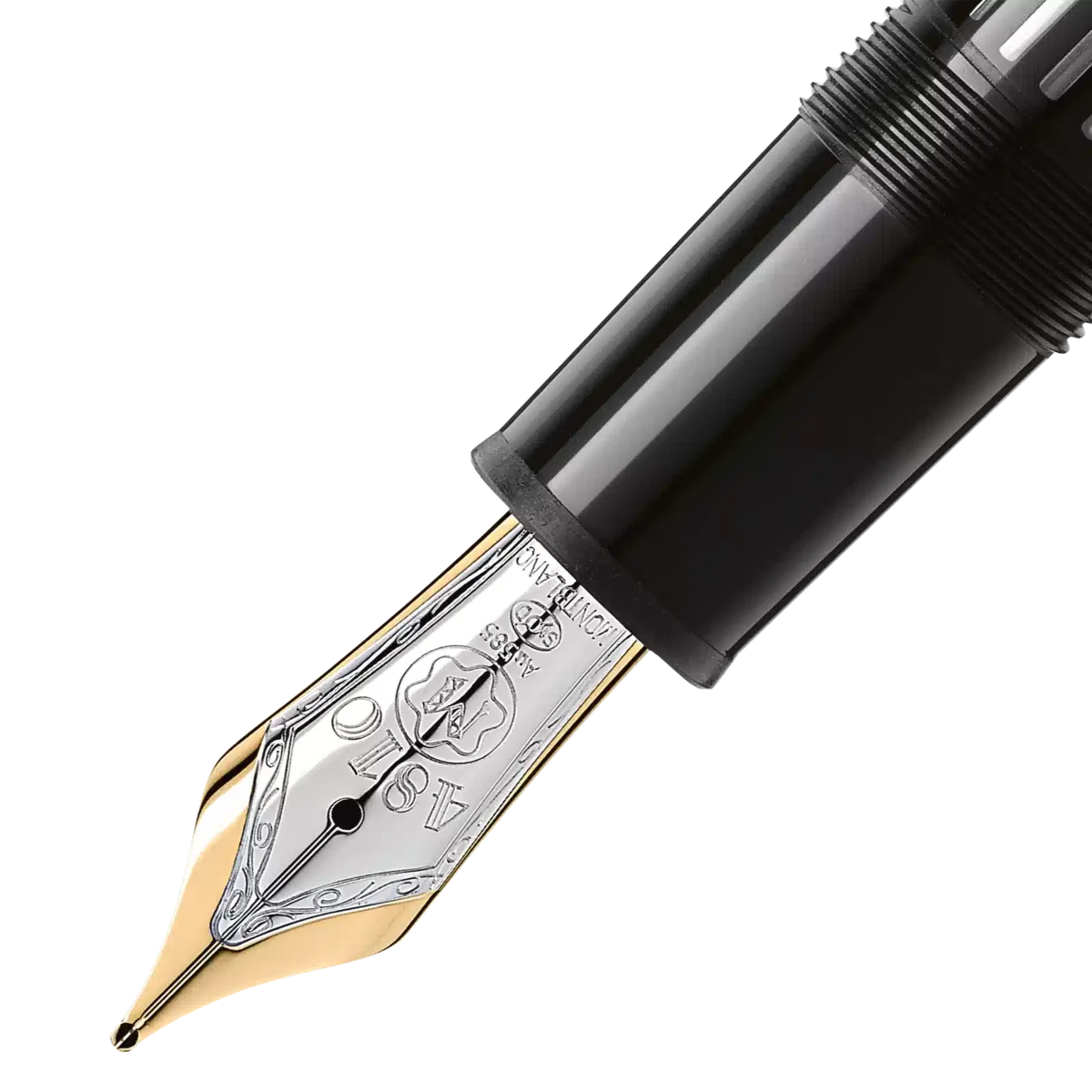 Der Meisterstück LeGrand aus tiefschwarzem Edelharz mit goldbeschichteten Details, gekrönt vom weißen Stern-Emblem und veredelt mit einer handgefertigten Goldfeder, entwickelt sich zur Designikone von Montblanc.