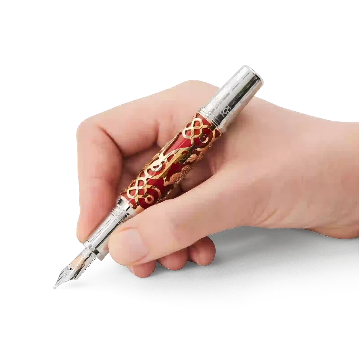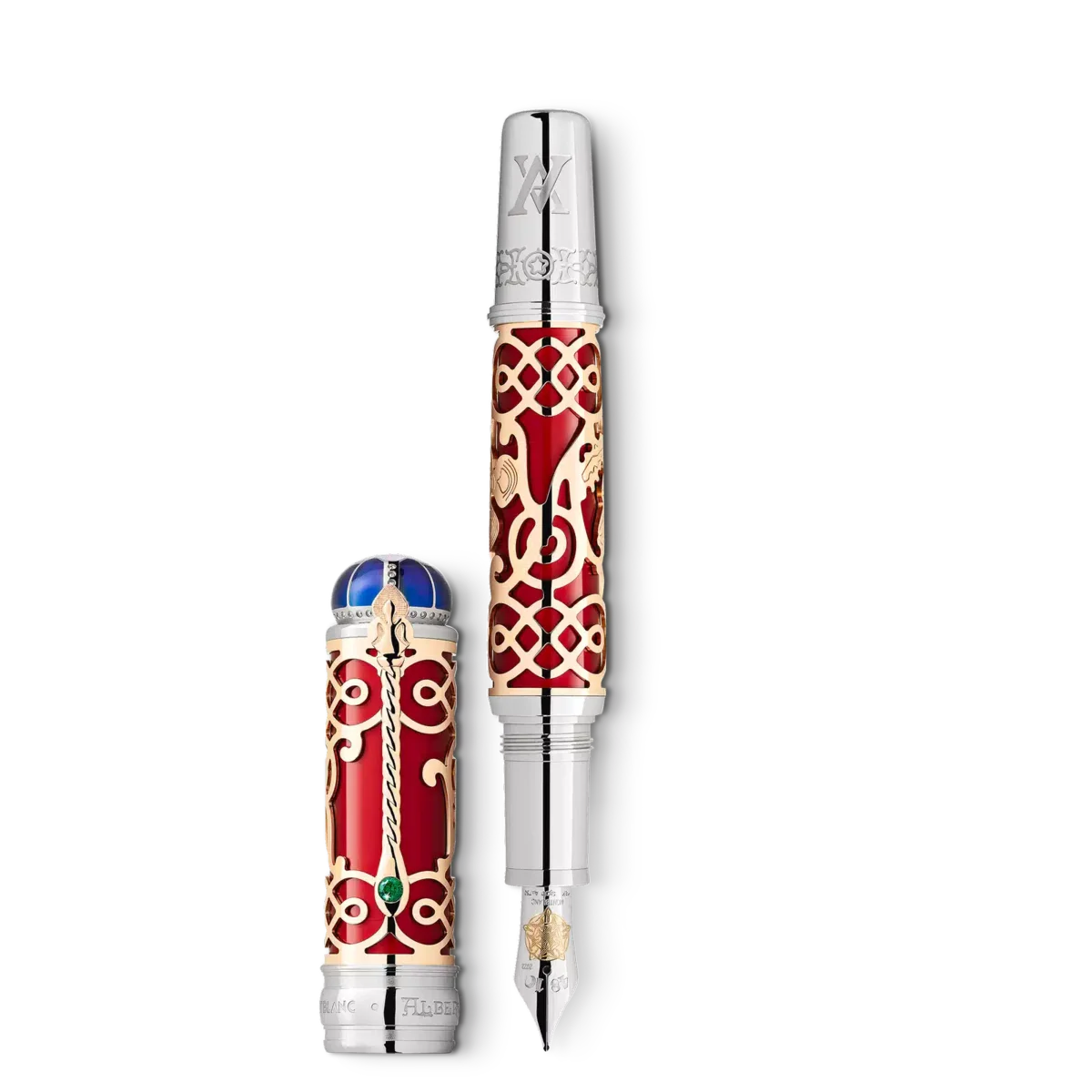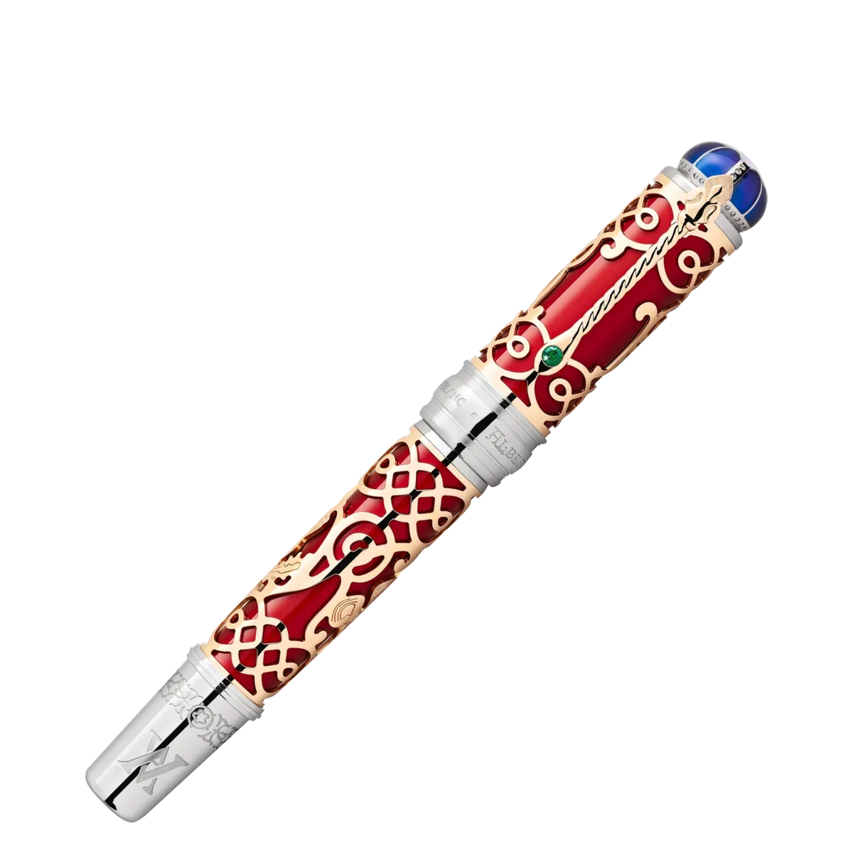 Die Montblanc Patron of Art Edition 2022 ist Königin Victoria und Prinz Albert gewidmet. Die Limited Edition 888 ist eine bemerkenswerte Paar-Edition, wobei eine Edition Königin Victoria und die andere ihren Gemahl Prinz Albert ehrt. Die Montblanc Patron of Art Homage to Victoria Limited Edition 888 feiert Victoria, insbesondere ihren Krönungstag. Der Füllfederhalter verfügt über eine Kappe und einen Schaft aus rotem, transluzentem Lack und eine solide Au 750 / 18K-Signatur-Gold-Skelettüberzug. Das Skelett ist von ihrem Krönungskragen und ihrem Monogramm inspiriert, während das Rot von ihrem Krönungskleid inspiriert ist. Die Beschläge sind platinbeschichtet. Die Form des Clips ist eine Hommage an ihr Zepter, während der grüne Tsavorit eine Hommage an ihren Verlobungsring ist. Die Kappe ist von einer Königskrone inspiriert und mit dem Montblanc-Emblem aus Perlmutt verziert. Während der Kappenring wie ein Ehering die Gravur „Albert” und ihr Hochzeitsdatum trägt, ziert eine besondere Gravur den Konus. Als Hommage an Victorias Spitznamen „England’s Rose” ist die handgefertigte, zweifarbige Feder aus massivem 750er/18 Karat Gold mit einer Rose geprägt. Mit „Signature Gold” und/oder „Signature Gold-Beschichtung” beschreibt Montblanc den edlen Farbton von Gelbgold, der zu einem geschätzten Farbton für die Schreibgeräte des Hauses geworden ist.