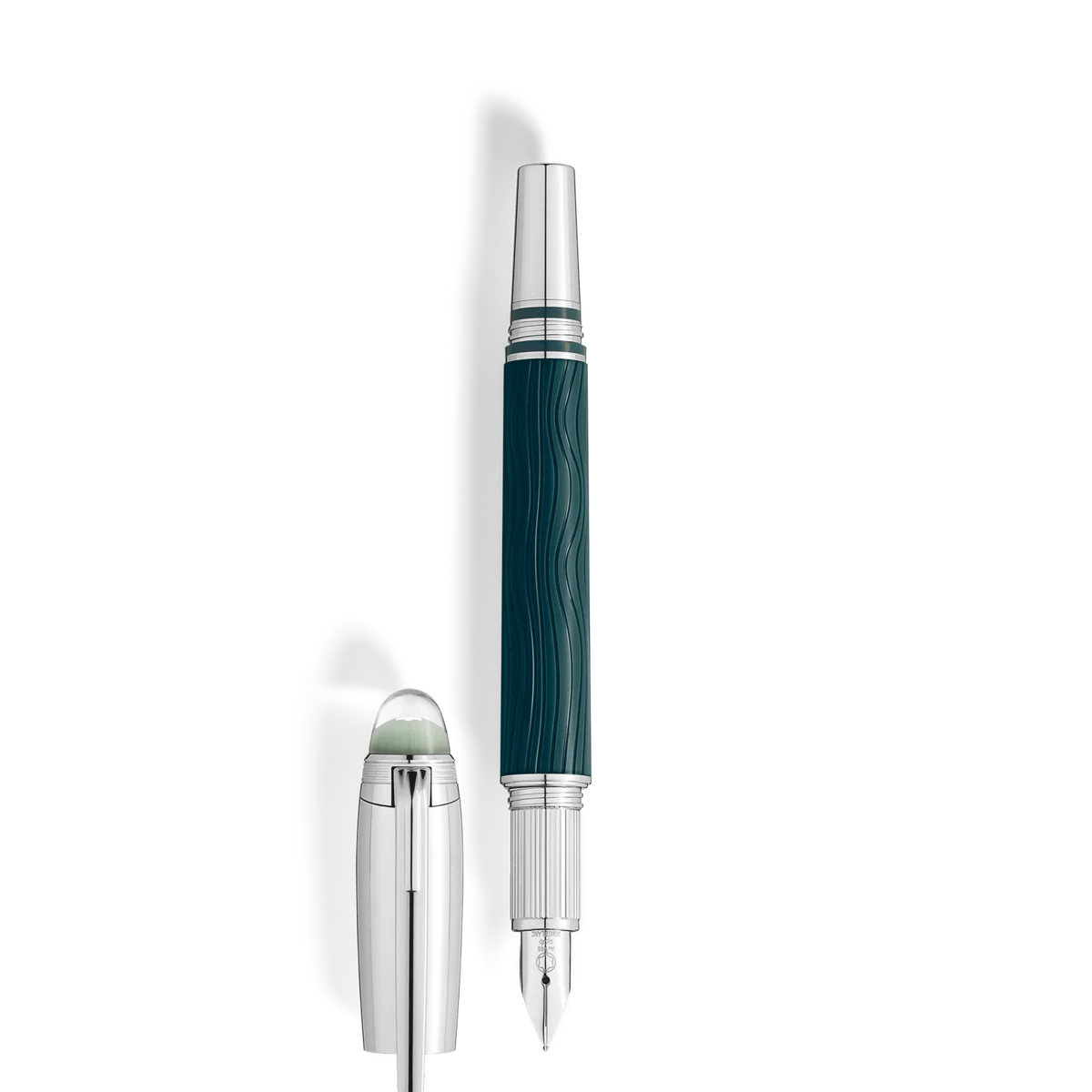 Die StarWalker PolarGreen Kollektion erweckt die Schönheit der Nordlichter zum Leben. Auf der Erde können Menschen zum Himmel blicken und sich in eine Welt voller Wunder entführen lassen, wenn sie dieses großartige Schauspiel beobachten. Die Kuppel auf der Kappe besteht aus transparentem Harz und leuchtet bei schwachem Licht, was an die bezaubernden tanzenden Polarlichter am Nachthimmel erinnert. Die Kappe und die Beschläge sind mit Platin beschichtet. Das Wellenmuster auf dem dunkelgrünen Edelharz des Schafts fängt den spektralen Glanz der Lichter auf bewundernswerte Weise ein, und die matte Oberfläche betont die anmutigen Reflexionen. Die sorgfältig handgefertigte Feder aus 585er/14-karätigem Gold ist mit einer eleganten Rhodiumbeschichtung versehen. Ident-Nr. MB132906 Physikalisches Gewicht 37,25 g Abmessungen 135,7 mm * 14,9 mm