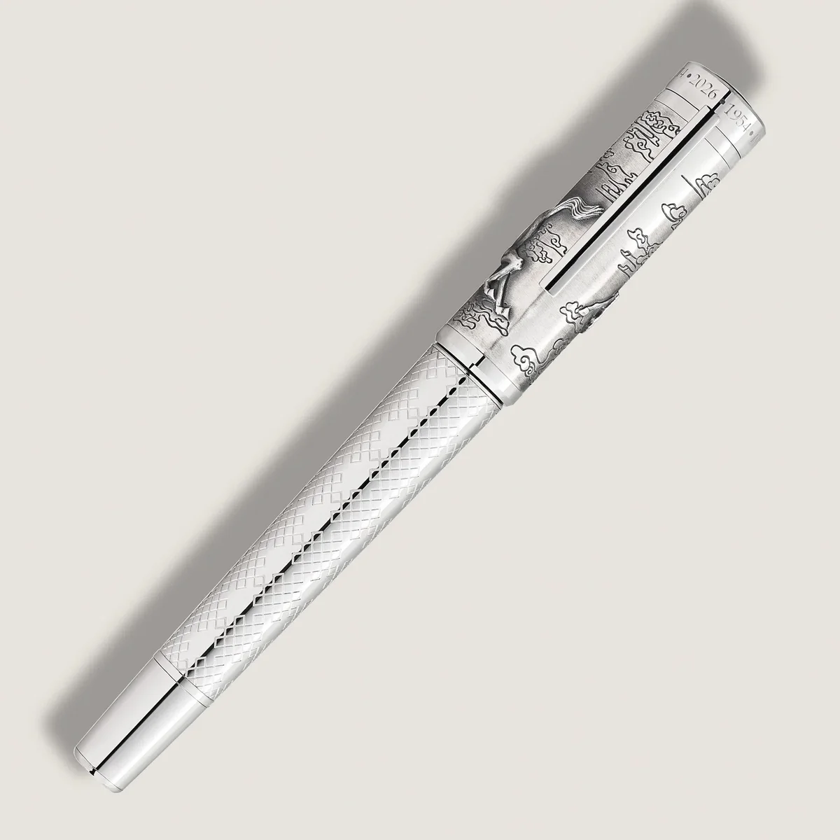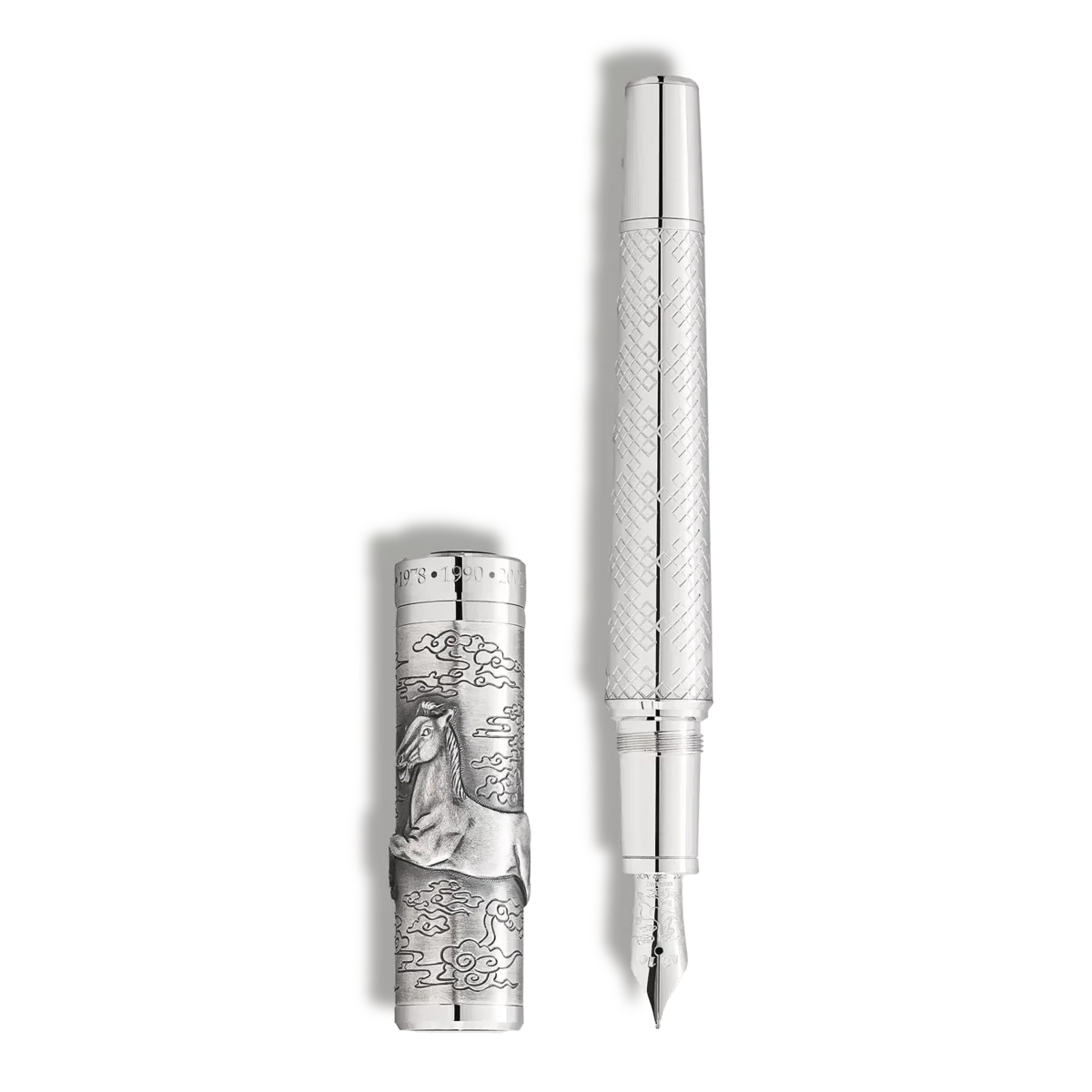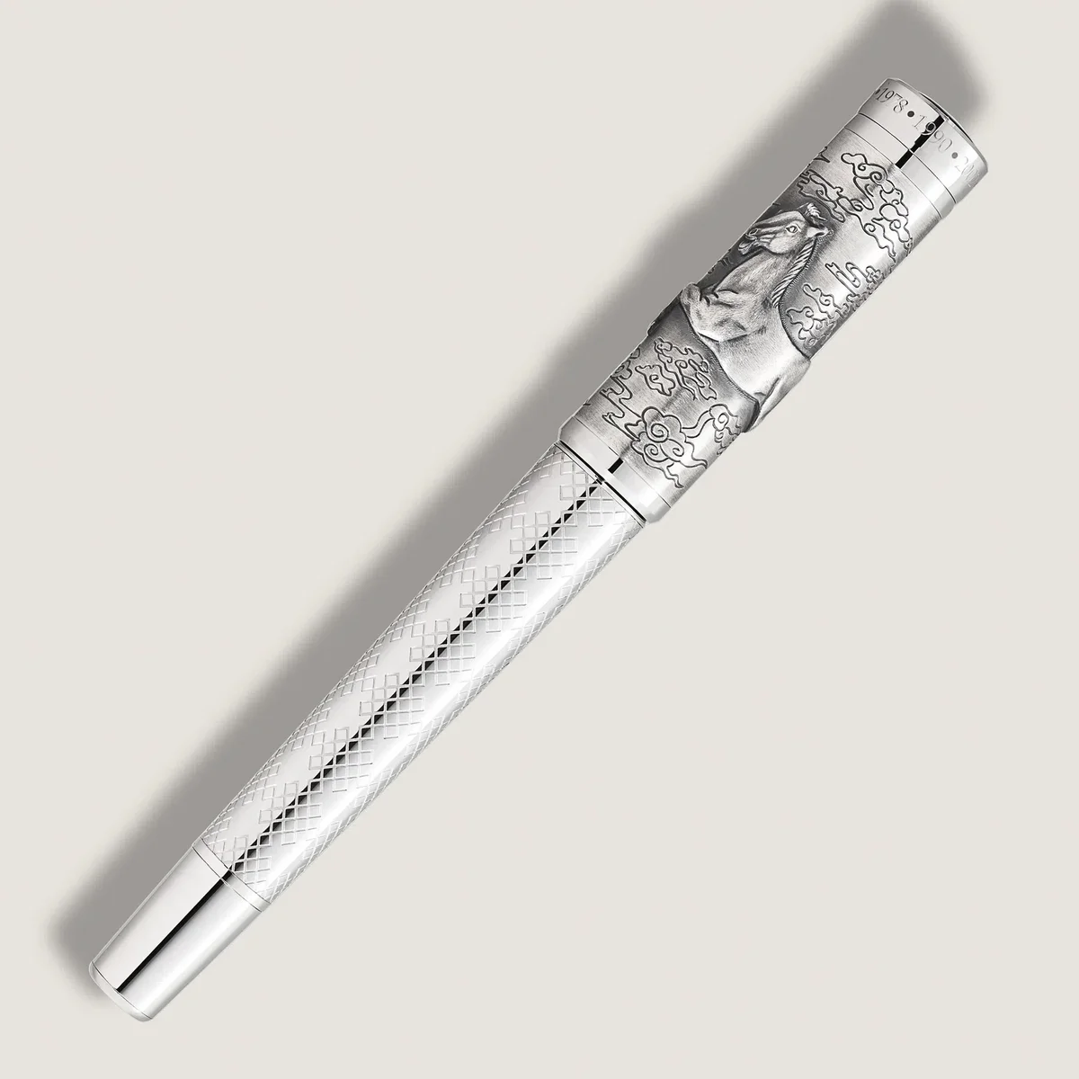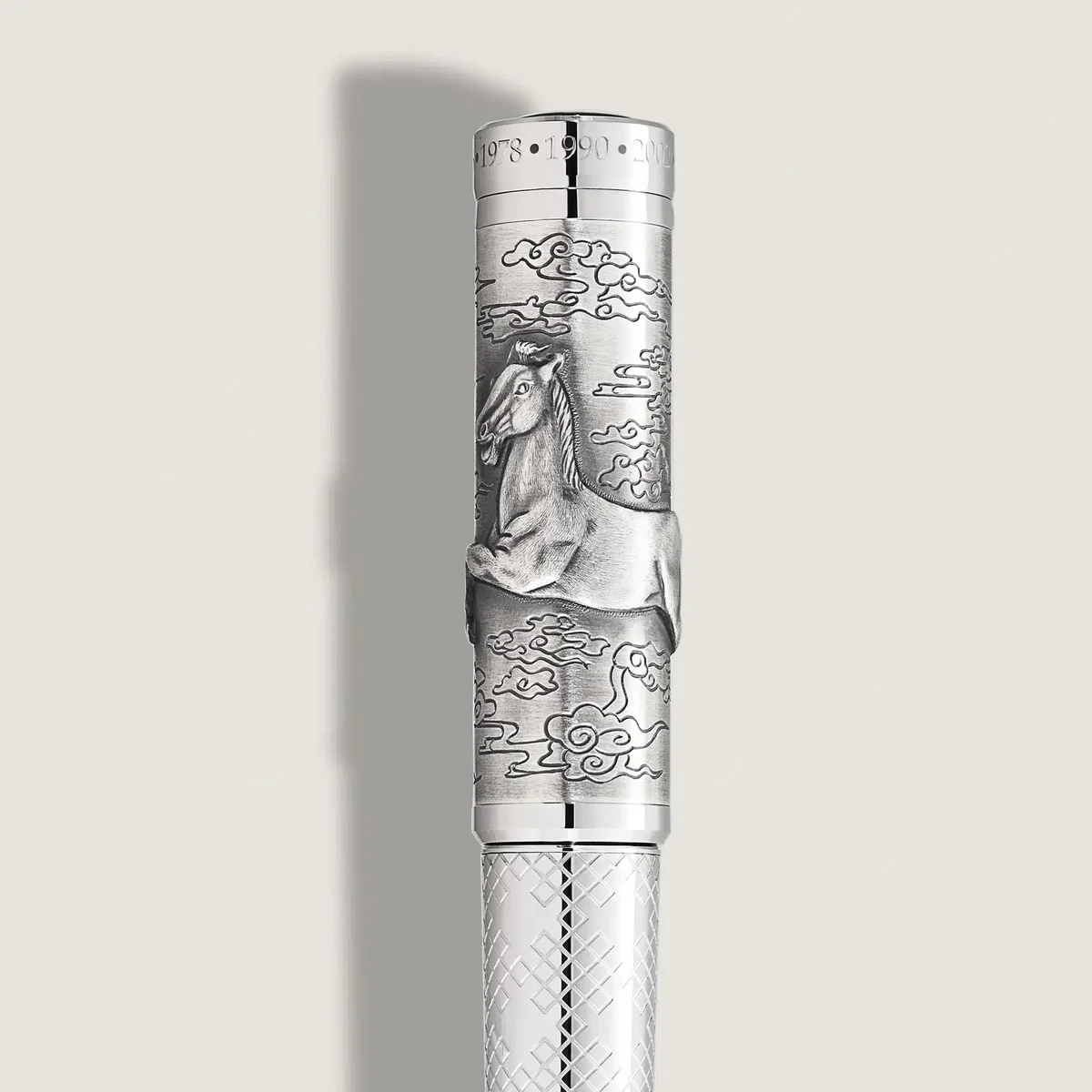 Der Montblanc The Legend of Zodiacs The Horse Limited Edition 512 (8x8x8) ist dem siebten Sternzeichen sowie der Zahl 8 gewidmet, die in asiatischen Kulturen als Glückszahl gilt.Die Kappe besteht aus 925er Sterlingsilber und ist mit einer kunstvoll handgravierten Pferdefigur verziert, die sowohl das Sternzeichen als auch die schnellen, langbeinigen Pferde des alten China ehrt. Diese flinken, wohlproportionierten Tiere, die wie der Wind zu fliegen schienen, wurden „Tianma” – himmlische Pferde – genannt. Früheste Quellen beschreiben sie als Symbol für Positivität und Verheißung. Die Anmut des Tieres wird auf der Kappe durch die zarte Drehung des Kopfes, den typisch chinesischen Haarknoten und den geschmeidigen Gang zum Ausdruck gebracht. Das Pferd ist von fein gravierten Ornamenten umgeben, die von der „Glückswolke” (祥云) inspiriert sind, einem Symbol für Glück in China. Der platinbeschichtete Schaft ist mit einer feinen ornamentalen Gravur verziert, die vom chinesischen Glücksknoten-Symbol „Zhōngguó jié” (中国结) inspiriert ist, während der Konus mit einem Topas verziert ist, der auf den Geburtsstein des Pferdezeichens verweist. Das aktuelle Jahr des Pferdes, 2026, ist neben den sechs vorangegangenen Jahren des Pferdes auf den Kappenring graviert, während die Kappe mit dem Montblanc-Emblem aus Perlmutt gekrönt ist. Das Motiv des fliegenden Pferdes ziert auch die handgefertigte, rhodinierte Feder aus massivem 750er Gold.