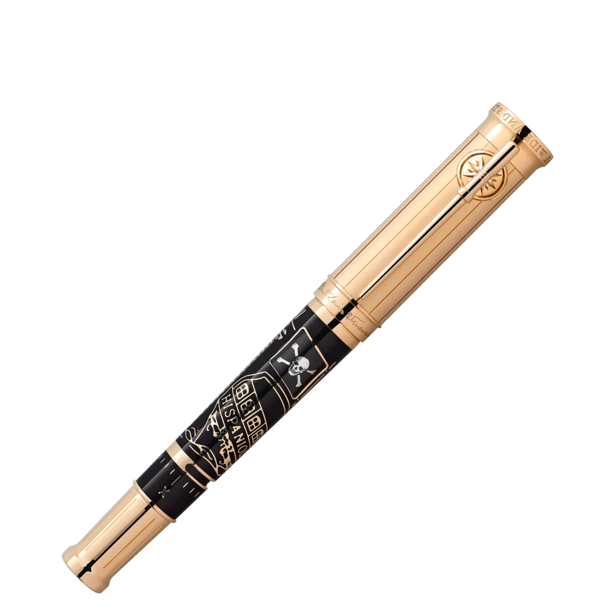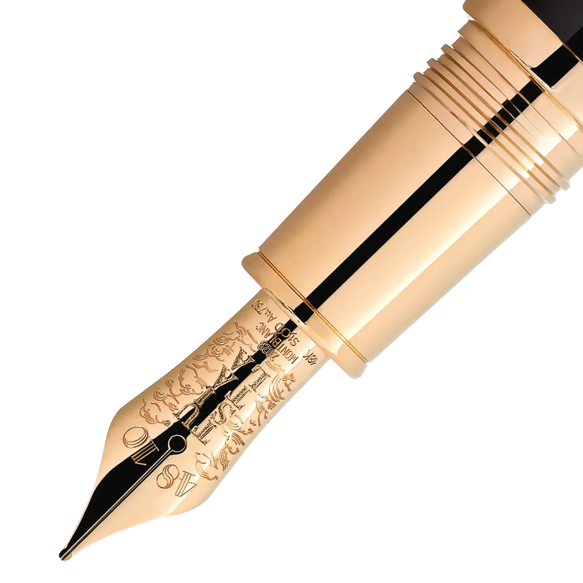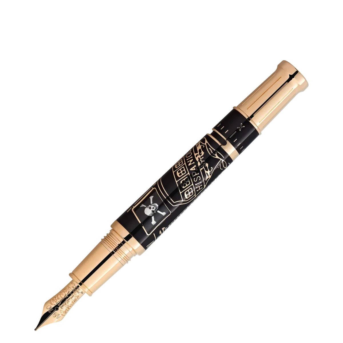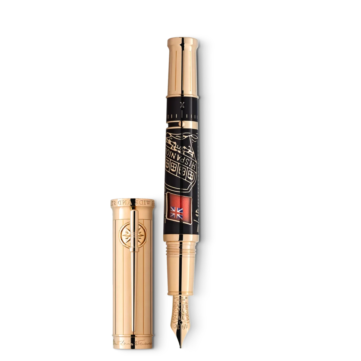 Robert Louis Stevenson, 1850 in Edinburgh, Schottland, geboren, hatte zwei große Wünsche: Freiheit und das Eintauchen in andere Welten. Er verfasste Essays und Reiseberichte sowie seine legendären Abenteuergeschichten, die von markanten Charakteren bevölkert sind, deren Namen Lesern auf der ganzen Welt einen Schauer über den Rücken jagen: Long John Silver, Captain Flint, Jekyll und Hyde. Die Montblanc Writers Edition Homage to Robert Louis Stevenson ist diesem fantasievollen Geschichtenerzähler gewidmet. Der Roman „Die Schatzinsel“ inspirierte viele Designdetails der Edition. Die Gesamtform des Schreibgeräts und die Ringe auf dem Konus vermitteln den Eindruck eines historischen, ausziehbaren Fernrohrs. Diese Edition erzählt die Geschichte von „Die Schatzinsel“ nach und zeigt die berühmte Hispaniola auf dem Schaft, eingefasst in kostbaren schwarzen Lack. Die Hispaniola begibt sich auf eine Reise und hisst eine britische Flagge, die hinter einem kleinen Fenster zu sehen ist. In Anlehnung an die Handlung der Meuterei der Piraten kann die Flagge mit einem kleinen Knopf gedreht werden, um eine Piratenflagge zu enthüllen. Vertikale Linien, die an die Planken des Schoners „Hispaniola“ und eine traditionelle Seekiste erinnern, zieren die charakteristische goldbeschichtete Kappe. Hinter dem charakteristischen goldbeschichteten Clip laufen die Linien in einer Kompassrose zusammen, während der Clip die Form eines Belaying-Pins imitiert, an dem die Leinen der Takelage eines Schiffes befestigt würden. Die Kappe wird von dem Montblanc Emblem aus Perlmutt gekrönt. Der Kappenring ist mit einer Gravur von Stevensons Unterschrift verziert. Als Hinweis auf Robert Louis Stevensons Leidenschaft für die Seefahrt und seine Neuansiedlung in der Südsee sind auf der handgefertigten Feder aus massivem 750er Gold Wolken, Möwen und der Titel „Tusitala” eingraviert, den die Samoaner dem großen Schriftsteller und Weltreisenden gaben.Mit „Signature Gold“ und/oder „Signature Gold-Beschichtung“ beschreibt Montblanc den edlen Farbton von Gelbgold, der zu einem geschätzten Farbton für die Schreibgeräte des Hauses geworden ist.