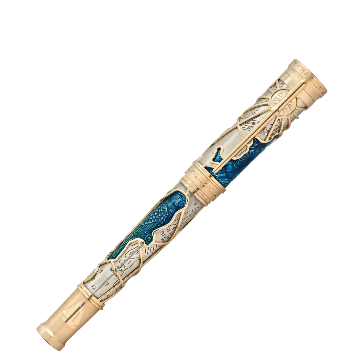 Robert Louis Stevenson, 1850 in Edinburgh, Schottland, geboren, hatte zwei große Wünsche: Freiheit und das Eintauchen in andere Welten. Er verfasste Essays und Reiseberichte sowie seine legendären Abenteuergeschichten, die von markanten Charakteren bevölkert sind, deren Namen den Lesern auf der ganzen Welt einen Schauer über den Rücken jagen: Long John Silver, Captain Flint, Jekyll und Hyde. Die Montblanc Writers Edition Homage to Robert Louis Stevenson ist diesem fantasievollen Geschichtenerzähler gewidmet. Der Roman „Die Schatzinsel“ inspirierte viele Designdetails der Edition. Die Gesamtform des Schreibgeräts und die Ringe auf dem Konus vermitteln den Eindruck eines historischen, ausziehbaren Fernrohrs. Eine der gefährlichsten Figuren an Bord der Hispaniola ist Long John Silver, der auf der Kappe als handgravierte, mit Lack ausgefüllte Figur verewigt ist. Long John Silvers treuer Papagei Captain Flint ist ebenfalls als handgravierte, mit Degradé-Lack überzogene Figur in das Gitter eingebettet. Um den oberen Ring der Kappe herum befindet sich die erste Zeile des Requiems, das Stevenson für sich selbst geschrieben hat: „UNDER THE WIDE AND STARRY SKY” (Unter dem weiten und sternenklaren Himmel). Die Schrift ist spiegelverkehrt und erinnert an das Thema der Dualität in Stevensons Roman „Der seltsame Fall des Dr. Jekyll und Mr. Hyde”. Der mit Gelbgold überzogene Clip imitiert die Form eines Belaying-Pins, an dem die Takelage auf einem Schiff wie der Hispaniola befestigt ist. Hinter dem Clip sowie auf dem Schaft dieser Edition ist eine stilisierte Kompassrose in das massive Au 750 Gelbgoldgitter eingearbeitet. Stevensons handgezeichnete Schatzkarte, die Ausgangspunkt und Mittelpunkt des gesamten Romans ist, ist in den Schaft aus 925er Sterlingsilber eingraviert. Die Feder besteht aus zwei Elementen: dem Wort „Tusitala“ – ein Name, den die Samoaner Stevenson gaben und der übersetzt „Geschichtenerzähler“ bedeutet – und Palmblättern, die Stevensons Ankunft auf Samoa, seiner geliebten Pazifikinsel, symbolisieren.