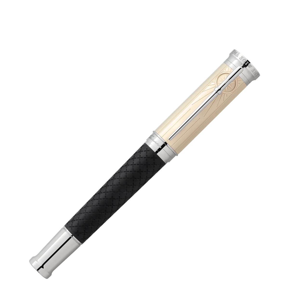 Robert Louis Stevenson, 1850 in Edinburgh, Schottland, geboren, hatte zwei große Wünsche: Freiheit und das Eintauchen in andere Welten. Er verfasste Essays und Reiseberichte sowie seine legendären Abenteuergeschichten, die von markanten Charakteren bevölkert sind, deren Namen den Lesern auf der ganzen Welt einen Schauer über den Rücken jagen: Long John Silver, Captain Flint, Jekyll und Hyde. Die Montblanc Writers Edition Homage to Robert Louis Stevenson ist diesem fantasievollen Geschichtenerzähler gewidmet. Der Roman „Die Schatzinsel“ inspirierte viele Designdetails der Edition. Die Gesamtform des Schreibgeräts und die Ringe auf dem Konus vermitteln den Eindruck eines historischen, ausziehbaren Fernrohrs. Der schwarze Schaft aus Edelharz ist mit eingravierten Kreuzen verziert, darunter ein größeres „X“, wie es die Position des Schatzes auf einer Karte markiert. Vertikale Linien, die an die Planken des Schoners „Hispaniola“ und eine traditionelle Seekiste erinnern, zieren die Kappe der Writers Edition. Hinter dem platinbeschichteten Clip laufen die Linien in einer Kompassrose zusammen, während der Clip die Form eines Belaying-Pins imitiert, an dem die Leinen der Takelage eines Schiffes befestigt würden. Die Kappe wird von dem Montblanc-Emblem gekrönt, das mit dem Symbol der Piraten, einem Totenkopf mit gekreuzten Knochen, verziert ist, der in der Mitte hervorgehoben ist. Der Kappenring ist mit einer Gravur von Stevensons Unterschrift neben dem Erscheinungsdatum seines ersten Werks „The Pentland Rising“ aus dem Jahr 1866 verziert. Die Daten 1850–1894 sind auf der Kappe eingraviert, um an das Leben von Robert Louis Stevenson zu erinnern.