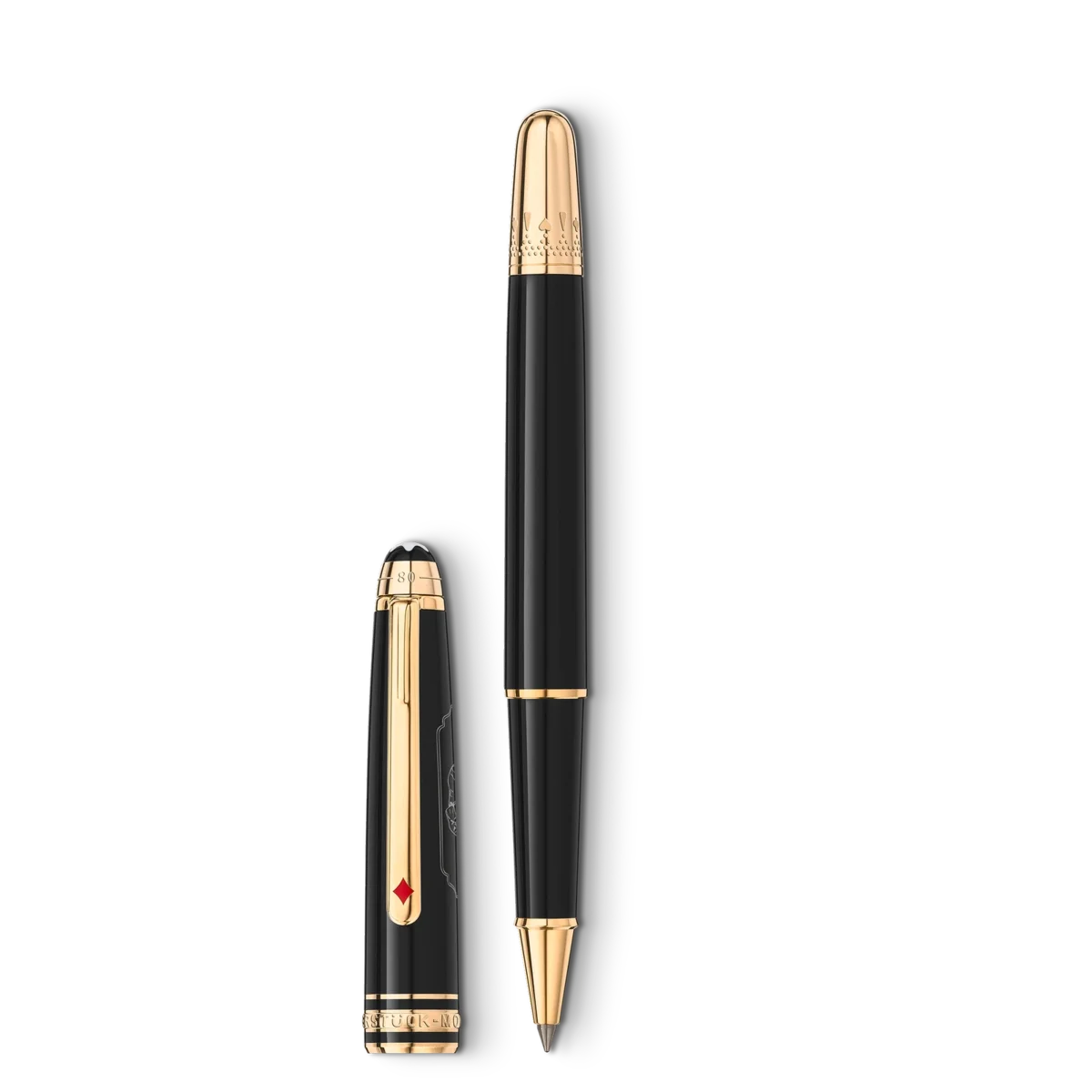 Die Kollektion Meisterstück Around the World in 80 Days ist vom berühmten Abenteuerroman von Jules Verne inspiriert. Der Classique Rollerball aus anthrazitfarbenem Edelharz greift die zweite Etappe der Reise von Bombay nach Yokohama auf. Die Hauptfiguren reisen in diesem Teil des Abenteuers auf einem majestätischen Elefanten, der in einer Kartusche auf der Kappe abgebildet ist. Der Clip ist mit einem rot lackierten Diamant-Kartensymbol verziert, und auf dem Konus sind ein Muster und Kartensymbole eingraviert, die Mr. Foggs Wette symbolisieren, die Reise in 80 Tagen zu schaffen. Auf der Kappe ist die Länge der Reise eingeprägt: 25 Tage von Bombay nach Yokohama und insgesamt 80 Tage.