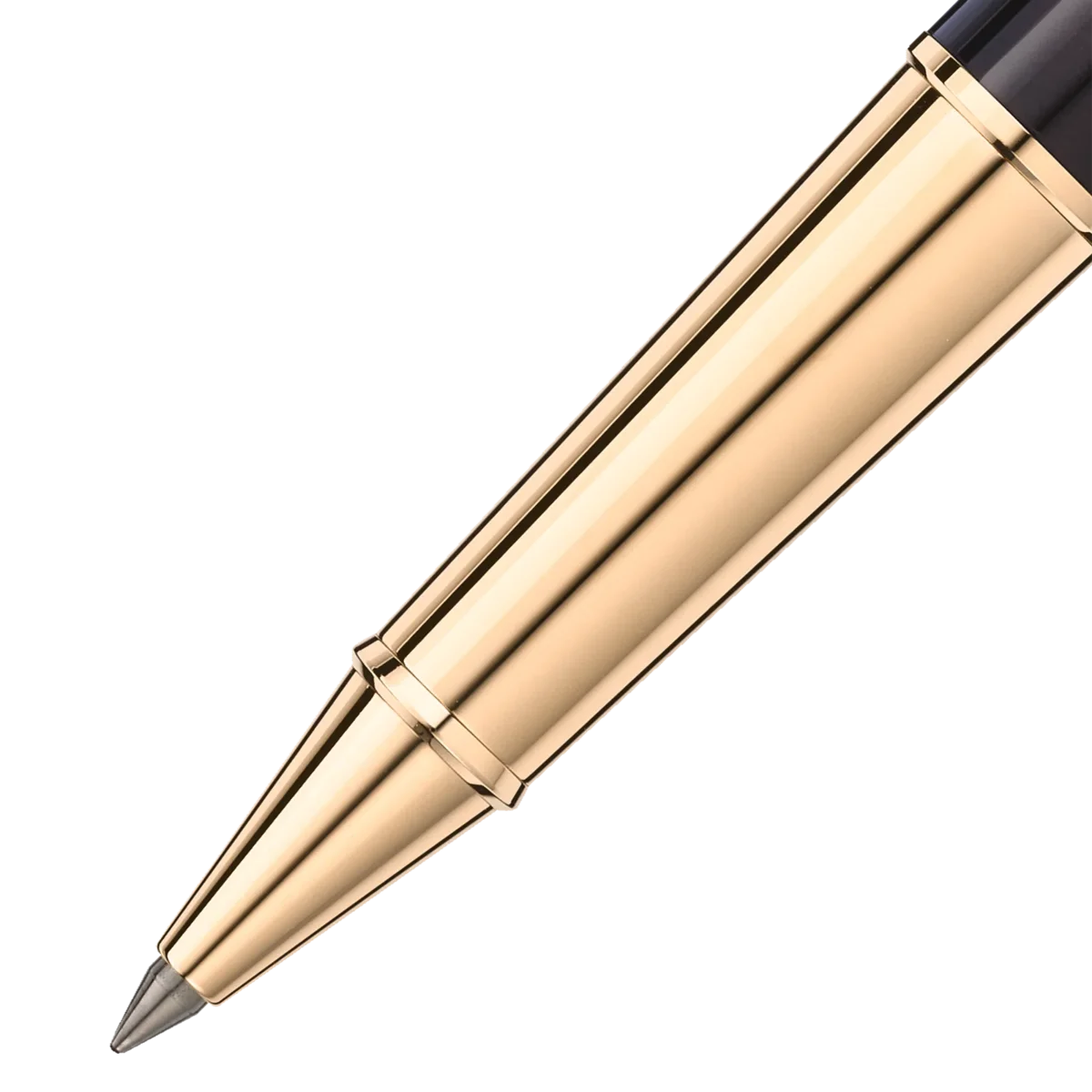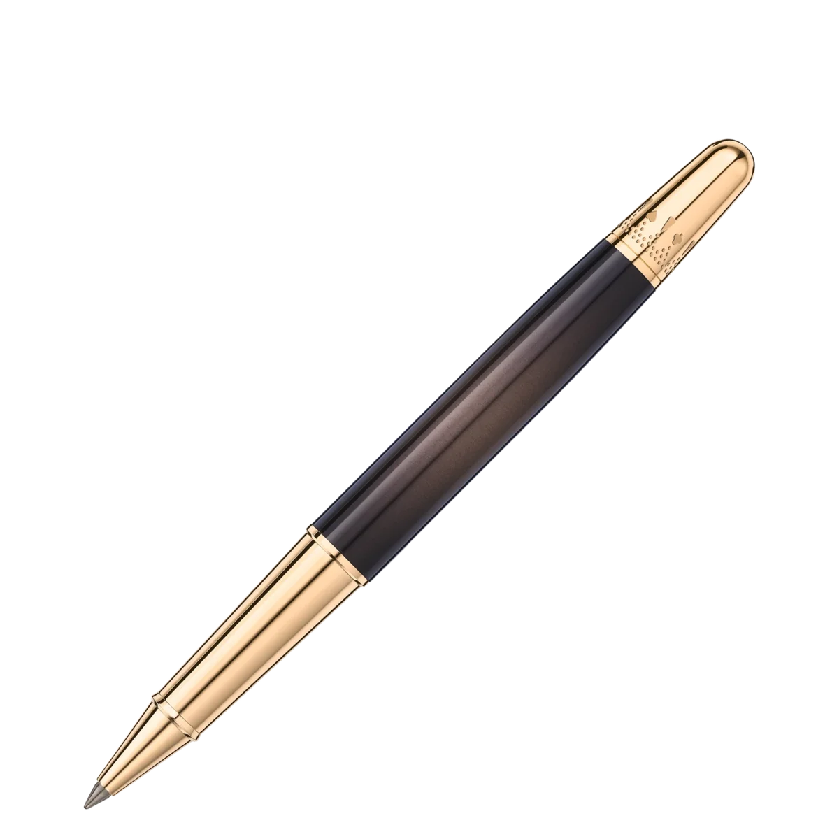 Die Kollektion „Meisterstück Around the World in 80 Days“ ist vom berühmten Abenteuerroman von Jules Verne inspiriert. Der Doué Classique Rollerball mit goldbeschichteter Metallkappe und anthrazitfarbenem Lackgehäuse greift die zweite Etappe der Reise von Bombay nach Yokohama auf. Die Hauptfiguren reisen in diesem Teil des Abenteuers auf einem majestätischen Elefanten, der auf einer Kartusche auf der Kappe abgebildet ist. Die Kappe aus goldbeschichtetem Metall ist mit einem eingravierten Muster verziert, das Glück symbolisiert. Der Clip ist mit einem rot lackierten Diamanten-Kartensymbol verziert, und auf dem Konus sind ein Muster und Kartensymbole eingraviert, die Mr. Foggs Wette symbolisieren, die Reise in 80 Tagen zu schaffen. Auf der Kappe ist die Länge der Reise eingeprägt: 25 Tage von Bombay nach Yokohama und insgesamt 80 Tage.
