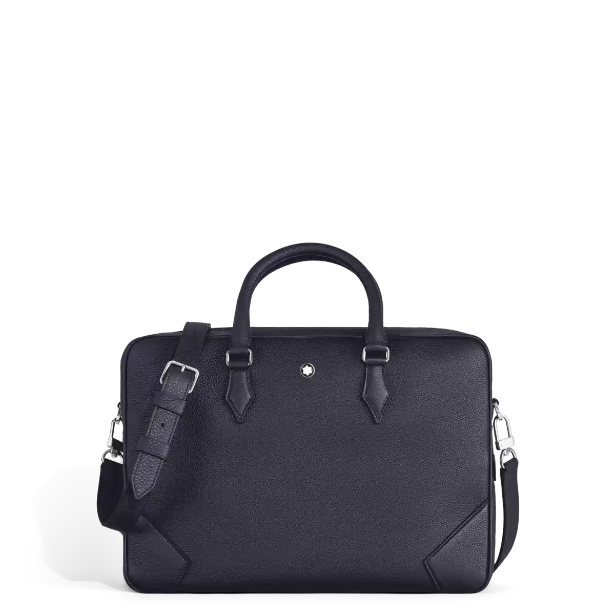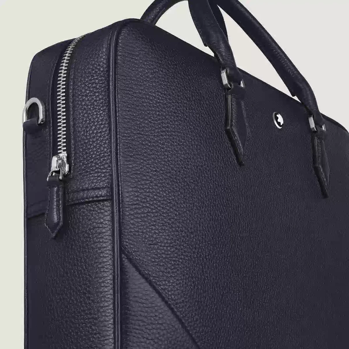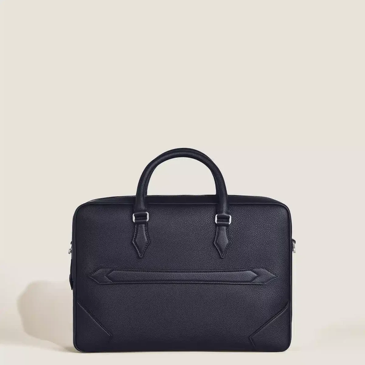 Diese elegante Dokumententasche ist aus weichem, körnigem Leder in tiefem Mitternachtsblau gefertigt. Ihre spitzenförmigen Details wie Nähte, Reißverschlusszüge und Griffe sind von der Kultur des Schreibens inspiriert. Ein abnehmbarer Riemen und ein Satellitensystem ermöglichen verschiedene Trageoptionen, während Innentaschen für zusätzliche Organisation auf Geschäftsreisen sorgen.