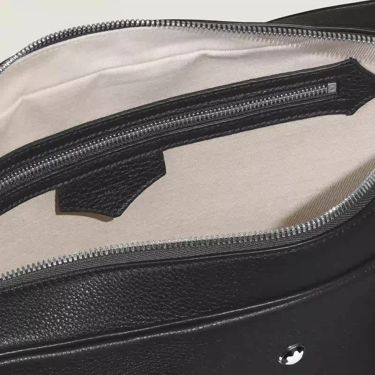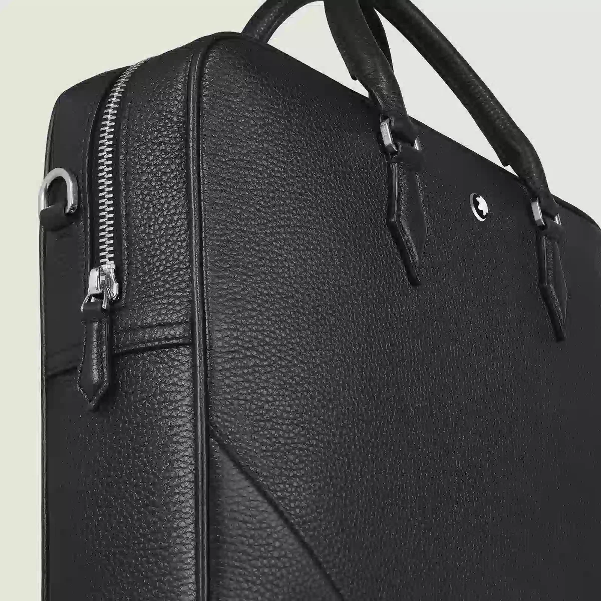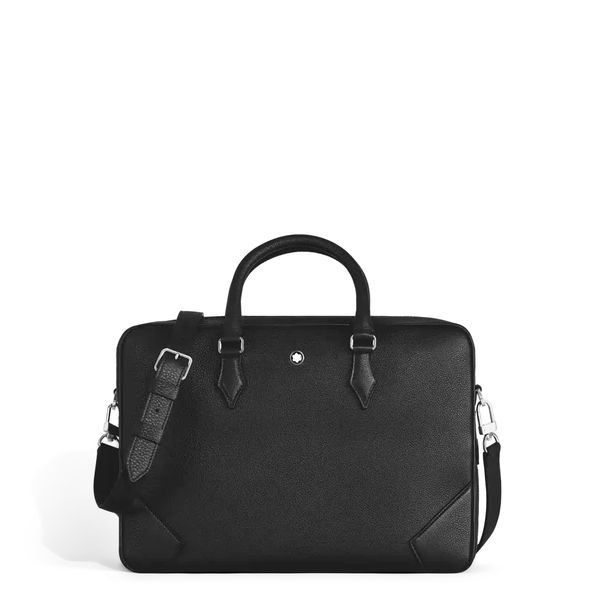 Diese elegante Dokumententasche ist aus weichem, elegantem schwarzem Leder gefertigt. Ihre spitzenförmigen Details wie Nähte, Reißverschlusszüge und Griffe sind von der Kultur des Schreibens inspiriert. Ein abnehmbarer Riemen und ein Satellitensystem ermöglichen verschiedene Trageoptionen, während Innentaschen für zusätzliche Organisation auf Geschäftsreisen sorgen.