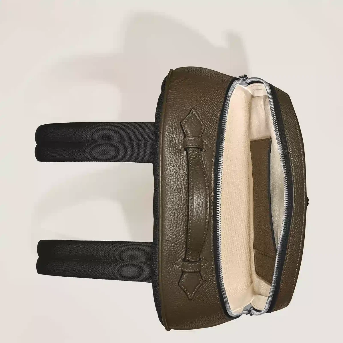 Dieser luxuriöse Rucksack aus khakifarbenem Leder ist ein eleganter Begleiter für den täglichen Weg zur Arbeit oder kurze Geschäftsreisen. Er ist aus genarbtem Leder gefertigt, hat weiche Formen und verfügt über charakteristische Details wie Reißverschlüsse in Federform und raffinierte Nähte. Zu den vielseitigen Trageoptionen gehören verstellbare Schultergurte und ein Satellitensystem zur einfachen Befestigung an größerem Gepäck. Das geräumige Hauptfach ist für eine übersichtliche Organisation konzipiert und verfügt über ein gepolstertes Fach für Laptops bis zu 13 Zoll, eine offene Tasche und eine Stifthalterung, um kleinere wichtige Utensilien griffbereit zu haben.