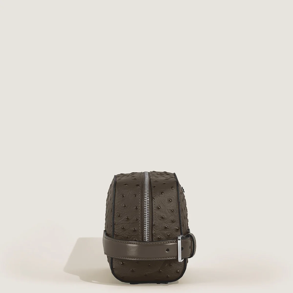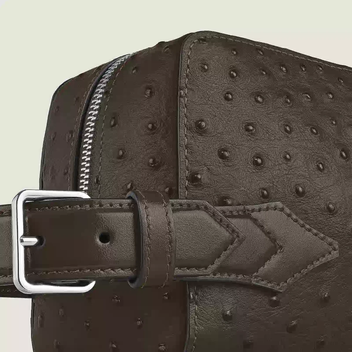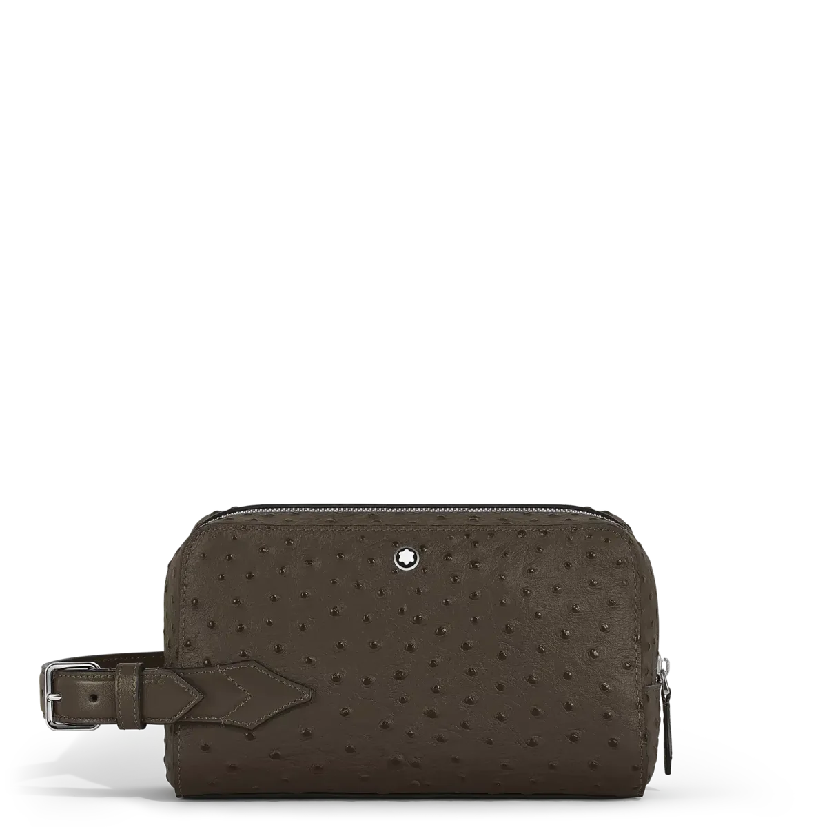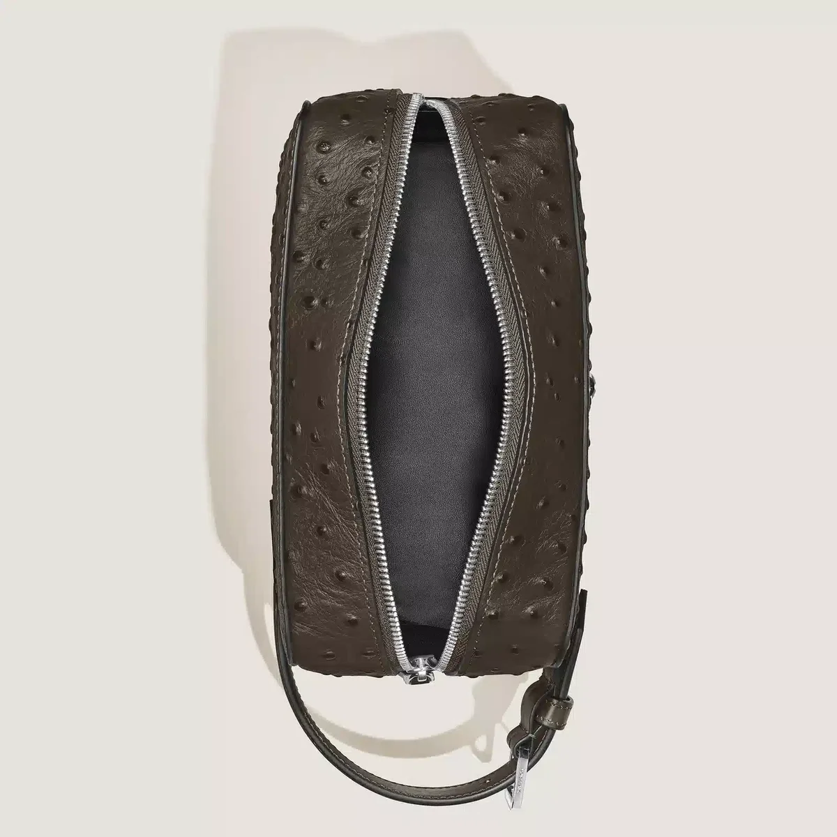 Die neue Clutch-Tasche, deren Kernstück die Kunst des Schreibens ist, wurde aus stilvollem, khakifarbenem Leder mit Straußenprägung gefertigt. Die Eckdetails verleihen dem Design eine unverwechselbare und raffinierte Note. Sie hat die perfekte Größe für die wichtigsten Alltagsgegenstände und verfügt über ein Hauptfach mit einer offenen Tasche und einem abnehmbaren Handgelenkriemen, wodurch sie Eleganz mit vielseitiger Funktionalität verbindet.
