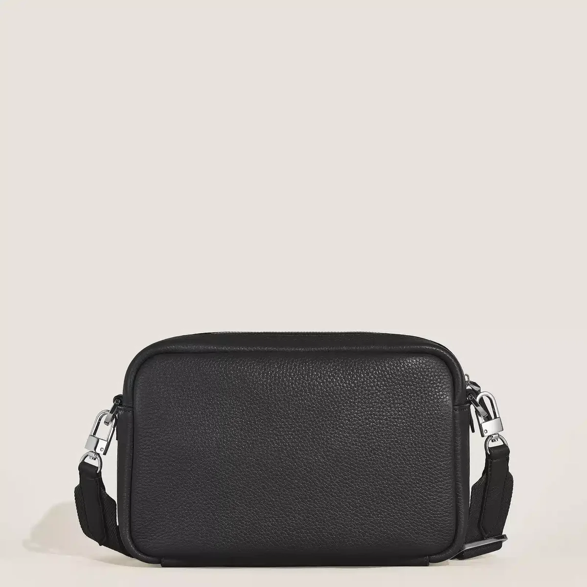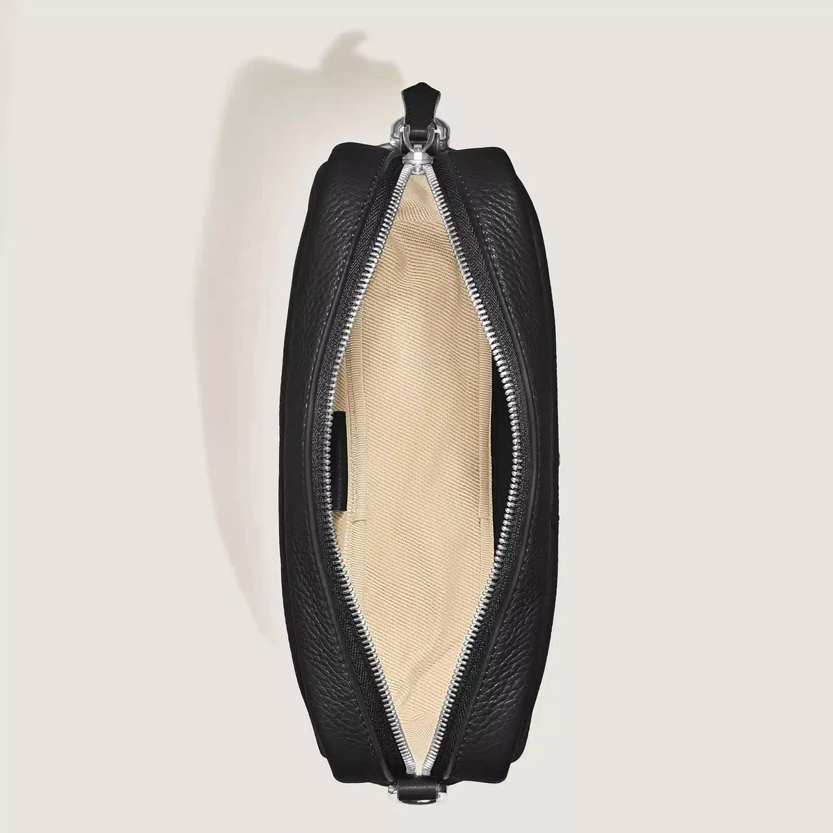 Diese kleine Umhängetasche aus schwarzem genarbtem Kalbsleder hat eine rechteckige Silhouette, die durch Meisterstück-Lederdetails wie einen auffälligen Reißverschlusszieher in Form einer Feder und raffinierte Sattelnaht, die an die Spuren eines Füllfederhalters erinnert, ergänzt wird. Die Tasche ist auf Praktikabilität ausgelegt und verfügt über ein Hauptfach mit einer offenen Tasche und zwei Stifthaltern, während ein abnehmbarer, verstellbarer Schultergurt vielseitige Trageoptionen mit mühelosem Stil bietet.